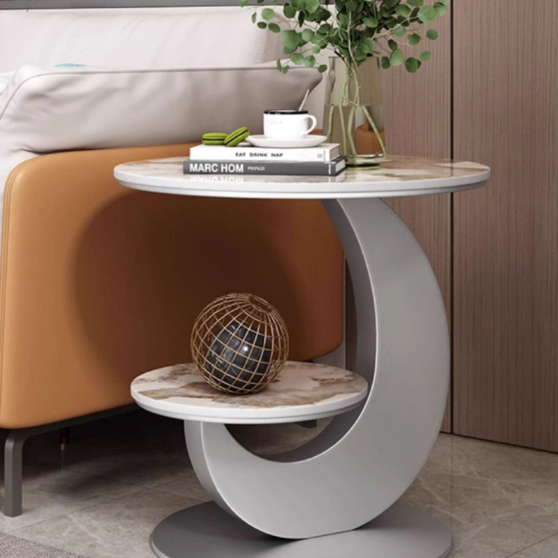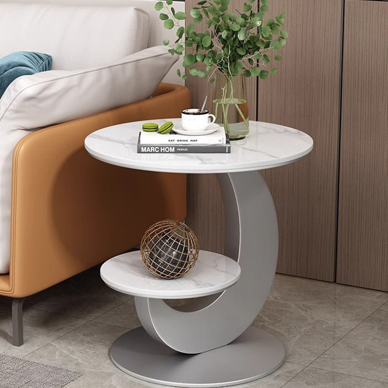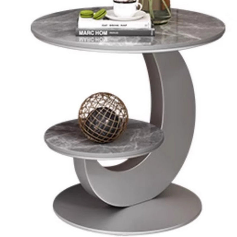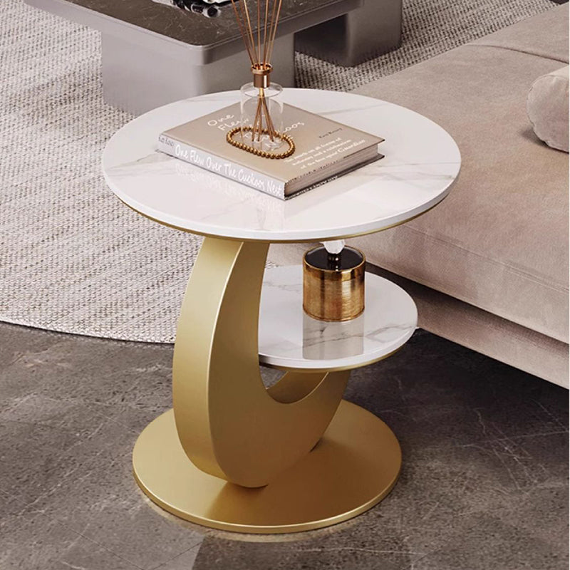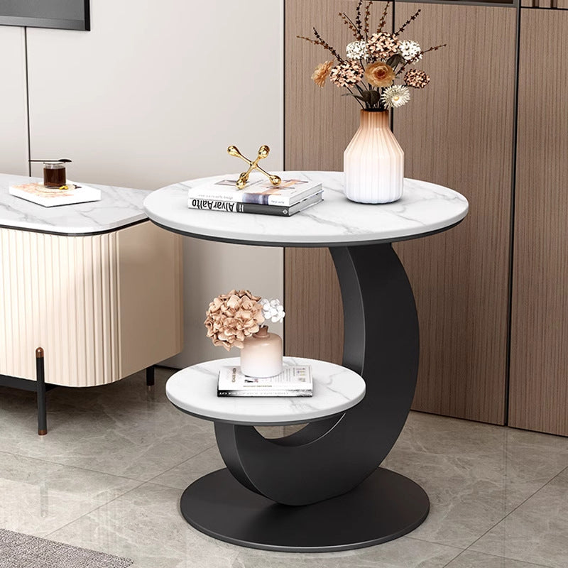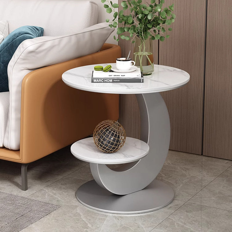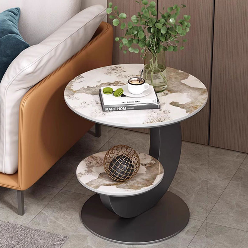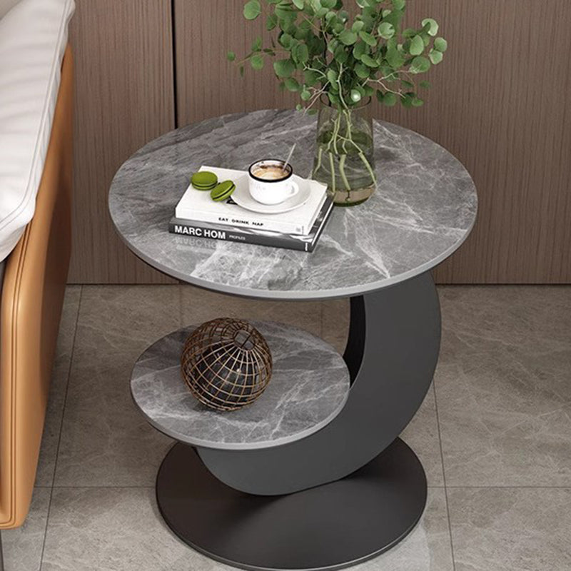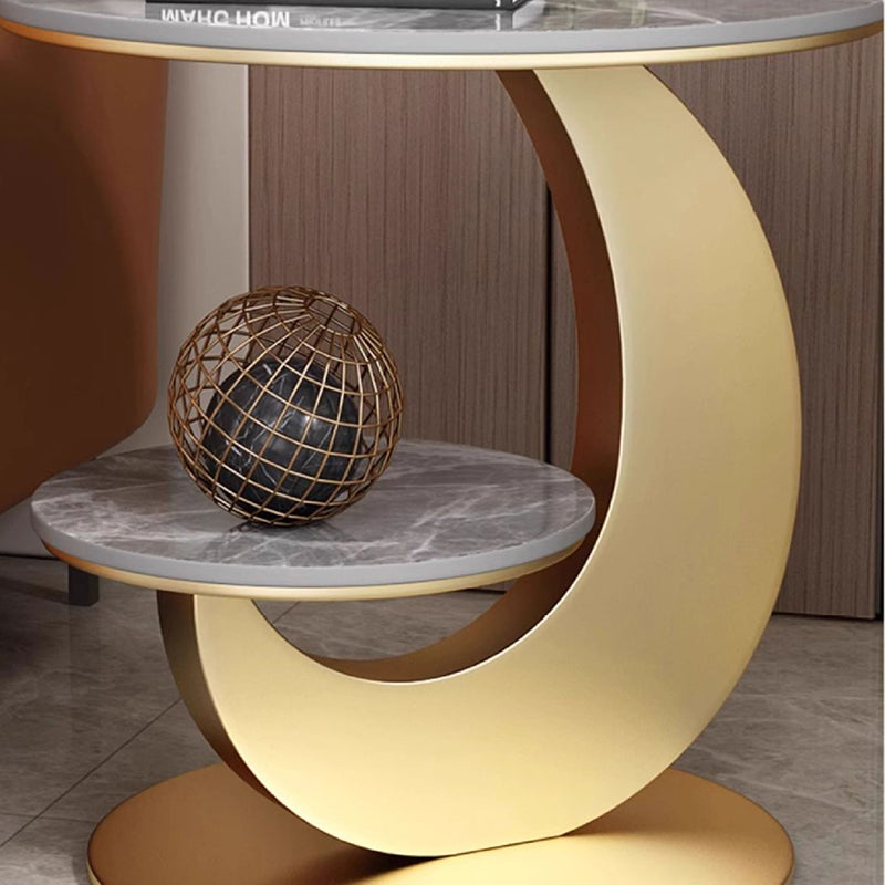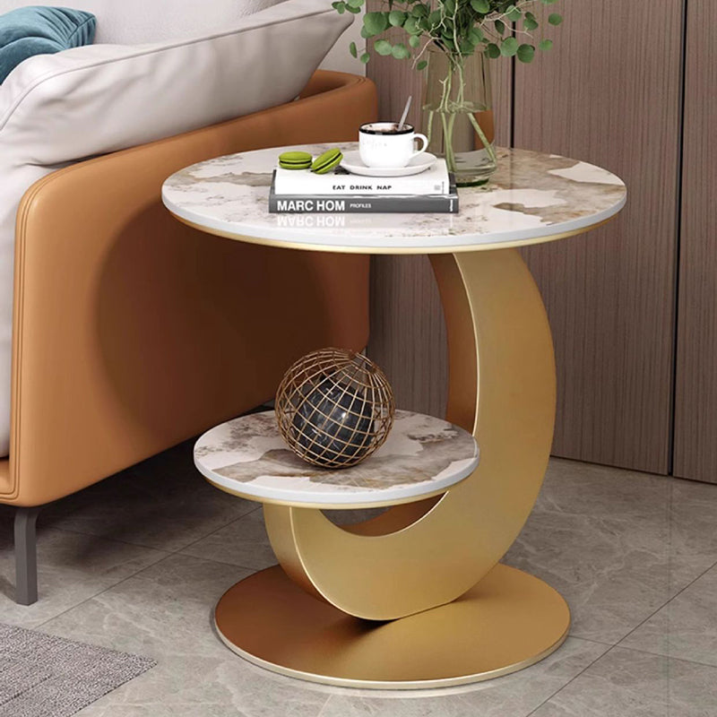 This modern luxury coffee table features a smooth sintered stone top with engineered wood (particleboard) support and a sturdy metal frame. Its elegant round curved design includes a two-tier structure for organized storage, offering refined texture, stability, and contemporary style in gold, black, or gray finishes - perfect for upscale living rooms.