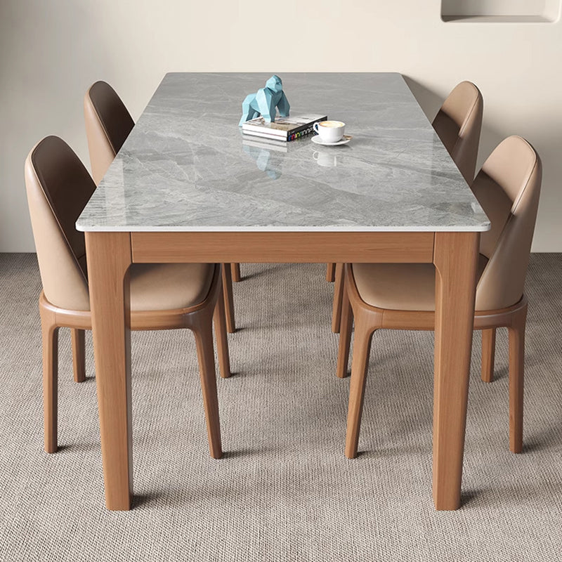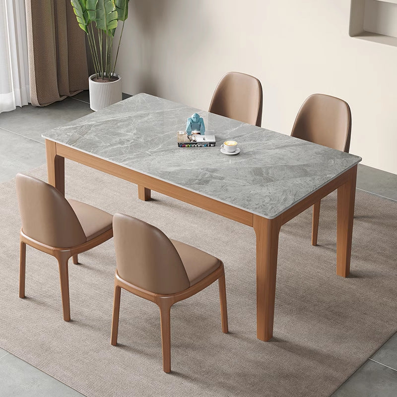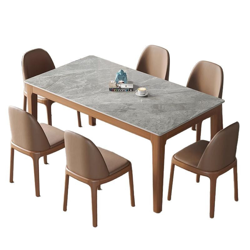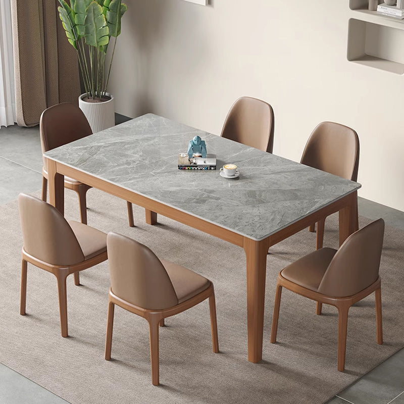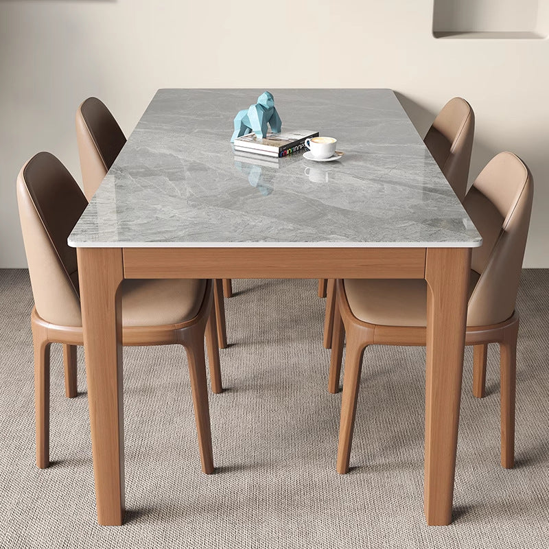 Esta mesa de comedor nórdica moderna presenta una superficie de piedra combinada con madera de caucho maciza, ofreciendo excelente resistencia al calor, resistencia al agua y estabilidad duradera. El diseño rectangular redondeado con bordes suaves anti-colisión la hace ideal para espacios de comedor familiares, combinando seguridad, elegancia y funcionalidad diaria en un entorno de comedor limpio y moderno.