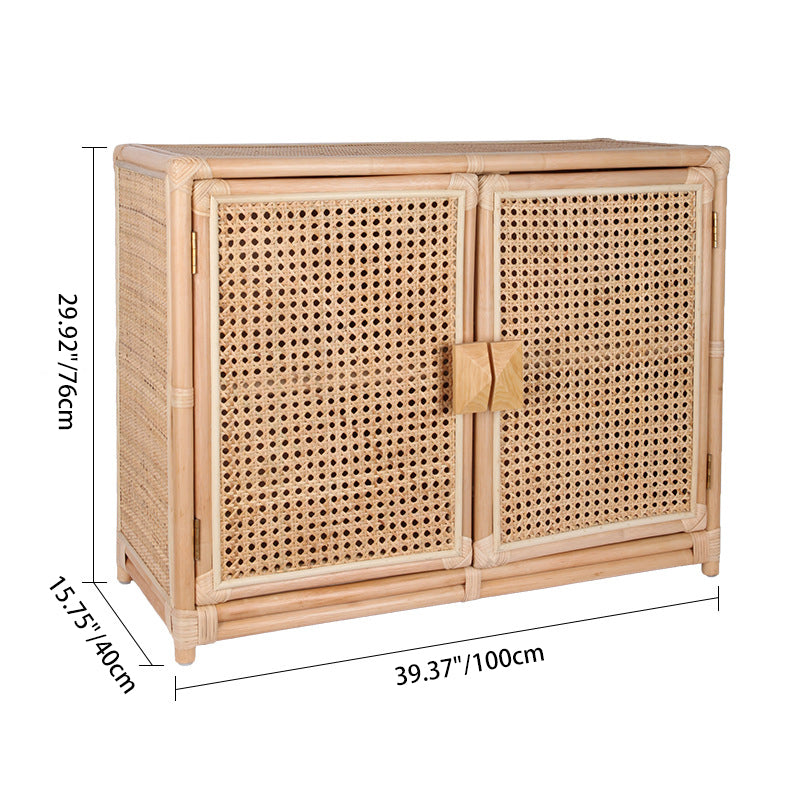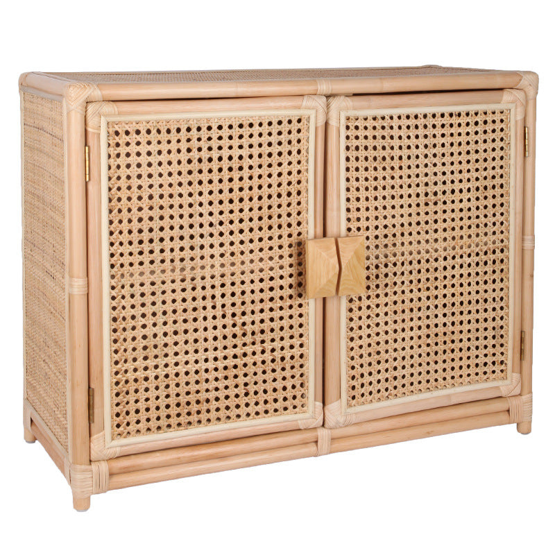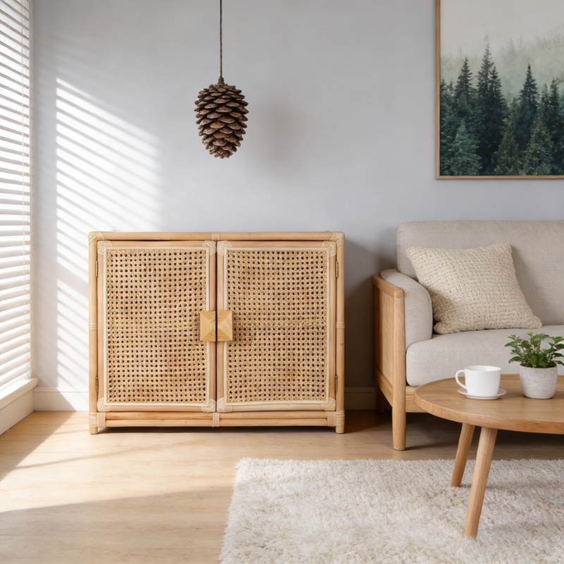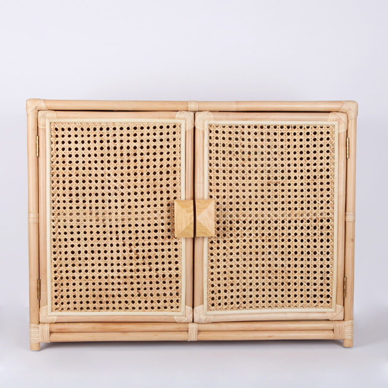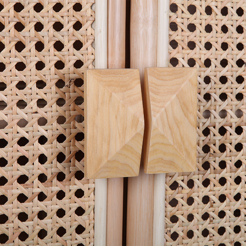 The contrast between the handwoven rattan cabinet doors and the solid wood frame adds visual depth—orderly yet warm—bringing together traditional craftsmanship and contemporary simplicity.