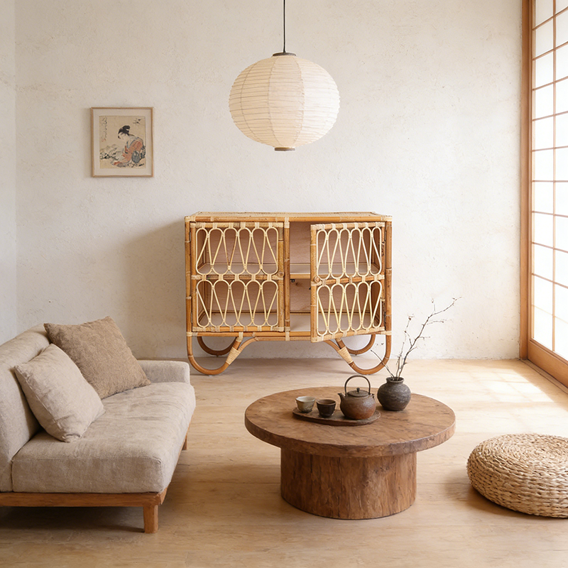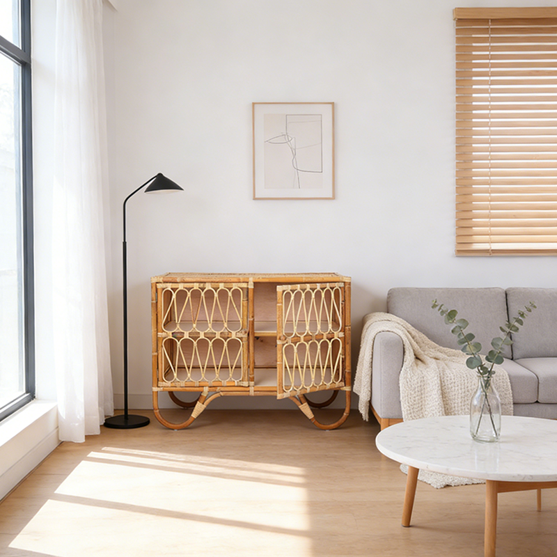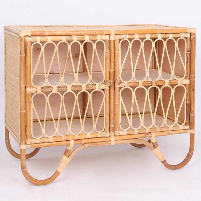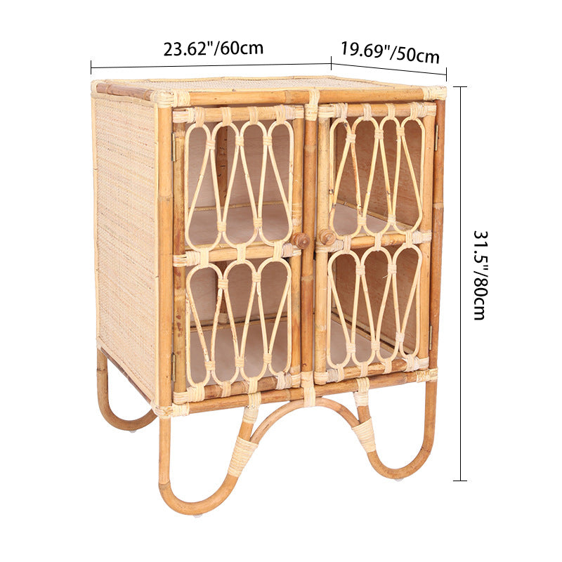 This storage cabinet features a clean, streamlined rectangular silhouette crafted from premium Indonesian rattan through meticulous handweaving. The natural warmth and smooth texture of the rattan combined with a light solid wood frame create an inviting rustic aesthetic. The front is designed with dual doors showcasing symmetrical geometric woven patterns, highlighting exquisite handcrafted details. Slightly curved legs at the base add a subtle sense of lightness and elegance to the sturdy form.
