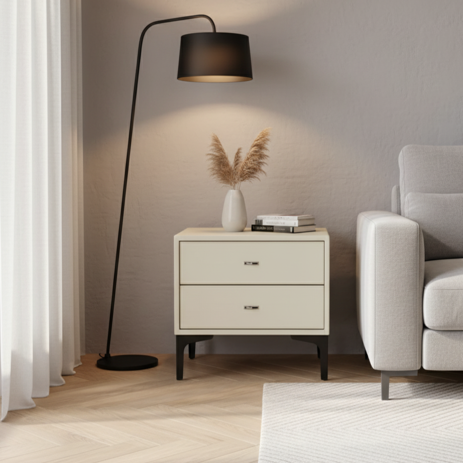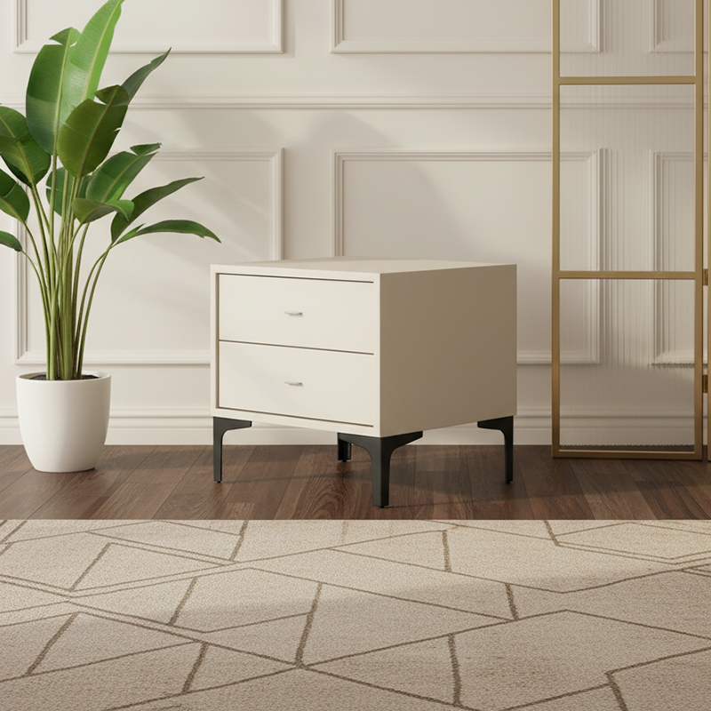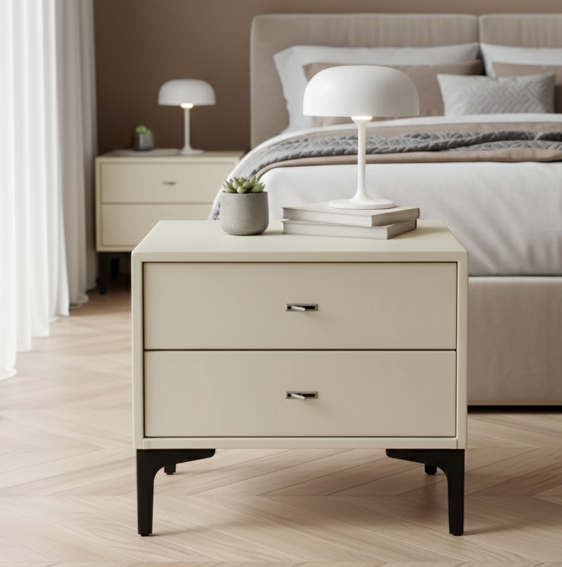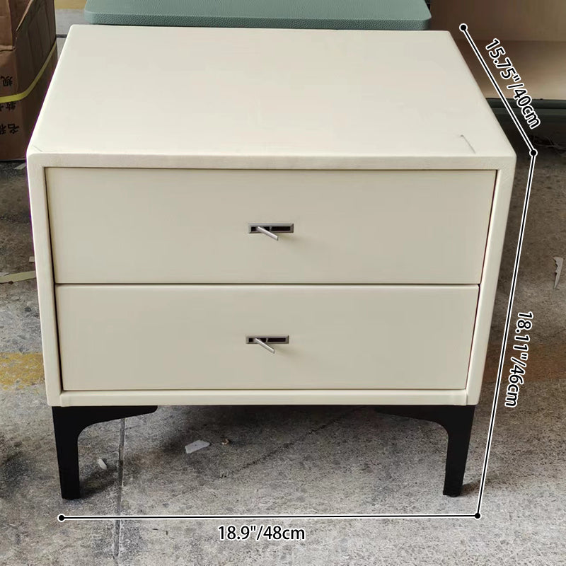 Introduce calm elegance and sophisticated simplicity to your bedroom with this exquisite Cream White Nordic Nightstand. Its clean square silhouette and smooth faux leather finish immediately establish a soft, minimalist aesthetic that effortlessly complements modern, Scandinavian, or tranquil neutral interiors. Crafted from E1-grade eco-friendly MDF and featuring reliable solid wood drawers, it promises long-lasting durability and quality construction. The two spacious drawers ensure your essentials are neatly and discreetly organized, perfectly blending essential functionality with refined, timeless style.