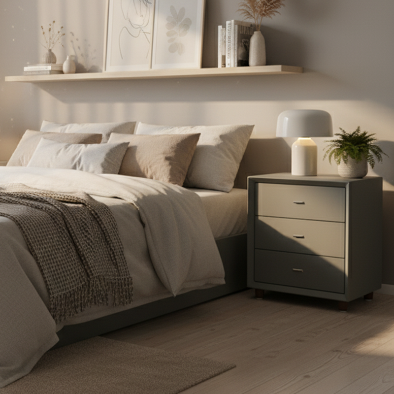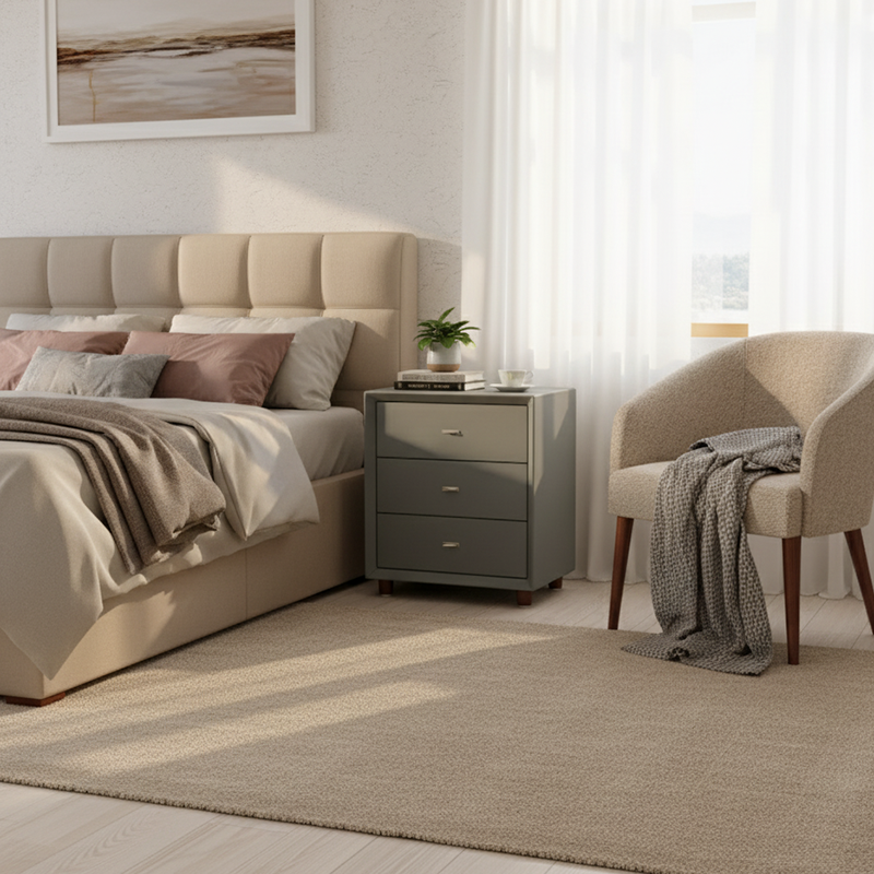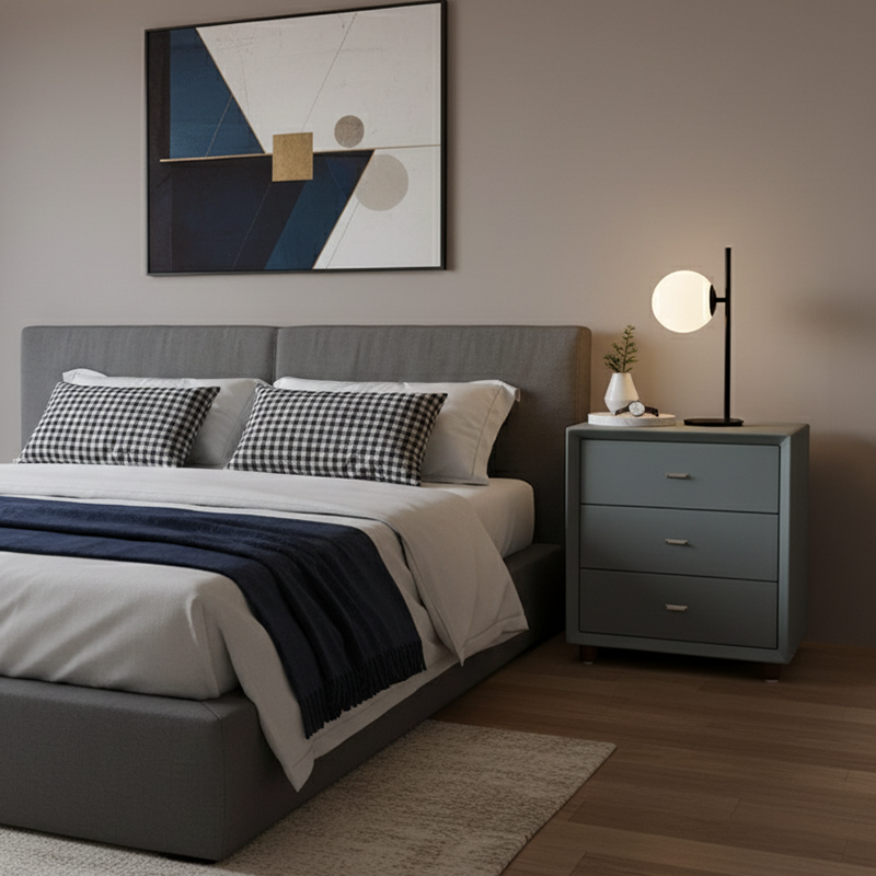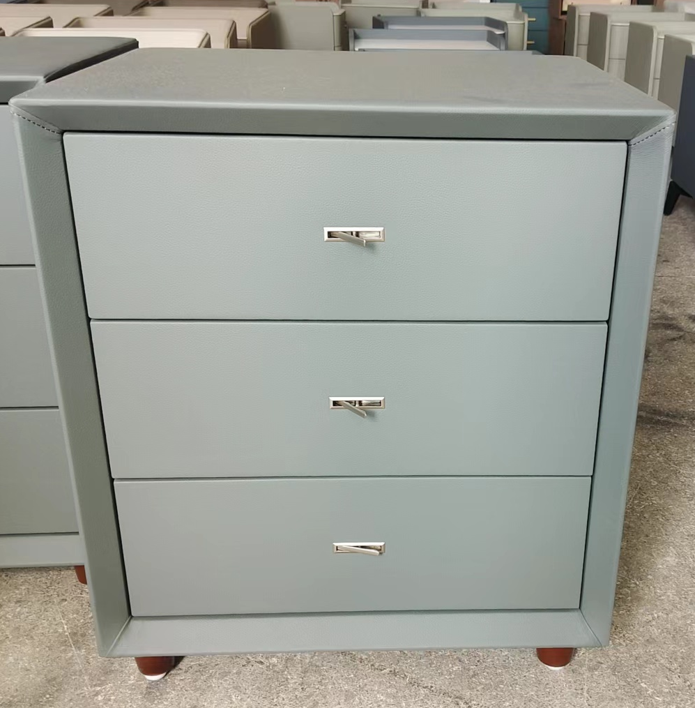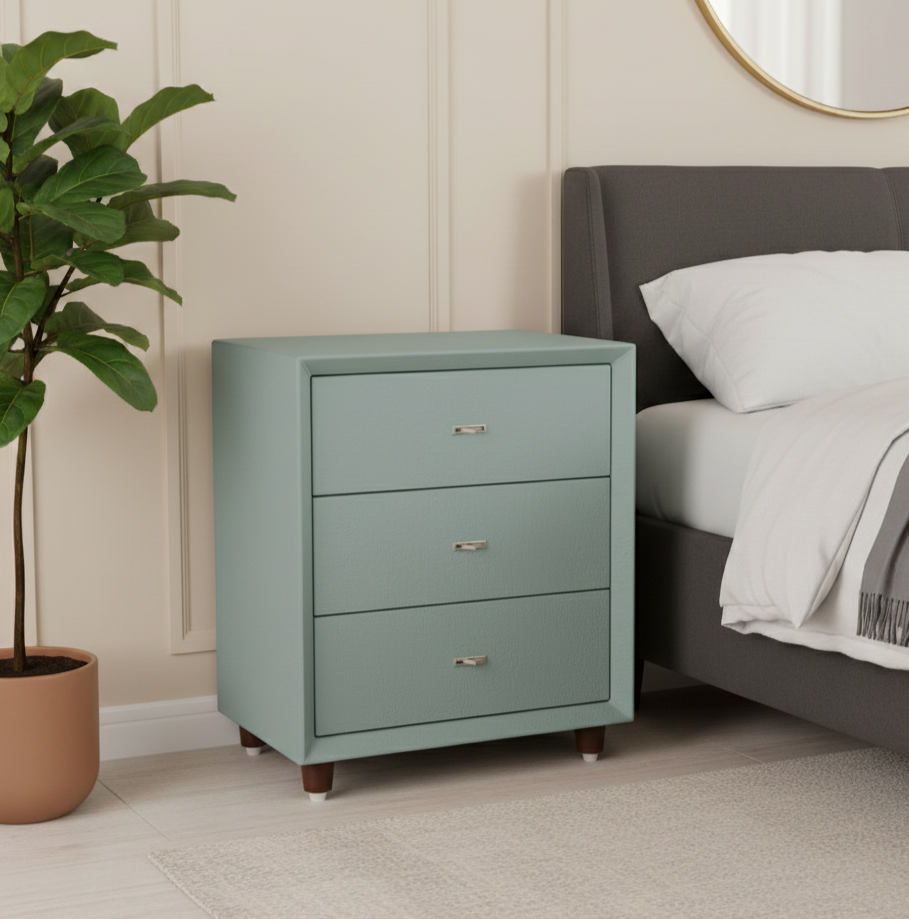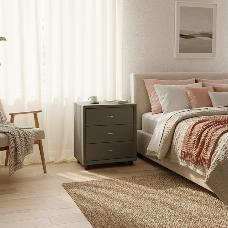 Introduce calm sophistication and modern simplicity to your bedroom with this exquisite Nordic-inspired three-drawer nightstand. Defined by clean, geometric lines and wrapped in a soft matte faux leather finish, it perfectly embodies understated luxury. Crafted with an E1-grade eco-friendly MDF frame and featuring robust solid wood drawers, it guarantees both long-lasting durability and flawlessly smooth functionality. The three spacious drawers provide generous, clutter-free storage to keep all your bedside essentials neatly organized, seamlessly blending essential practicality with timeless, serene style.
