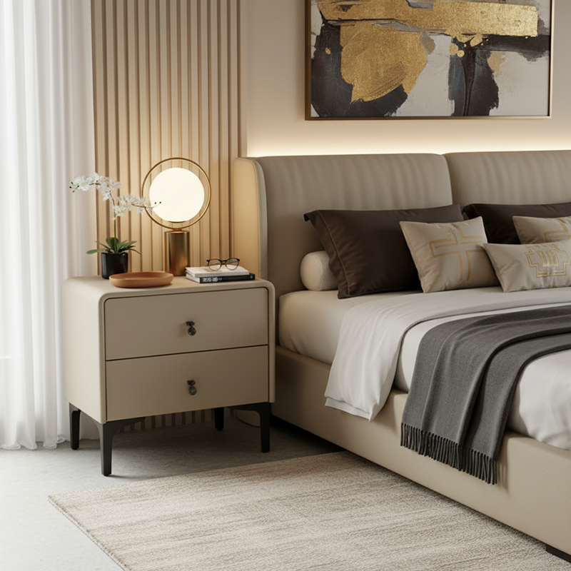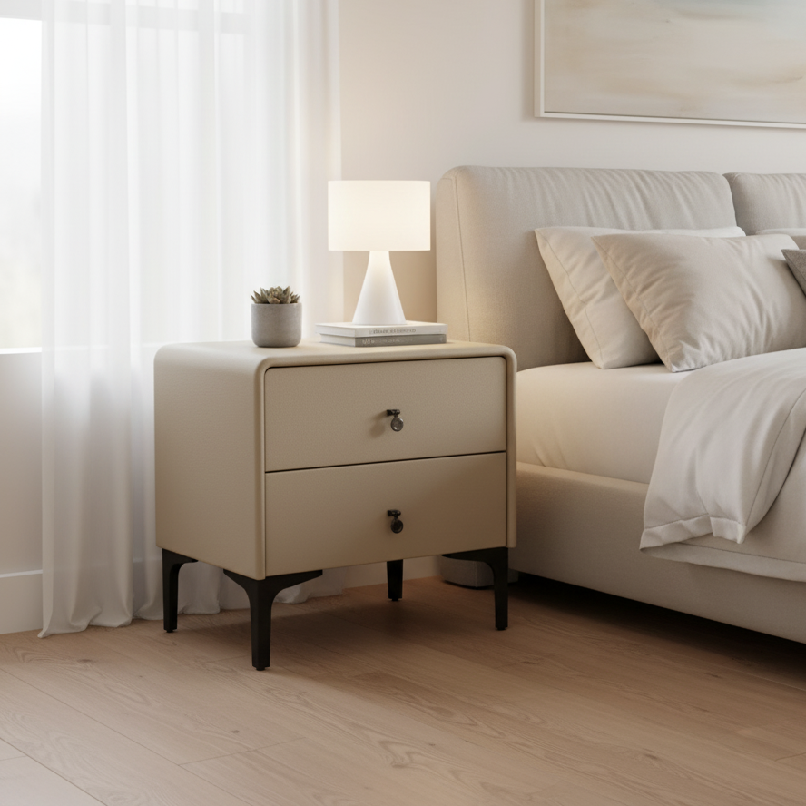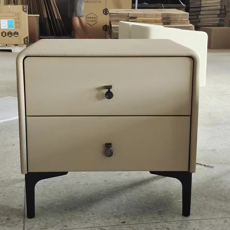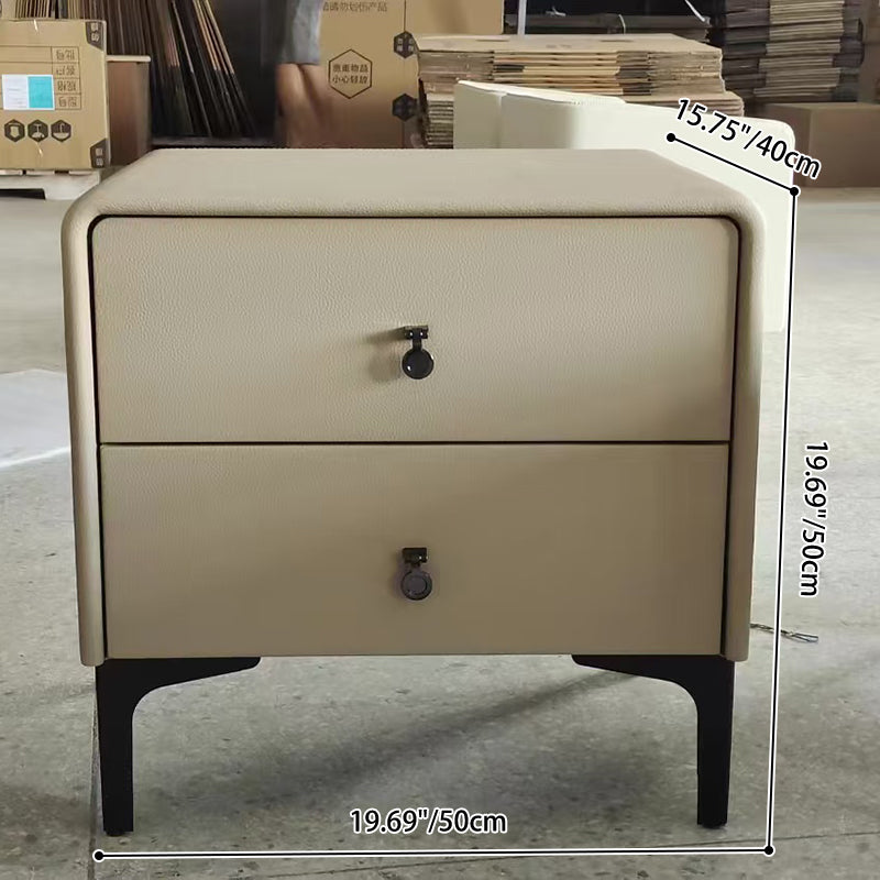 Inspired by Contemporary Scandinavian Design, this cream white nightstand features a clean, rational geometric form. It is expertly wrapped in soft PVC faux leather, providing a smooth, wear-resistant texture and a serene, elegant look. Constructed with E1 eco-friendly MDF and solid wood drawer frames, it guarantees both stability and durability. Supported by a minimalist iron base, the dual drawers offer ample, organized bedside storage for a peaceful and stylish bedroom setting.