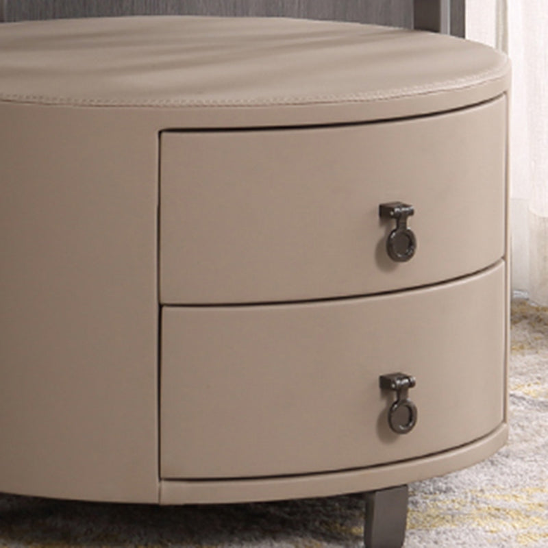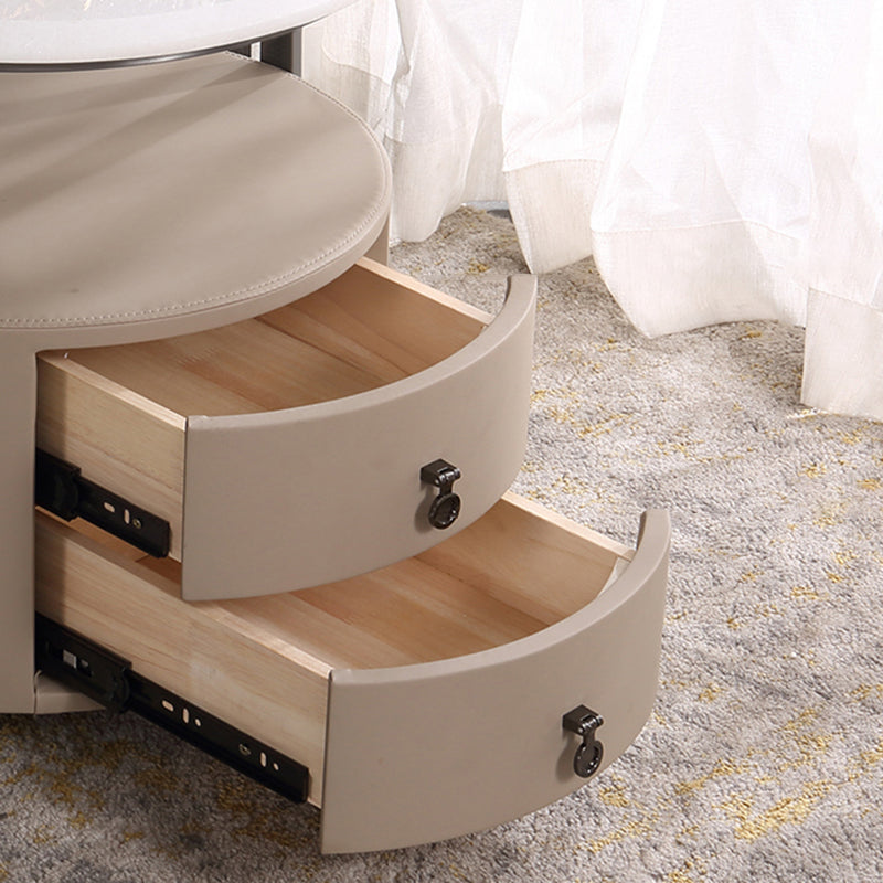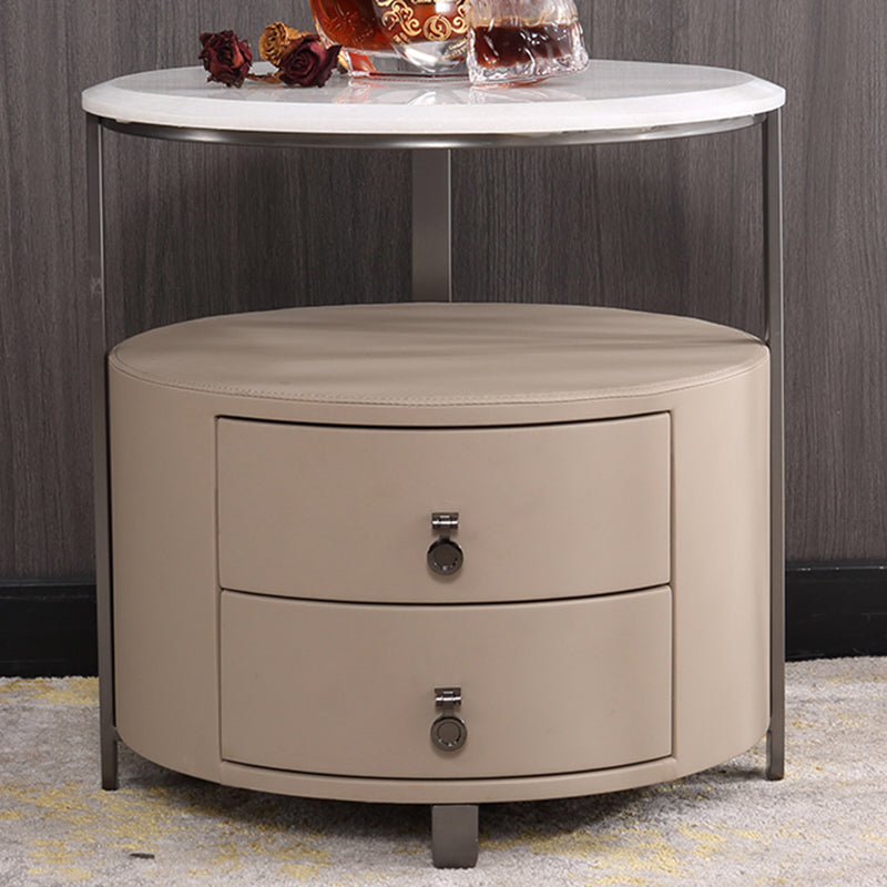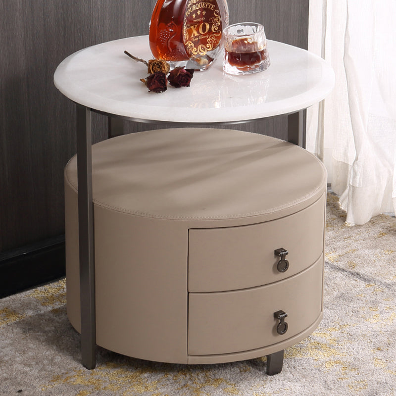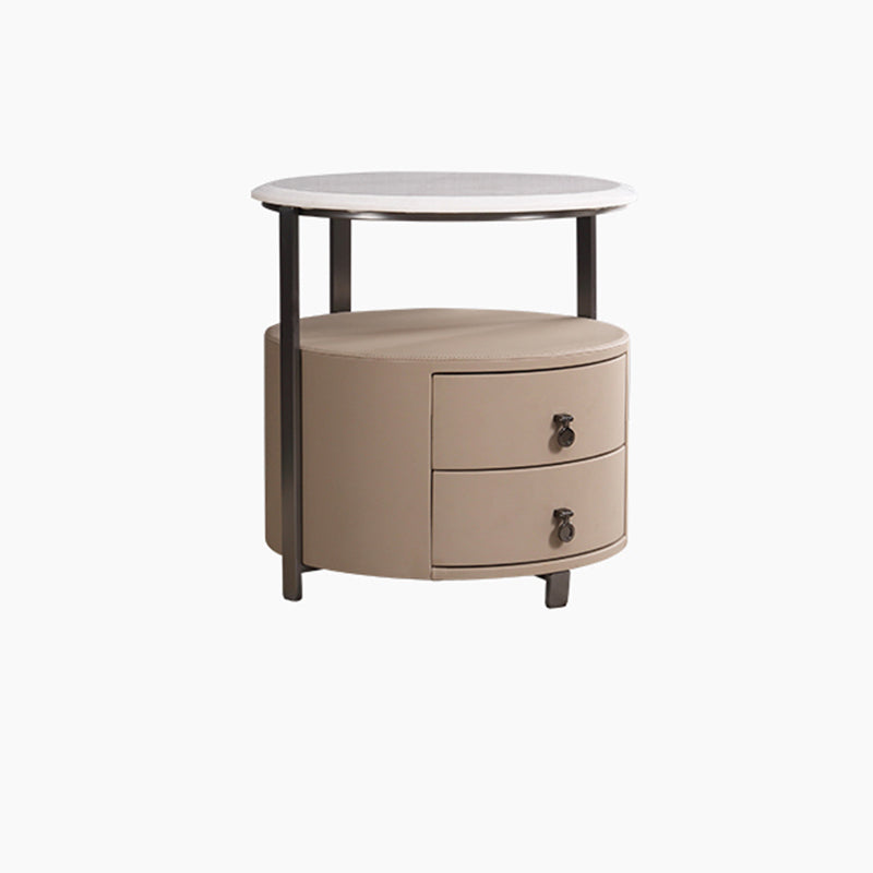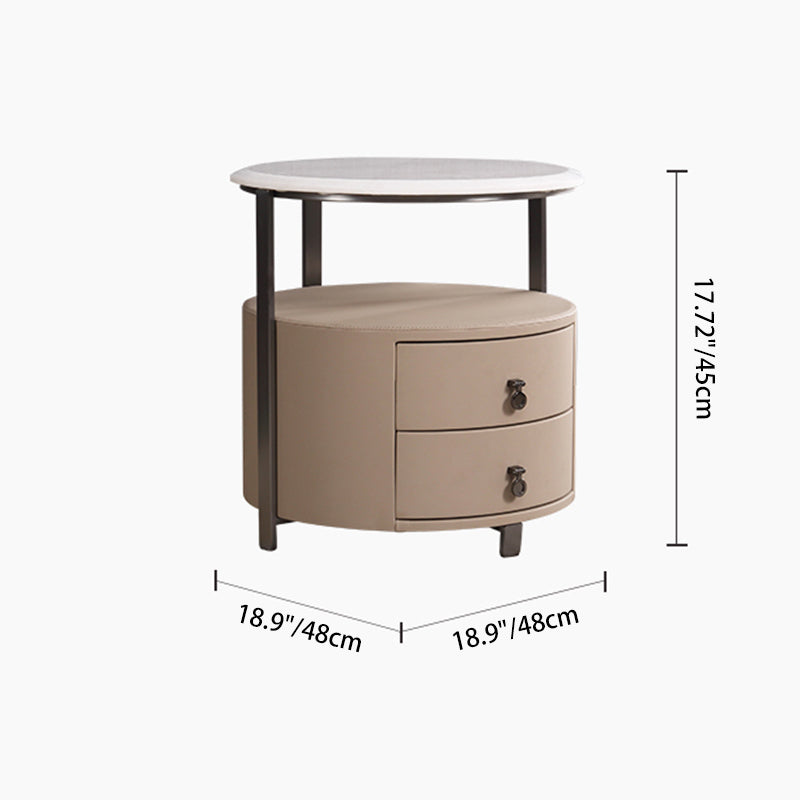 Introduce warmth and refined elegance to your bedroom with this exquisite Modern Round Nightstand, which blends smooth curves and sophisticated textures for a cozy, upscale look. Wrapped entirely in soft brown faux leather, it adds an immediate touch of luxury, while the sintered stone top provides a contrasting surface of unmatched durability and timeless appeal. Featuring two spacious drawers and an integrated double-layer structure, it offers ample, intelligent storage for all your nighttime essentials. This unique piece perfectly balances high style and practicality, making it an indispensable accent for modern, minimalist, or luxury interiors.