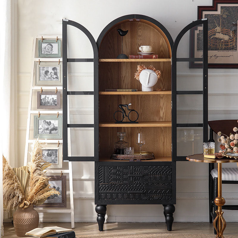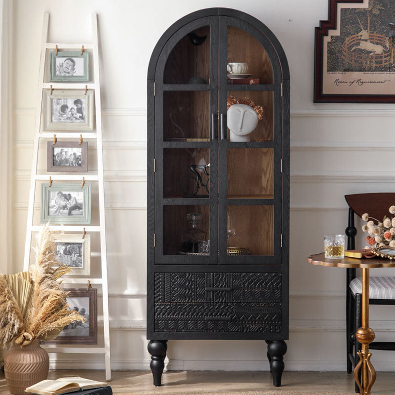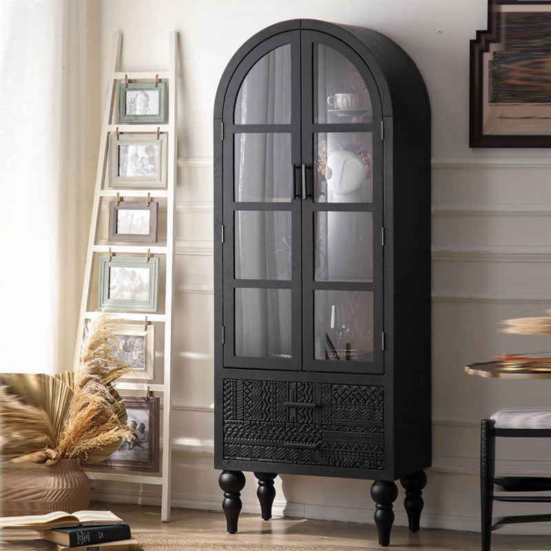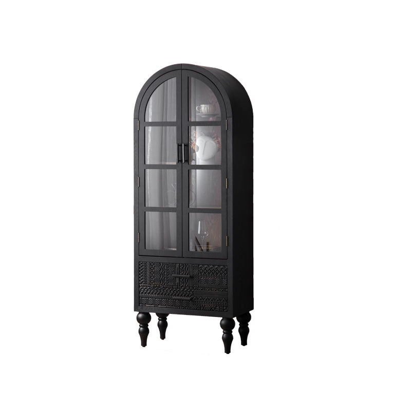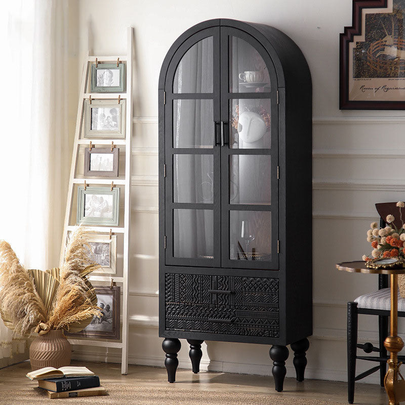 This black arched storage cabinet features two drawers, offering neatly divided storage space for bedrooms or living rooms. Crafted from pine wood, MDF, and glass, it combines Scandinavian contemporary style with functional organization for an elegant and practical home accent.