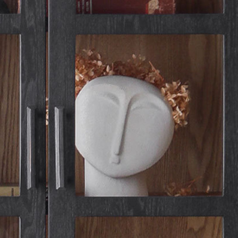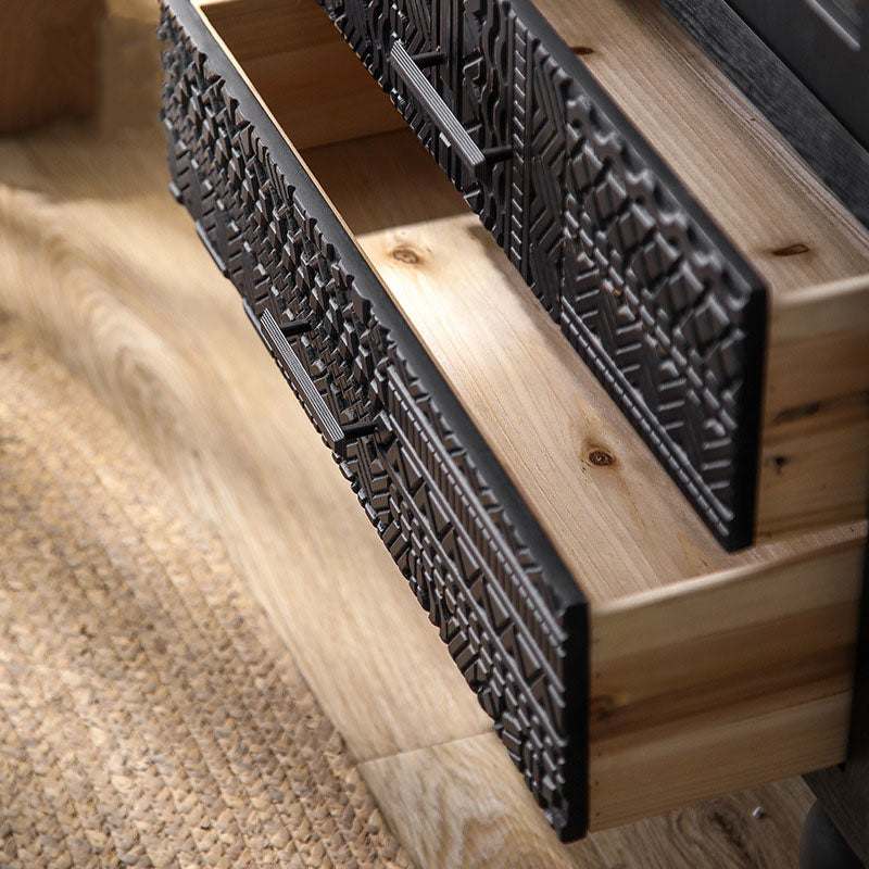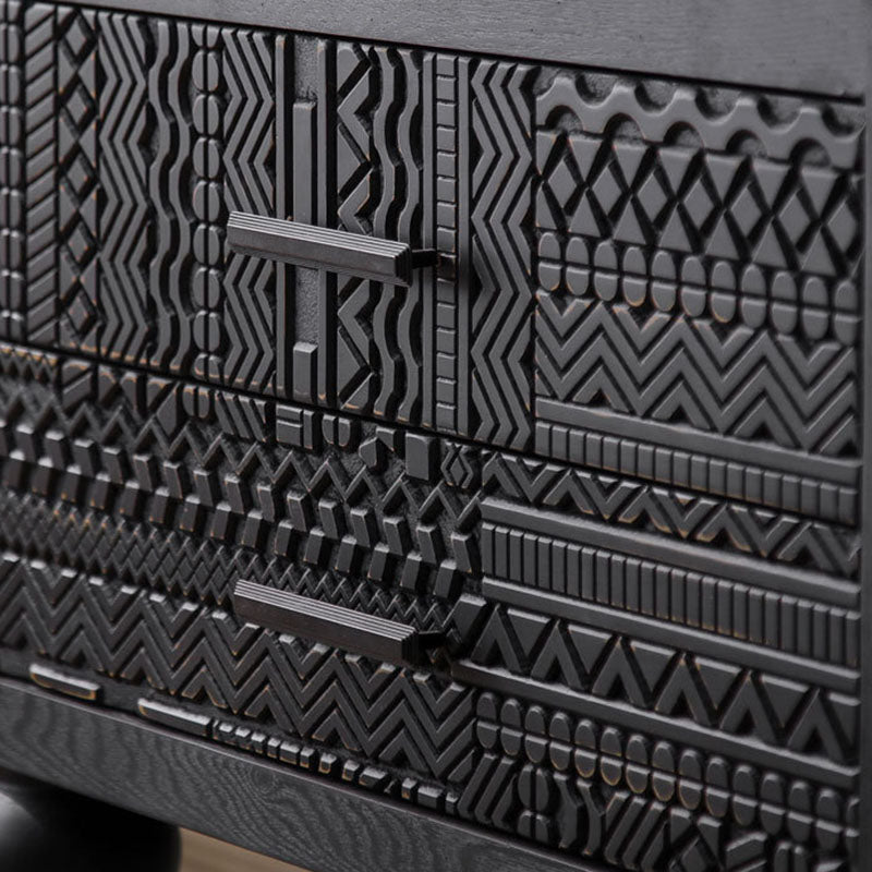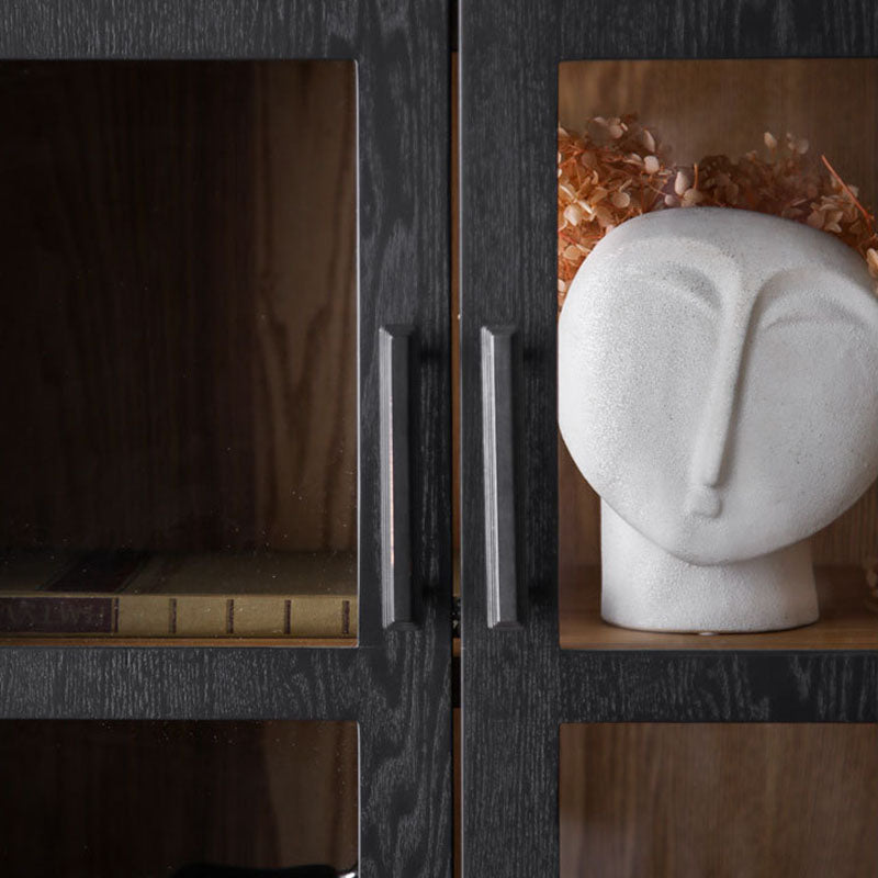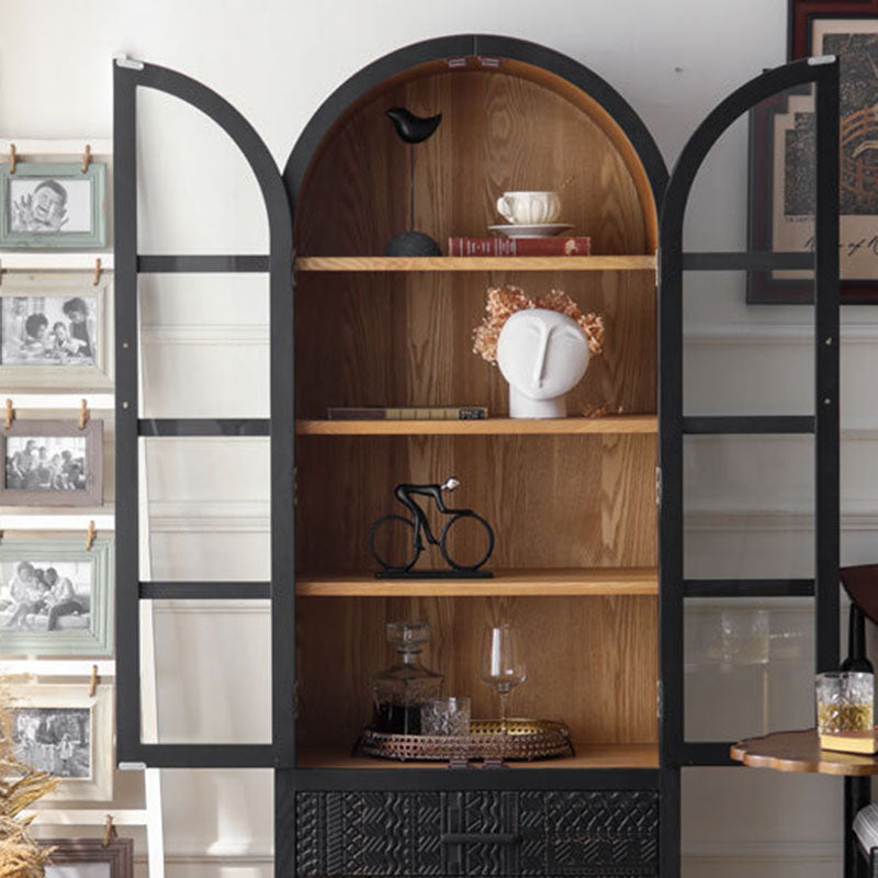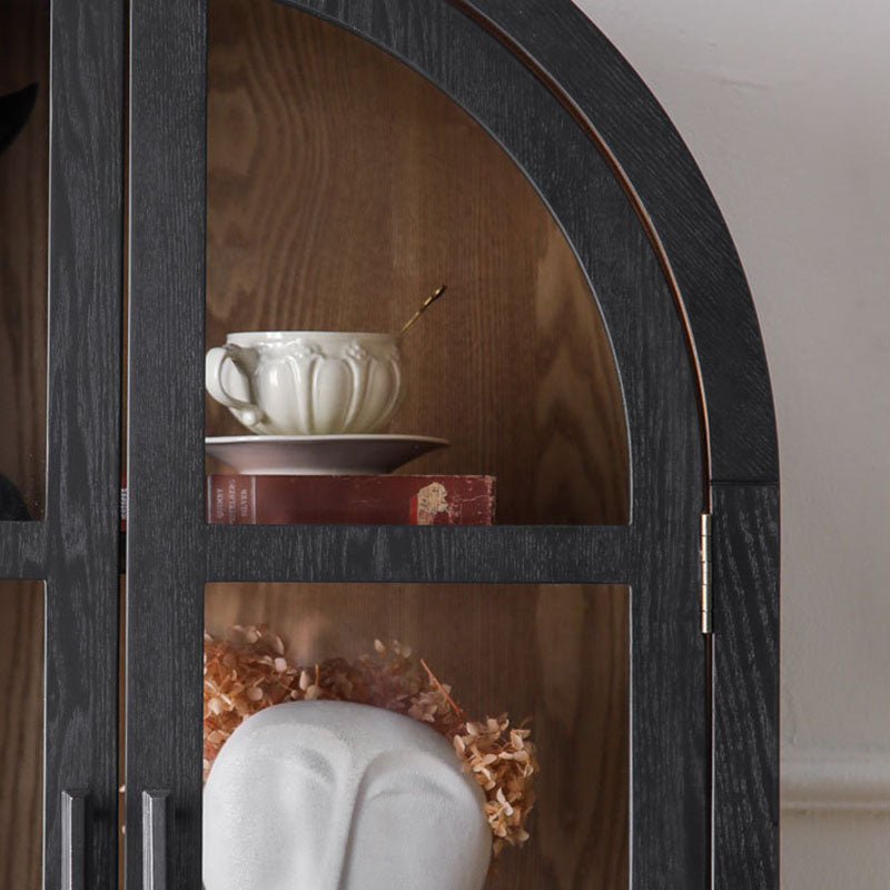 This black arched storage cabinet features two drawers, offering neatly divided storage space for bedrooms or living rooms. Crafted from pine wood, MDF, and glass, it combines Scandinavian contemporary style with functional organization for an elegant and practical home accent.
