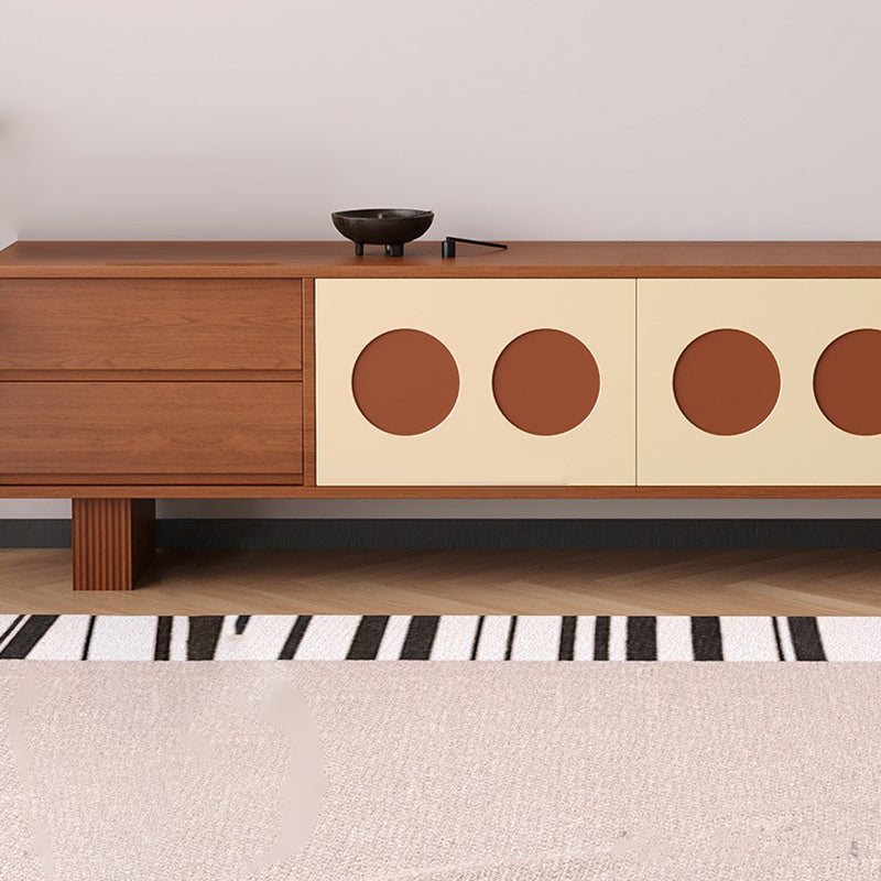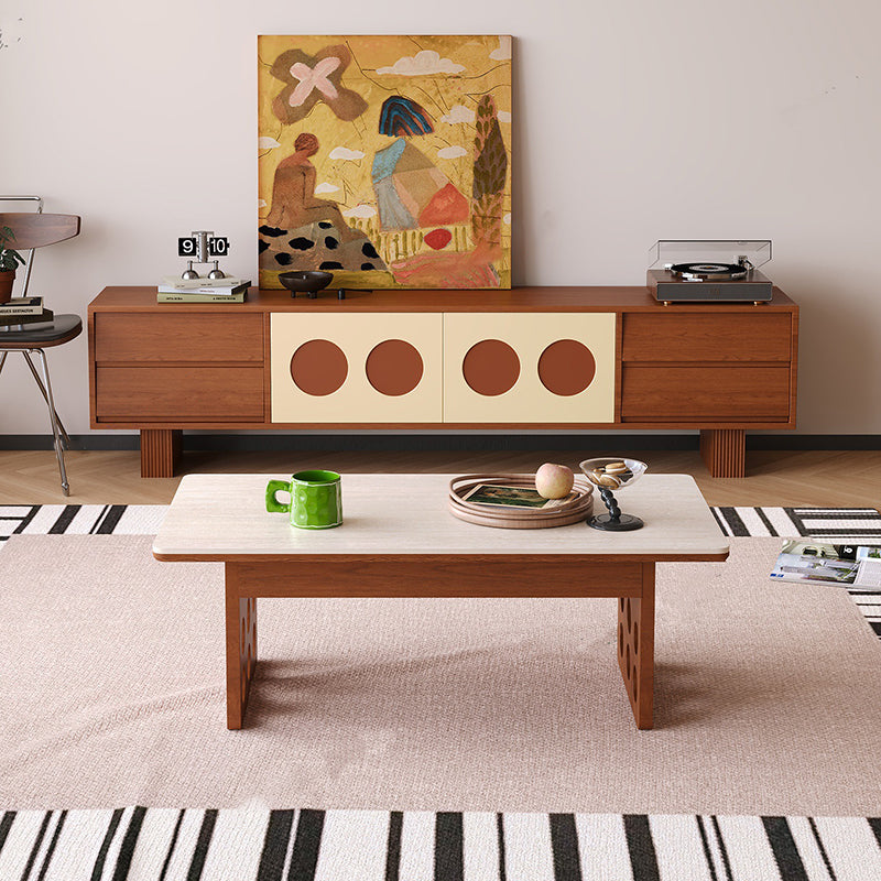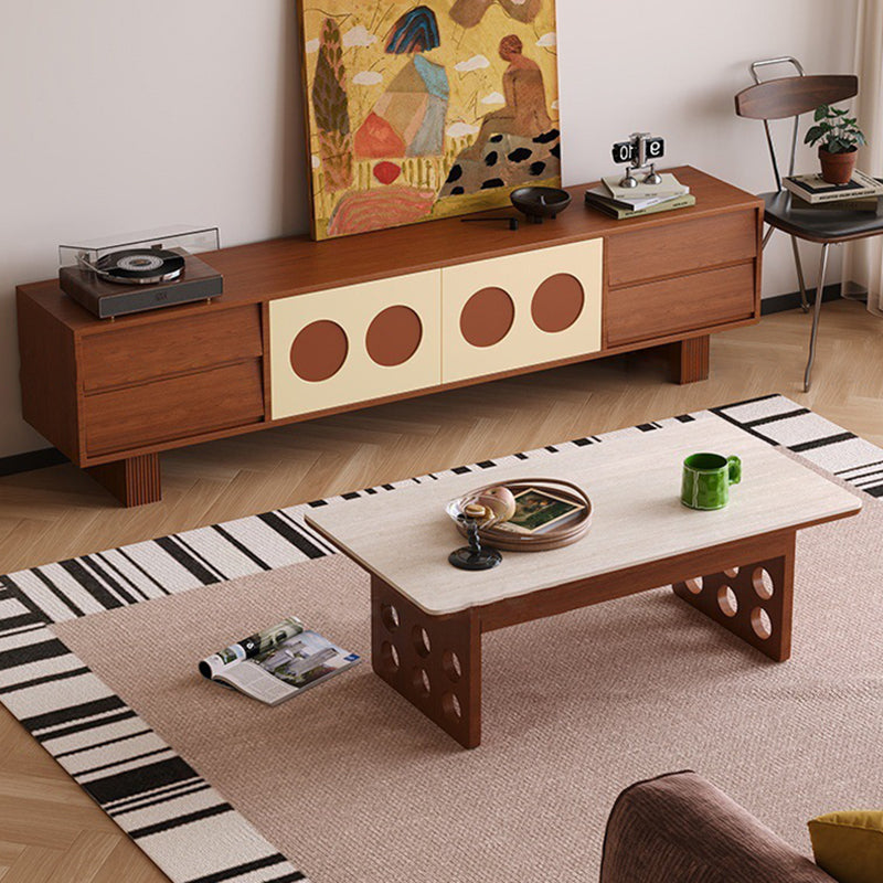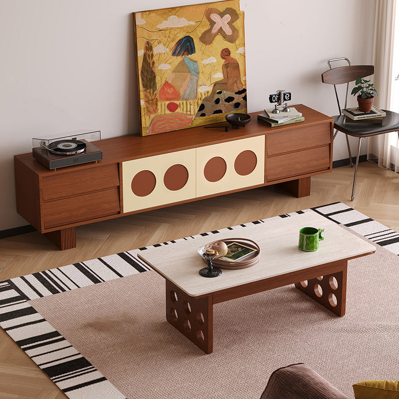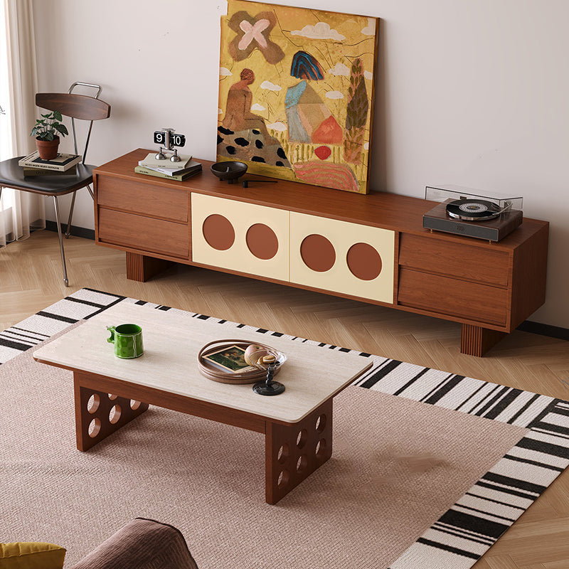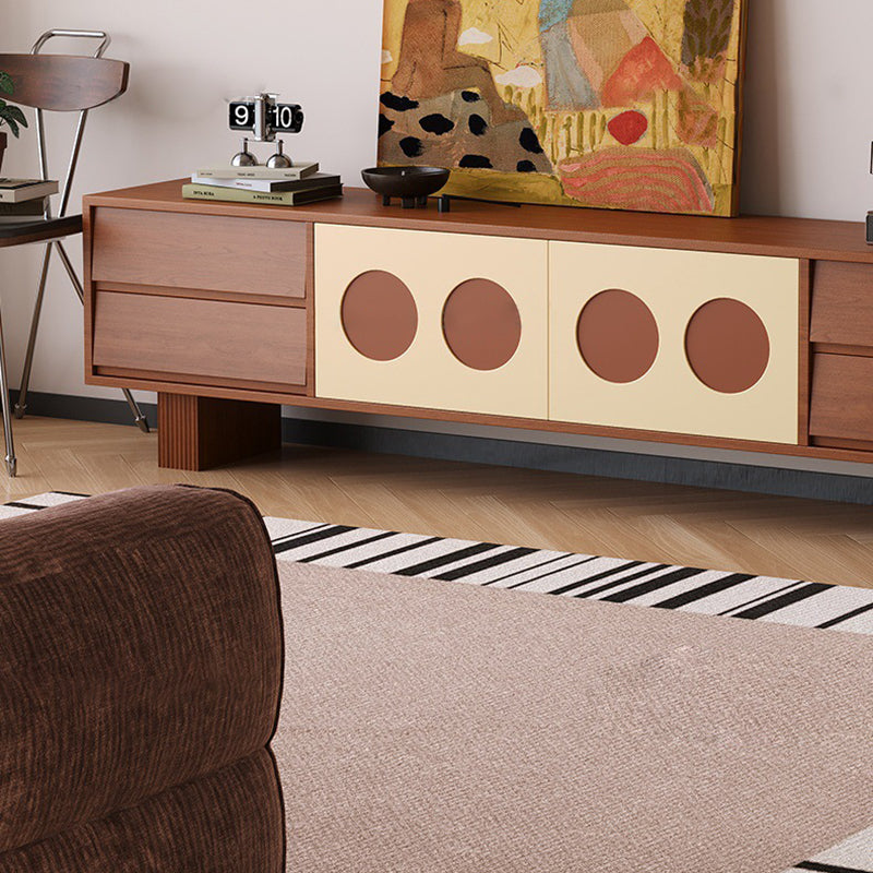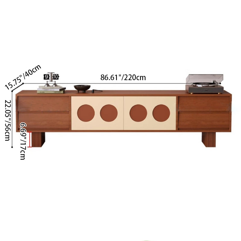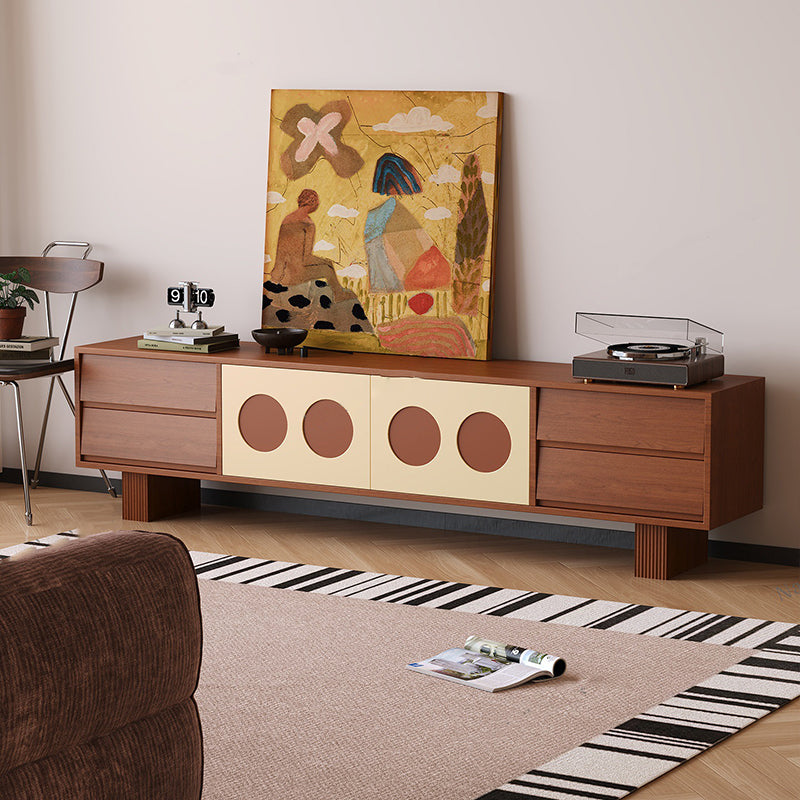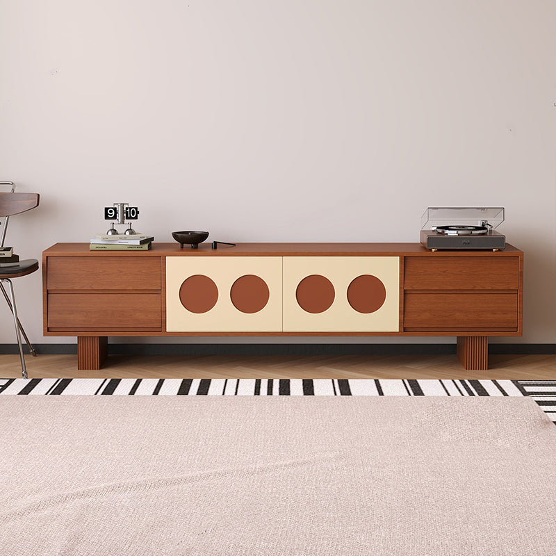 This contemporary Scandinavian TV stand is crafted from ash wood and solid wood multi-layer boards in a warm walnut finish. Designed with a clean rectangular profile, high raised legs, and four spacious drawers, it offers ample storage while keeping your living room or bedroom tidy and easy to maintain.