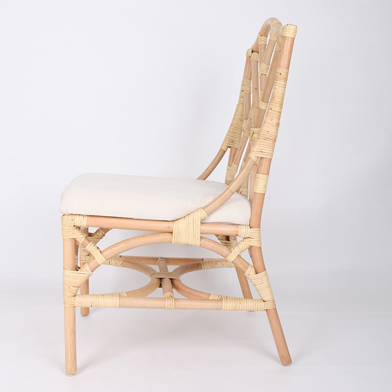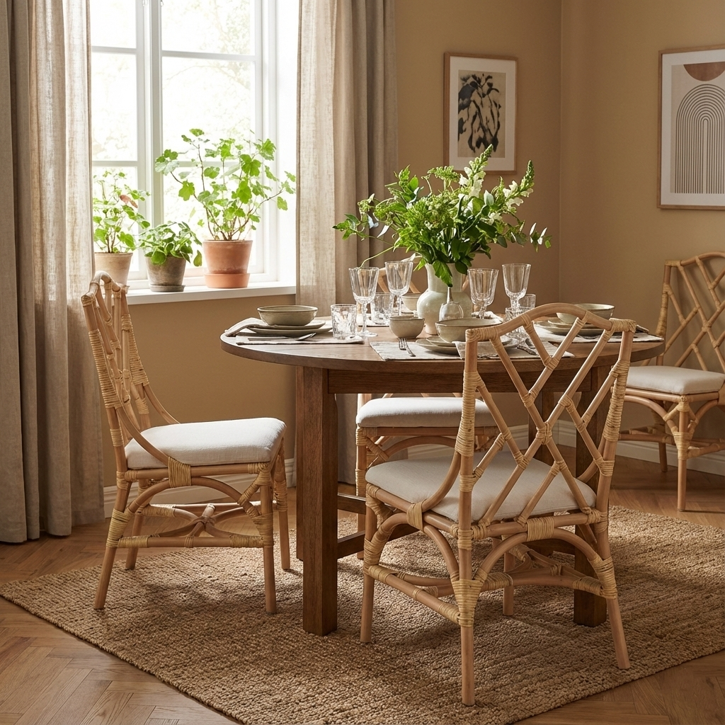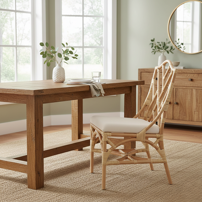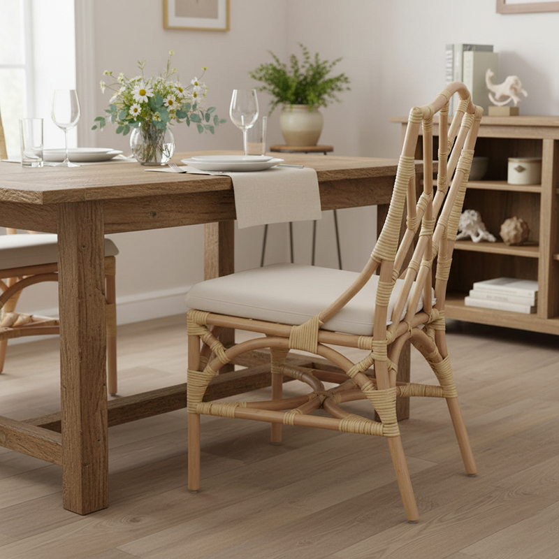Designed for modern living, this handwoven natural rattan dining chair brings warmth and texture to any space. Crafted from premium Indonesian rattan, the chair is lightweight yet strong, offering natural flexibility and breathable comfort.