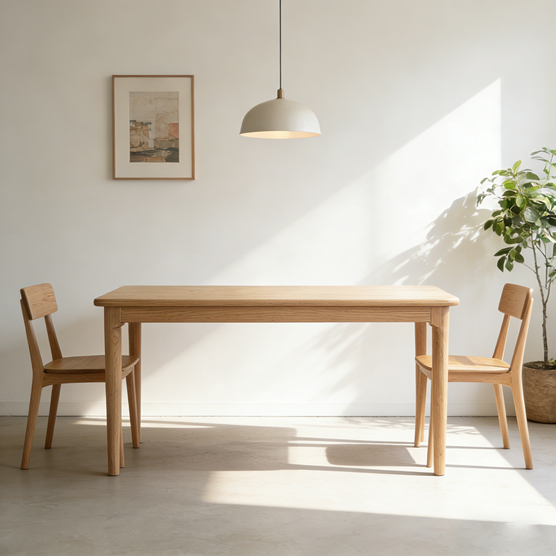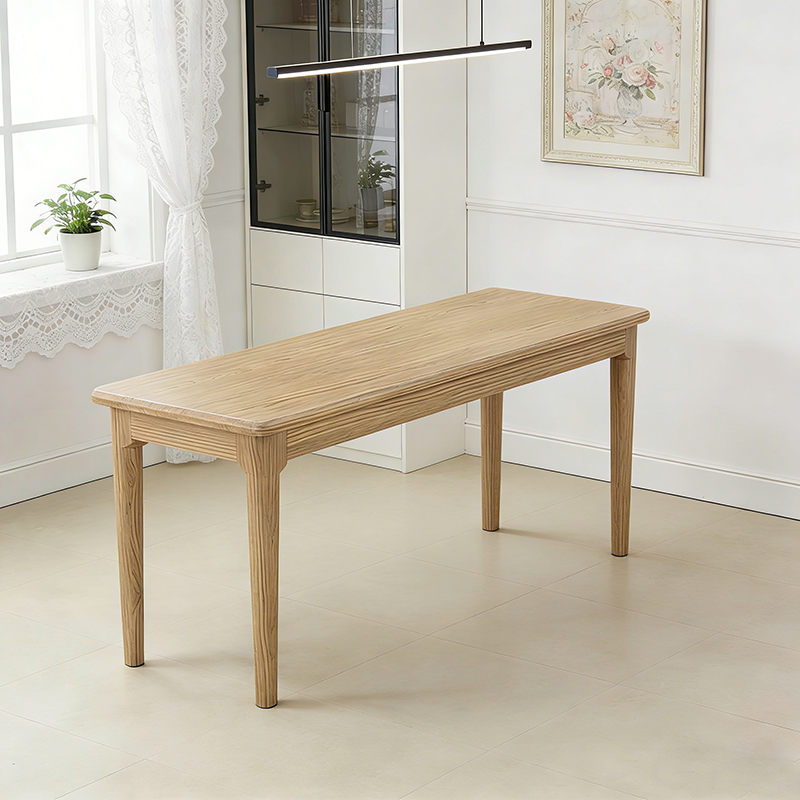 Crafted from imported North American ash wood, this minimalist dining table showcases a clean rectangular silhouette with smooth edges and a warm Light Walnut finish. Its lightweight visual profile pairs with sturdy inward-tapered legs for stability and refined aesthetics. Rounded corners soften the form while adding everyday safety and comfort.