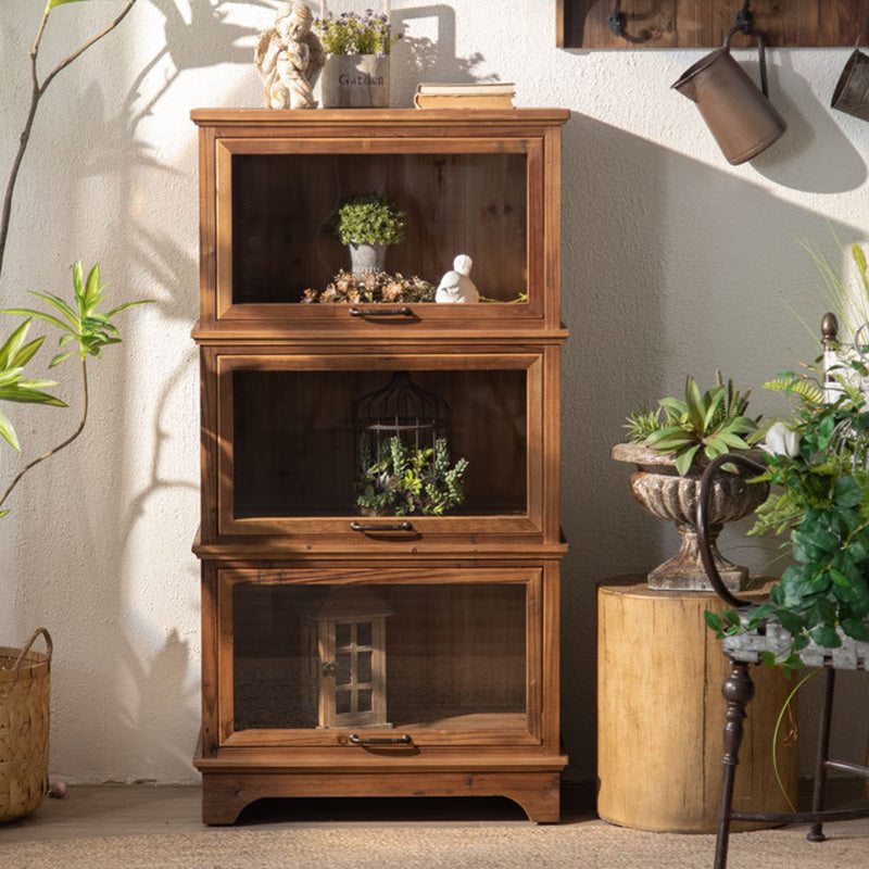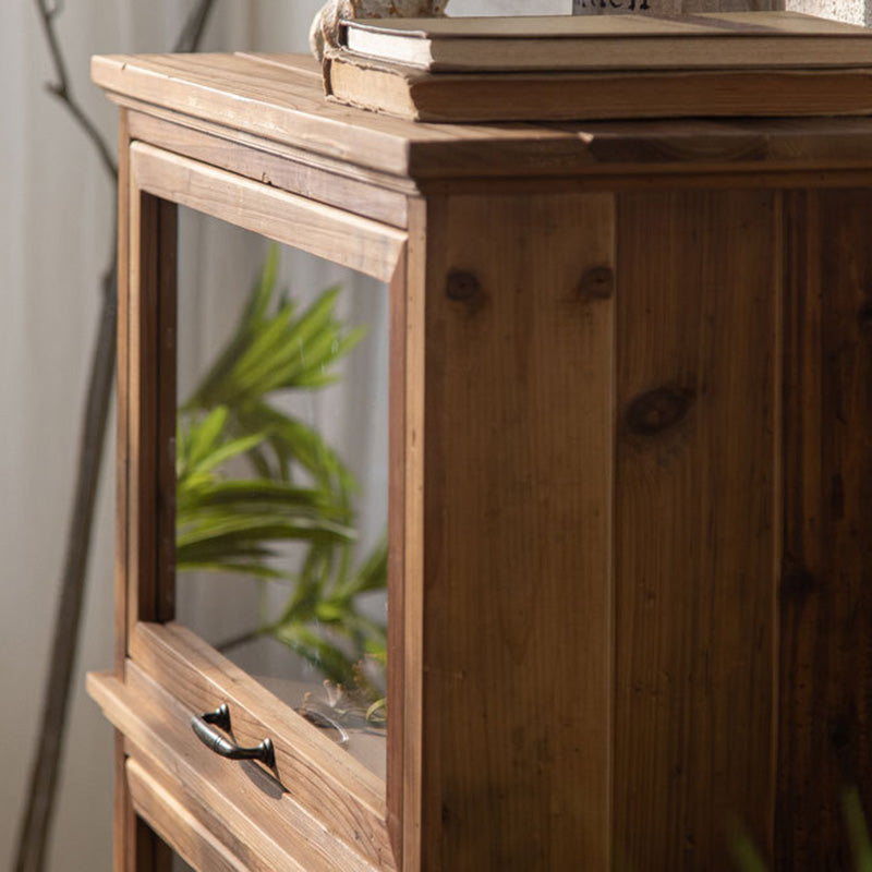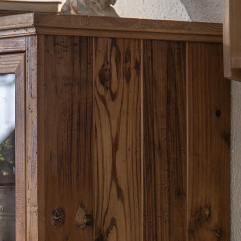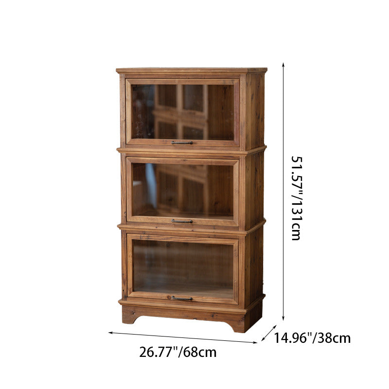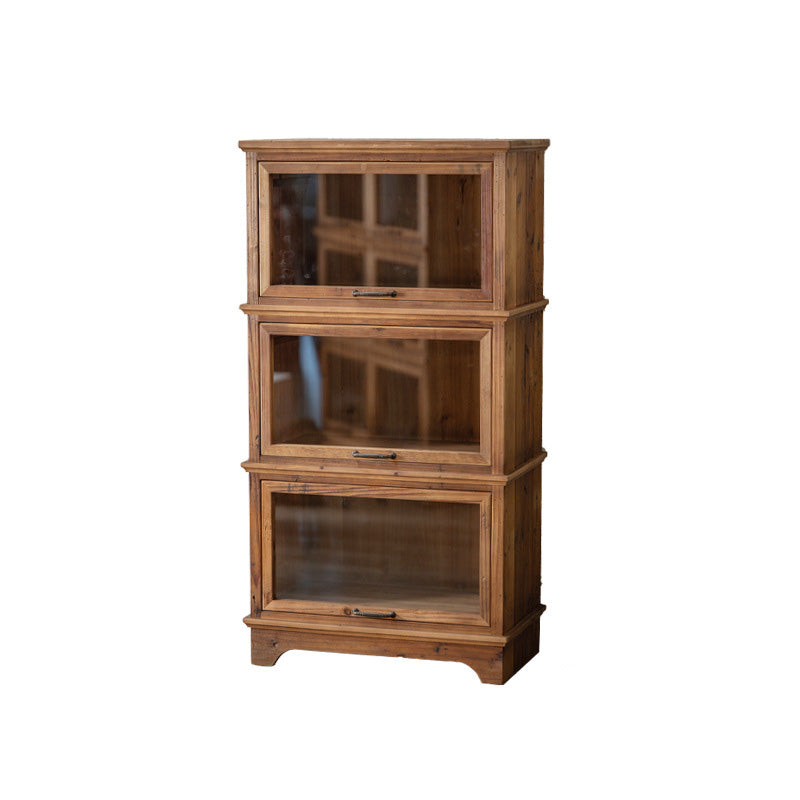 This traditional rustic-style pine wood storage cabinet features a warm wood tone, three functional compartments, and a vintage weathered finish with natural wood knots and distressed nail marks. With its multi-layer structure, it offers generous storage and display space for both living rooms and bedrooms. Designed for cozy rustic interiors, this glass-front cabinet delivers durability, charm, and functional home organization.