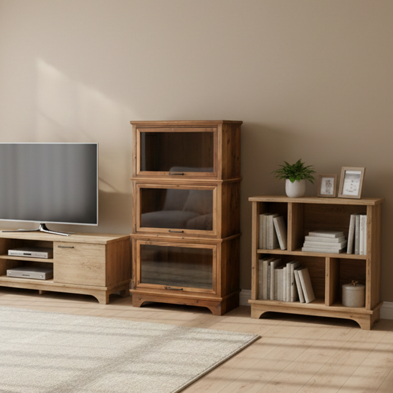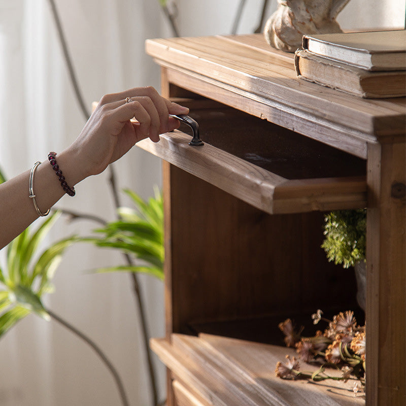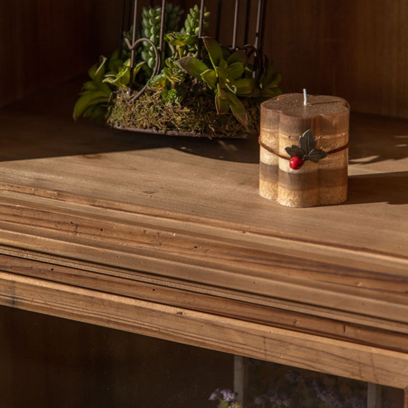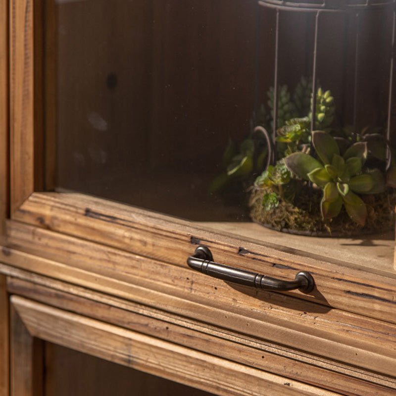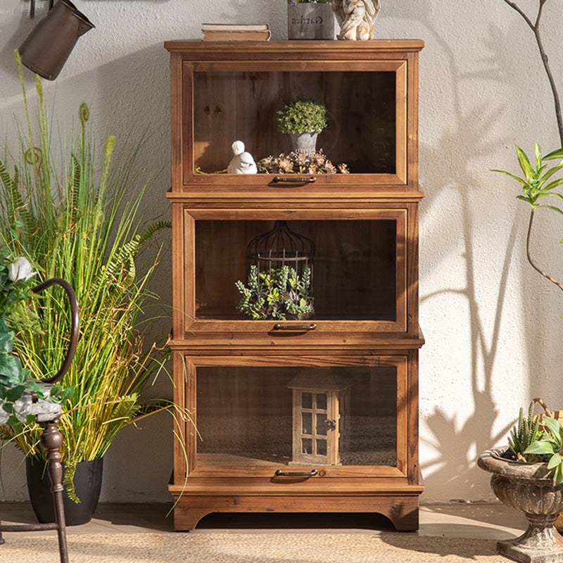 This traditional rustic-style pine wood storage cabinet features a warm wood tone, three functional compartments, and a vintage weathered finish with natural wood knots and distressed nail marks. With its multi-layer structure, it offers generous storage and display space for both living rooms and bedrooms. Designed for cozy rustic interiors, this glass-front cabinet delivers durability, charm, and functional home organization.