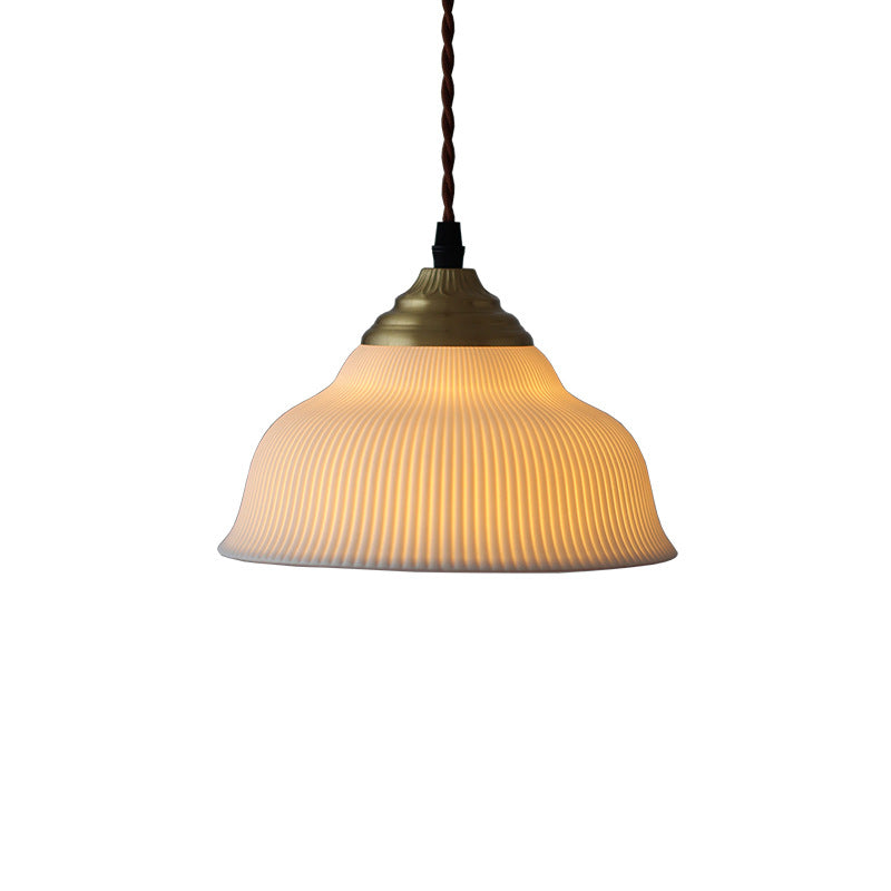 Esta lámpara colgante vintage de 1 luz presenta una pantalla de cerámica blanca en forma de cuenco combinada con elegante latón, ofreciendo un brillo atemporal y artístico. Su cerámica translúcida cambia suavemente con la luz—blanca cuando está apagada, cálida cuando está encendida—haciéndola tanto decorativa como duradera para dormitorios o espacios de estar.