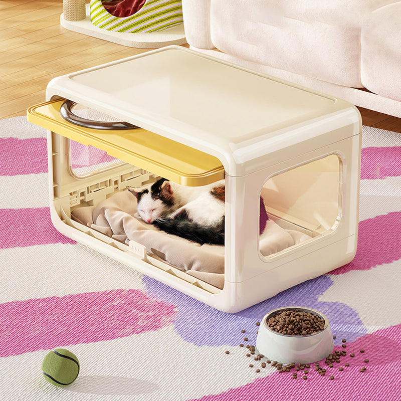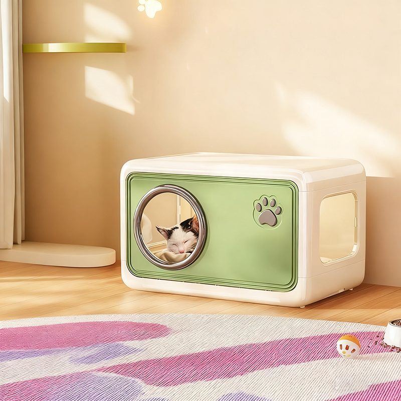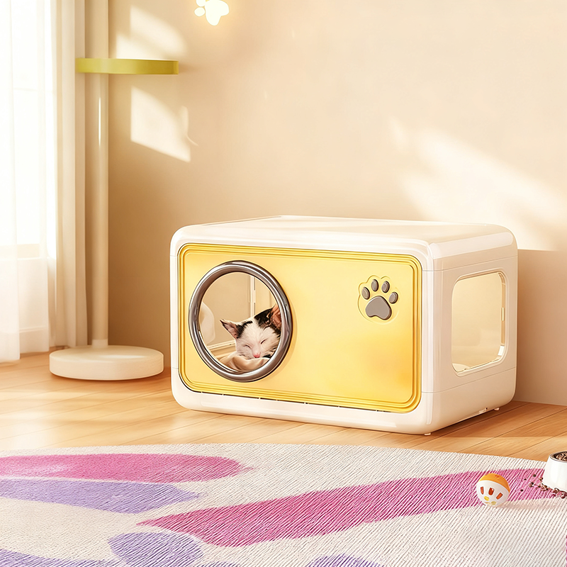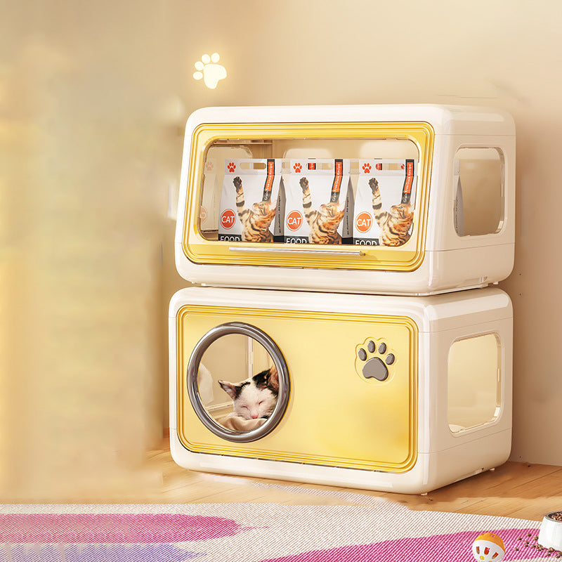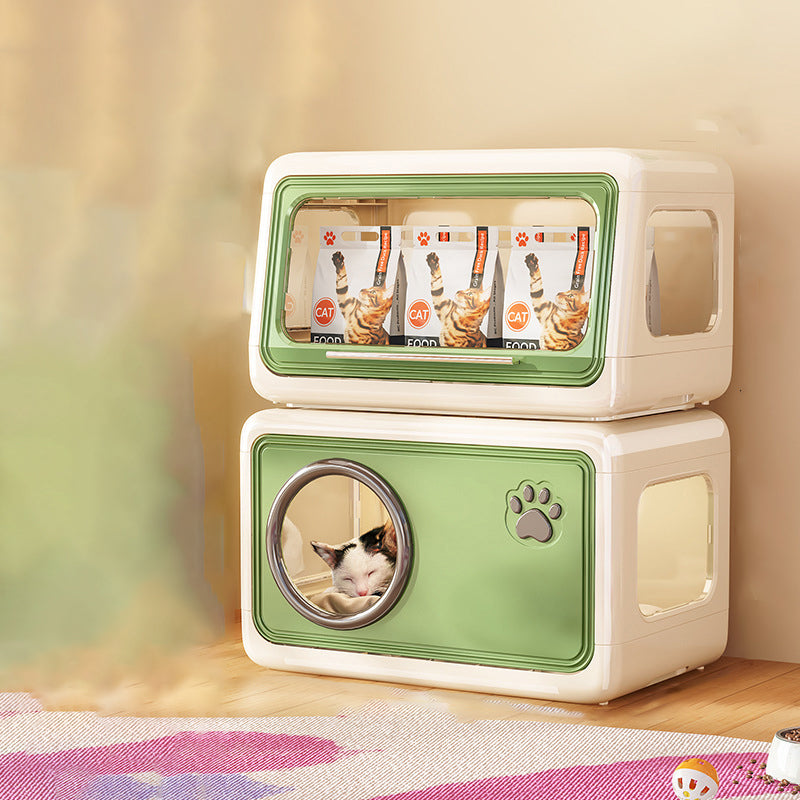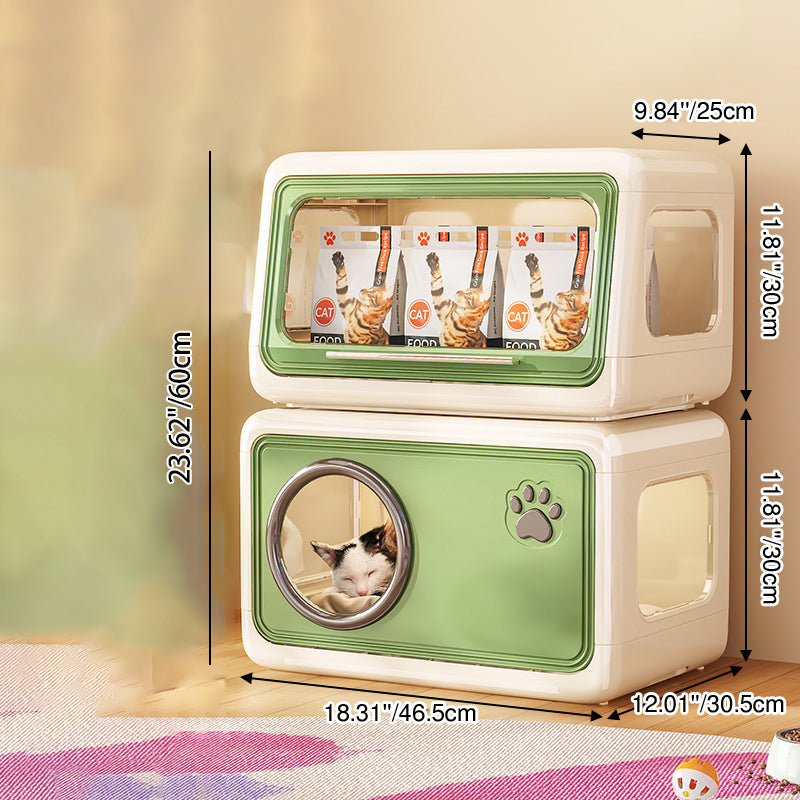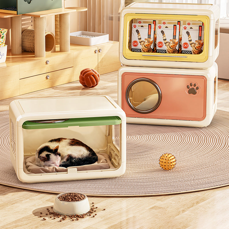 This stackable Art Deco rectangular cat bed (fits small dogs too) is made of sturdy HIPS and plastic, available in yellow, green and pink. With 1/2-tier options and a flip-top design, it’s durable and perfect for year-round use in the living room or bedroom.