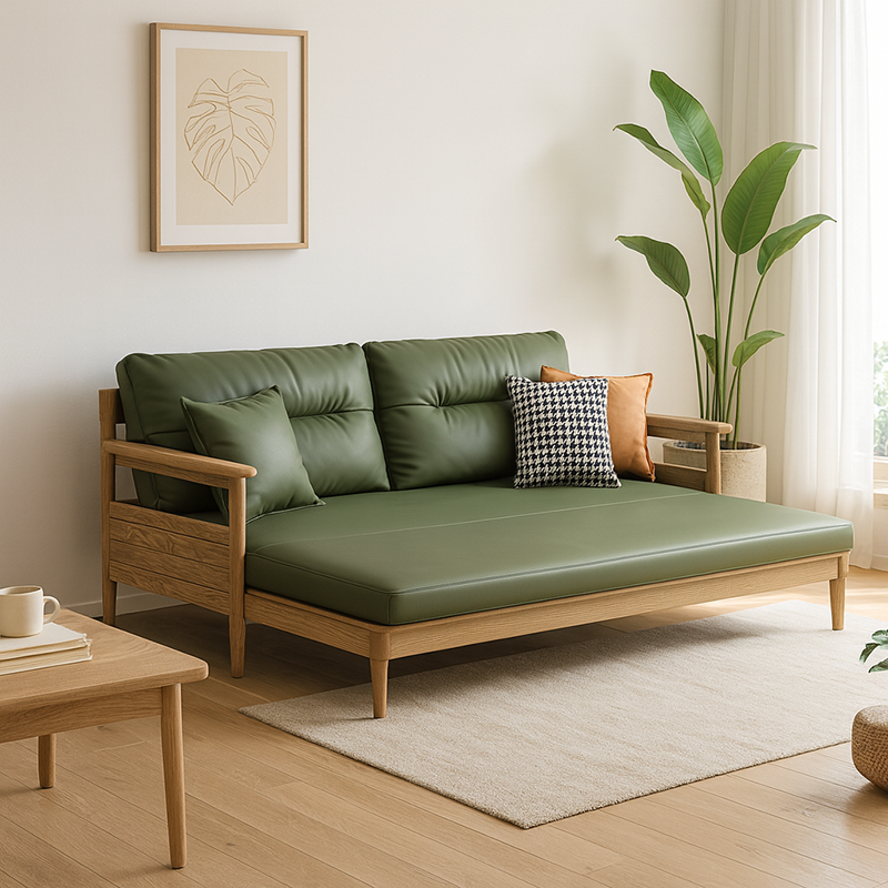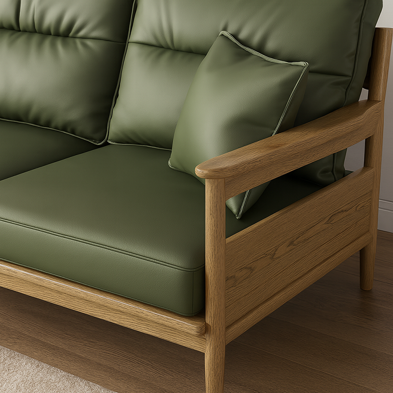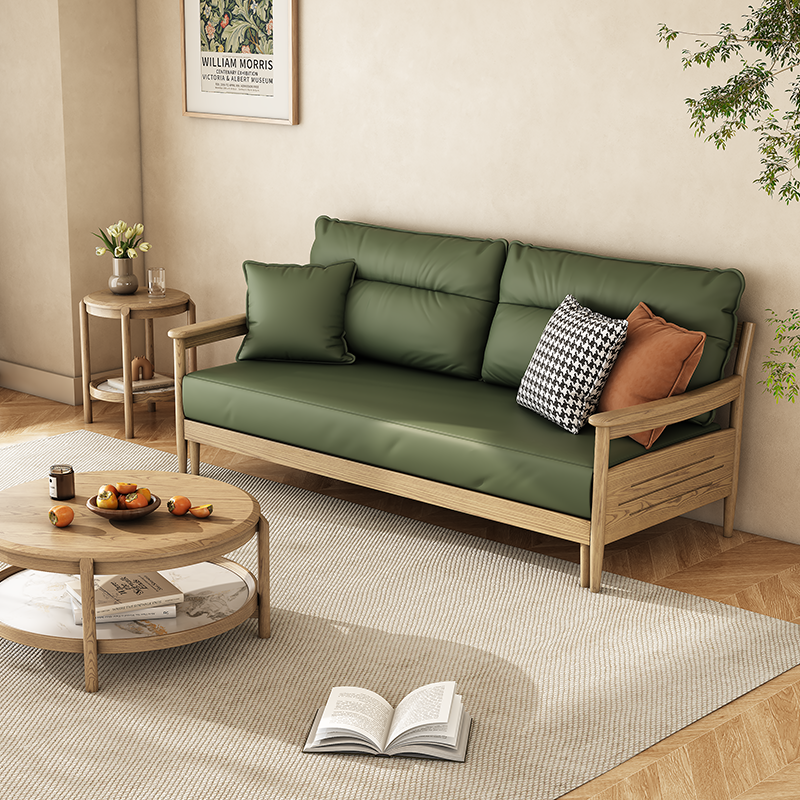 Crafted with a 100% solid ash wood frame (no composite materials), this sofa showcases the natural warmth of a Light Walnut finish and clean architectural lines. Its low-profile, horizontally extended silhouette creates a calm and balanced visual presence without feeling bulky. The seat and back cushions combine high-resilience foam with feather filling, delivering a soft yet supportive sit. Wrapped in premium eco leather, the sofa blends durability, comfort, and refined texture for modern living spaces.