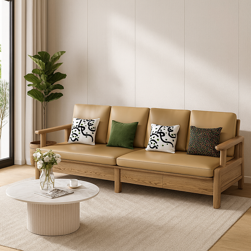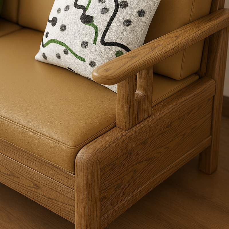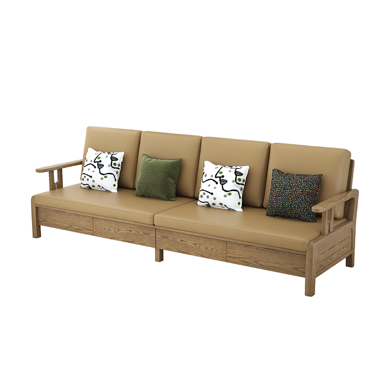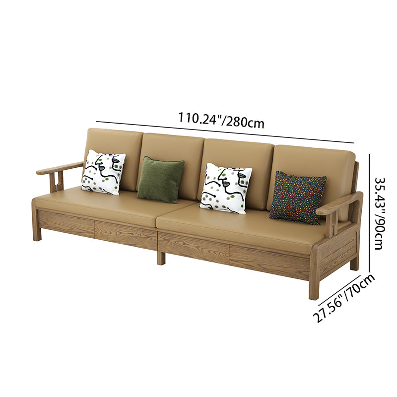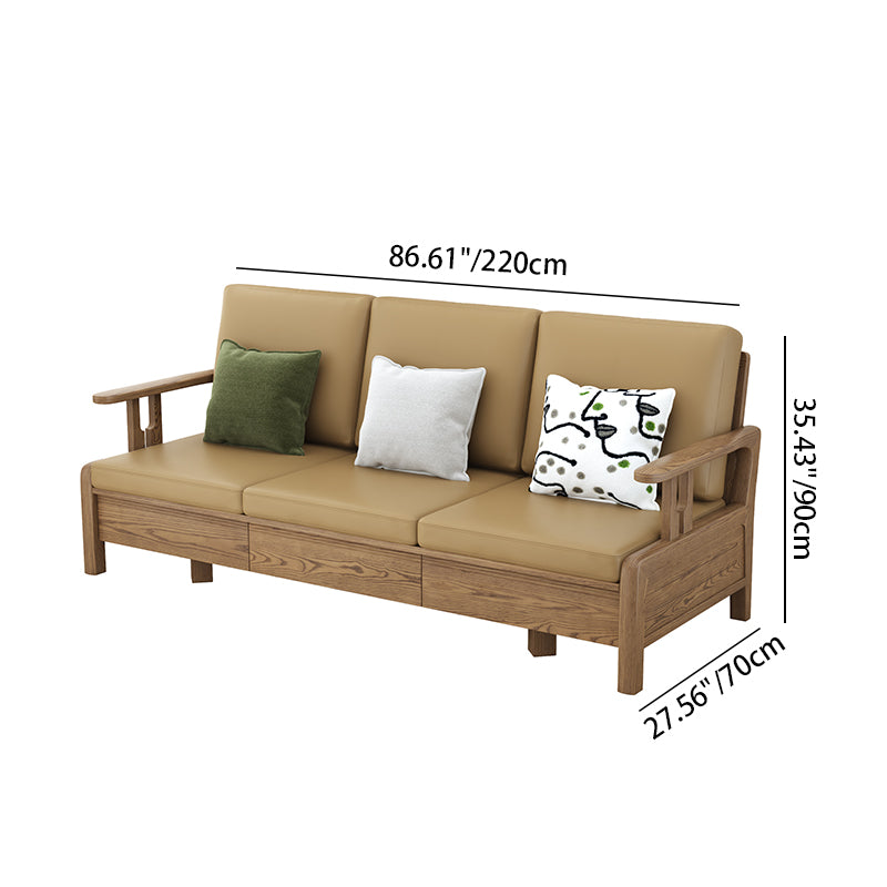 Crafted from solid North American ash wood, this sofa features a warm Light Walnut finish that highlights natural grain and timeless craftsmanship. Its low-profile, horizontally extended silhouette brings a calm, balanced presence to modern living spaces. Plush seat cushions combine high-resilience foam and eco leather for supportive, comfortable seating. Soft back cushions filled with down and fiber blend provide a relaxed, sink-in feel.