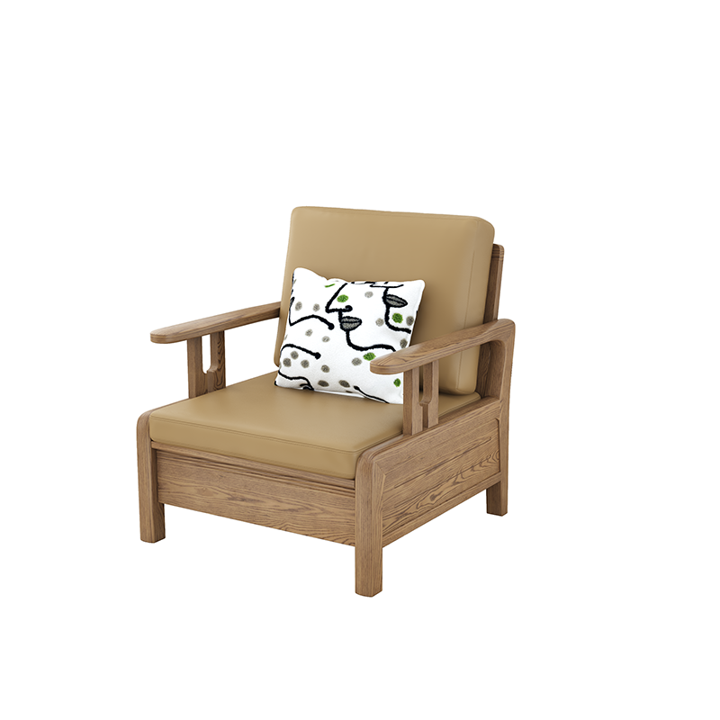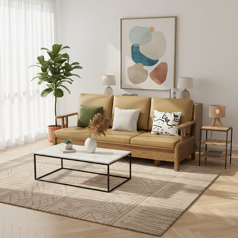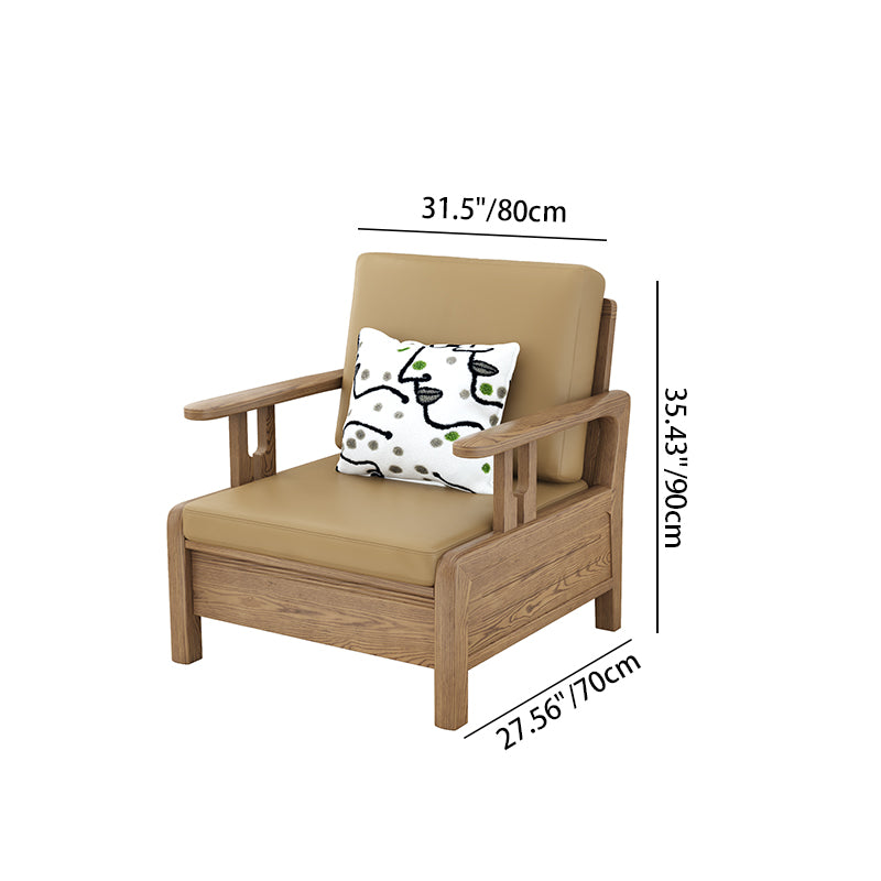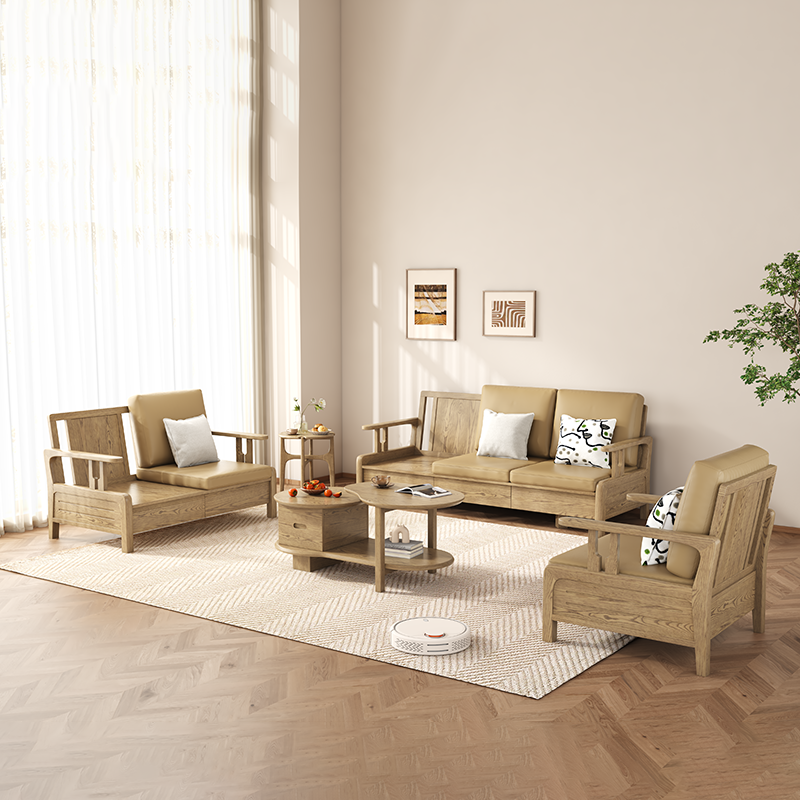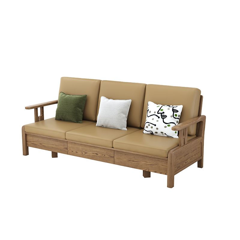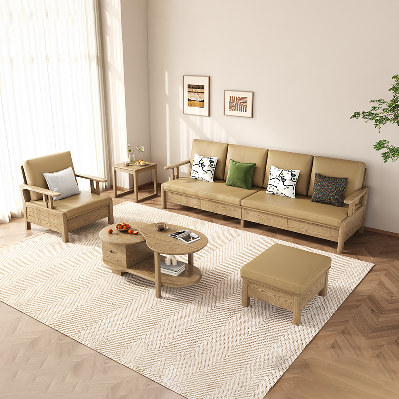 Crafted from solid North American ash wood, this sofa features a warm Light Walnut finish that highlights natural grain and timeless craftsmanship. Its low-profile, horizontally extended silhouette brings a calm, balanced presence to modern living spaces. Plush seat cushions combine high-resilience foam and eco leather for supportive, comfortable seating. Soft back cushions filled with down and fiber blend provide a relaxed, sink-in feel.