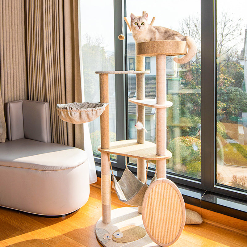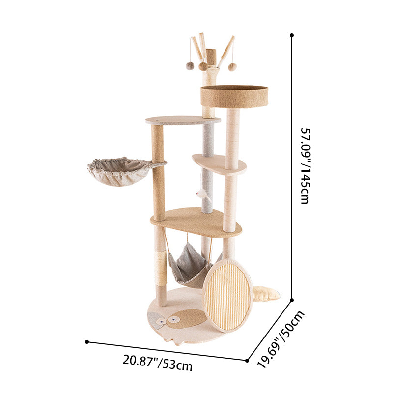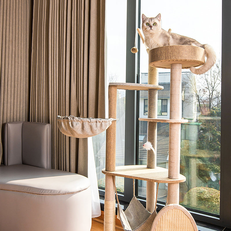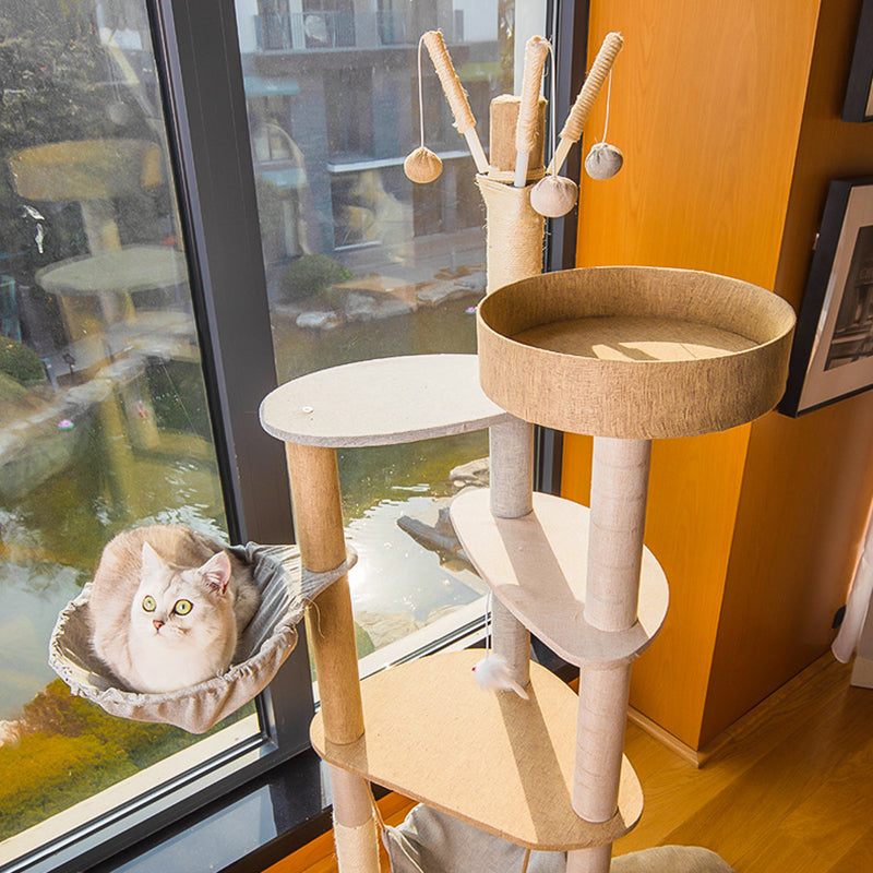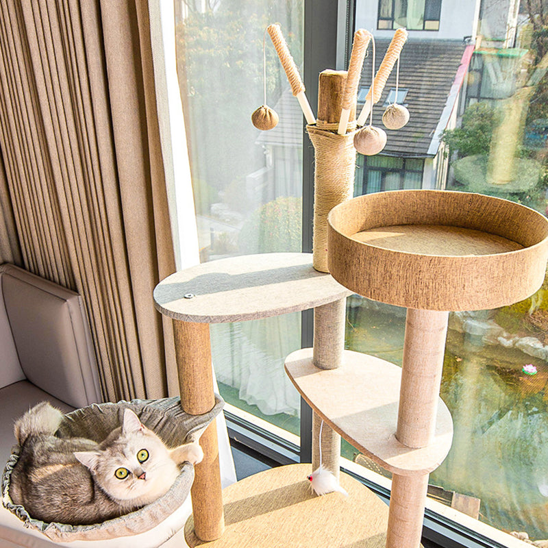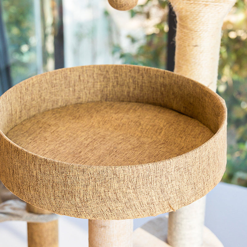 Engineered specifically for the dynamics of multi-cat households, this expansive tower offers a strategic multi-level layout that encourages climbing, perching, and social play. The structural pillars are integrated with heavy-duty natural sisal scratching posts, providing a rugged and durable outlet for grooming that keeps your furniture safe from claws. From the "cloud-soft" sleeping tiers to the elevated observation decks, every inch is designed for all-season comfort and stability. Optimized for North American consumers searching for modern 4-tier cat trees, linen-fabric pet furniture, E1 engineered wood cat towers, and multi-level round cat climbers.
