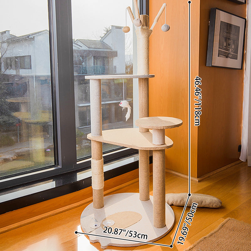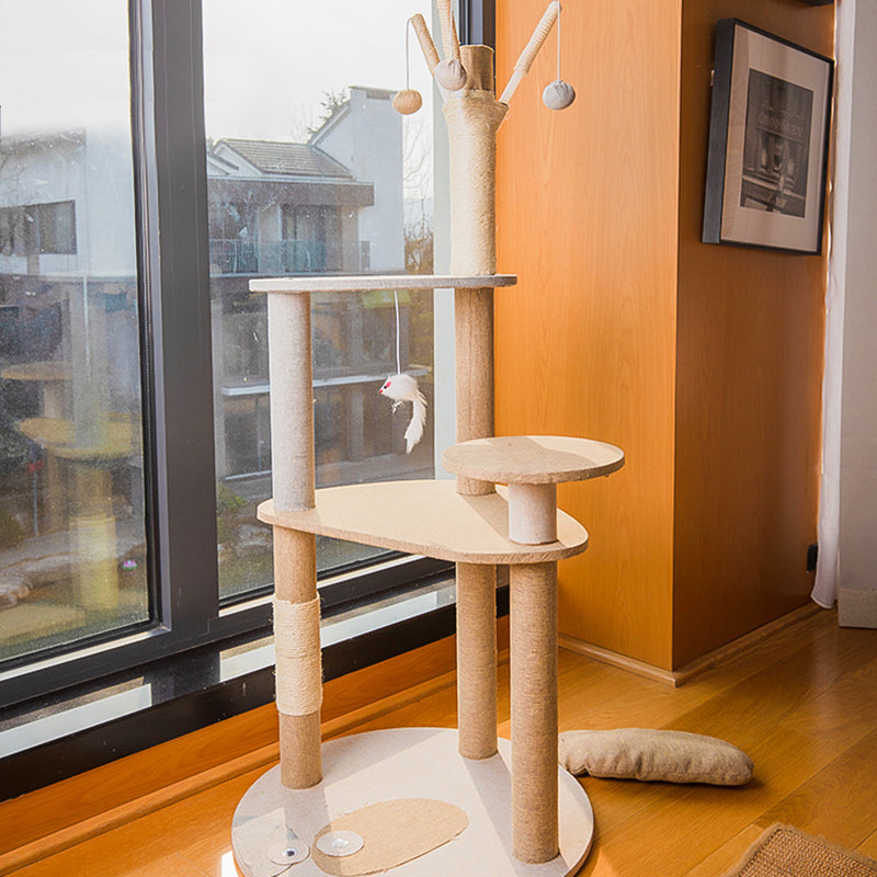 Redefine vertical play with this contemporary creative 3-tier cat tree, a "high-rise" sanctuary designed for the modern pet home. Precision-crafted from E1-grade eco-friendly engineered wood, this tower features a sophisticated round, space-saving silhouette that eliminates sharp corners and bulky profiles. The exterior is upholstered in a premium linen-look fabric, providing a high-end, tactile finish that complements "Modern Farmhouse" and "Coastal" interior styles. Finished in a soft light camel and white palette, it serves as a bright, airy accent piece that elevates the aesthetic of any living room or bedroom.