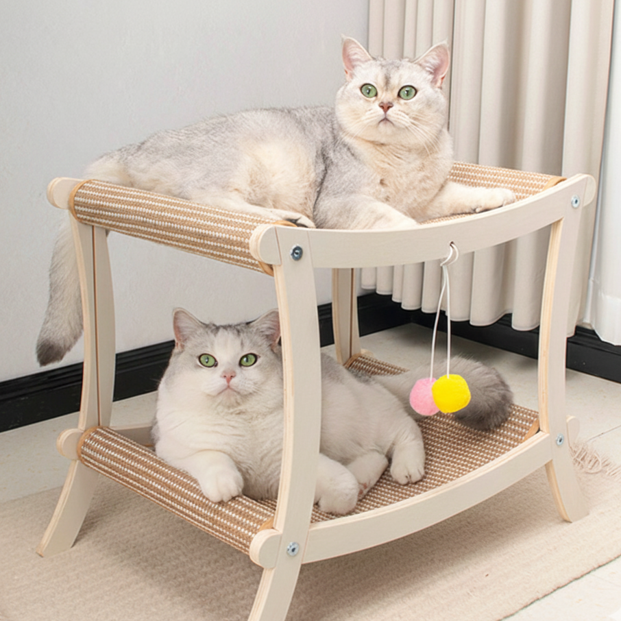 Engineered for "dual-level versatility," this tower serves as both a high-performance scratch-resistant activity center and a serene lounging retreat. The platforms are integrated with heavy-duty natural sisal mats, providing a rugged, low-shed surface that satisfies scratching instincts while offering "cooling comfort" during the summer months. The sturdy double-level layout allows for multi-cat engagement, providing an elevated observation deck for perching and a stable ground floor for deep, year-round rest. Optimized for North American consumers searching for solid wood cat trees, modern 2-tier cat furniture, minimalist sisal scratchers, and aesthetic wooden pet towers.