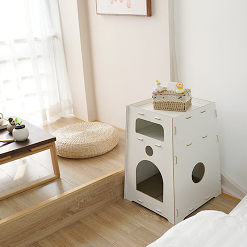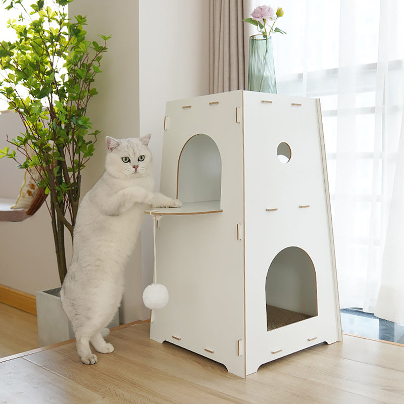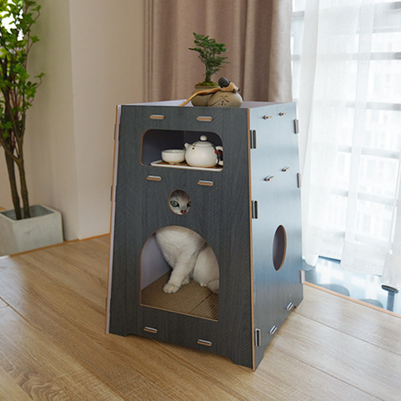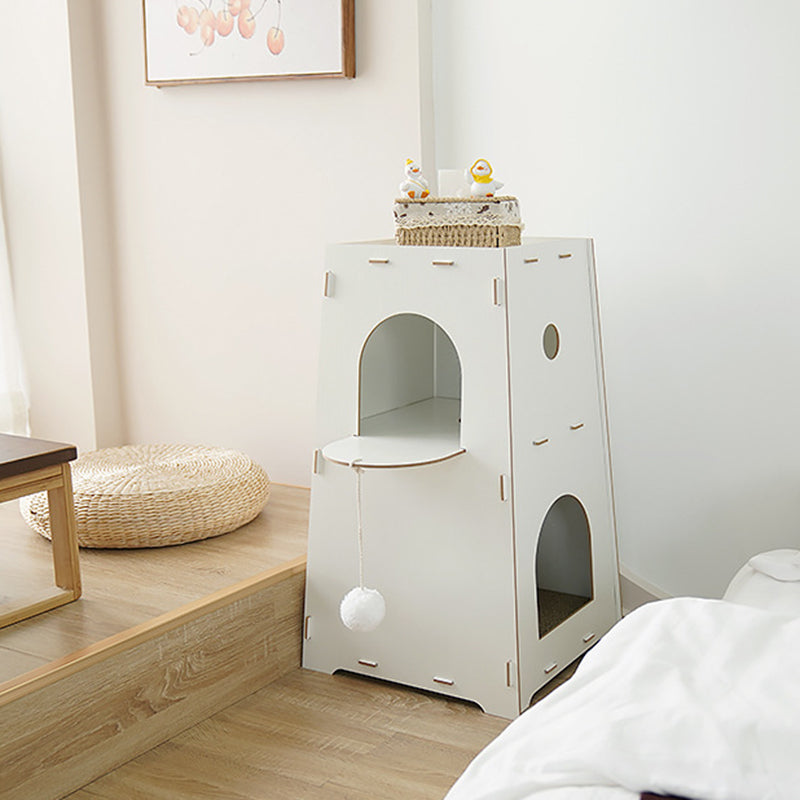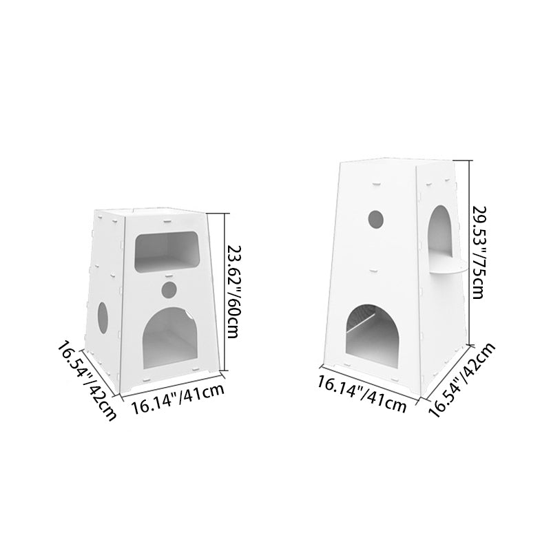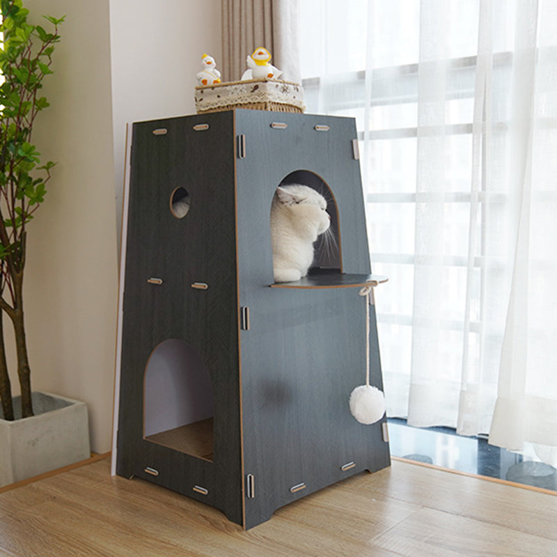 Elevate your pet’s lounging experience with this modern two-level cat house. Expertly crafted from durable, eco-friendly MDF, the stable reinforced structure ensures a secure and long-lasting retreat for cats and small dogs alike. Featuring a sleek trapezoid silhouette in a contemporary dark gray and white palette, this scratch-resistant sanctuary blends seamlessly into any stylish living room.