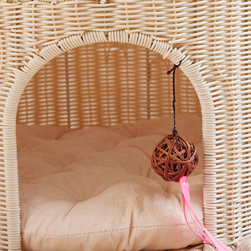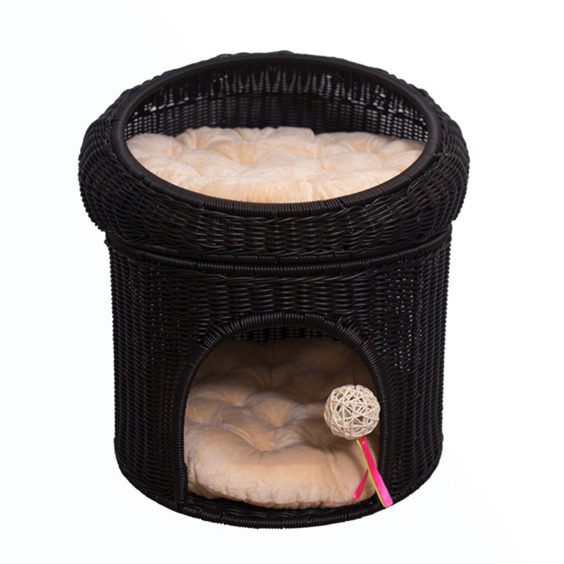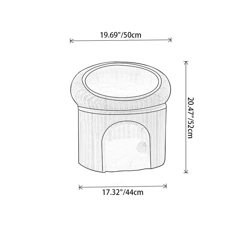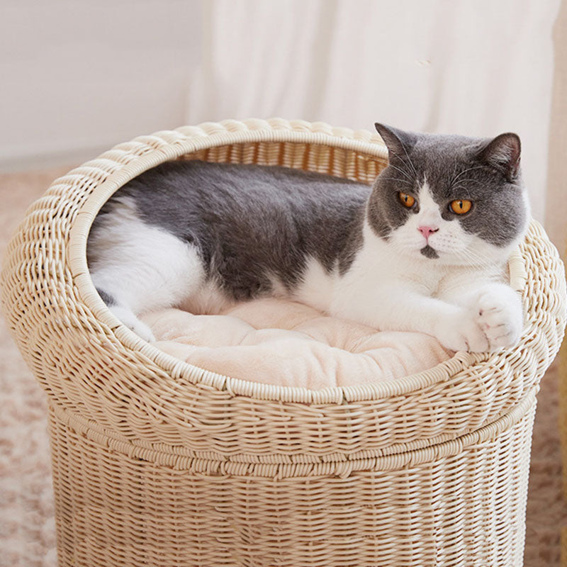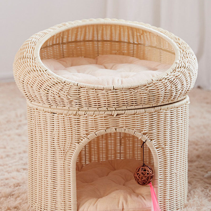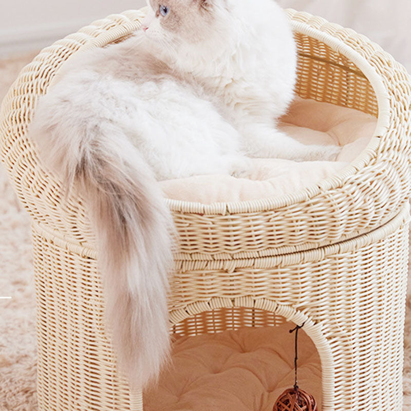Traditional Rustic Cylindrical PP Faux Rattan & Genuine Rattan Weaving Iron Fleece Cat Bed 2-Tier For Living Room & Bedroom