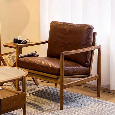 Traditional Vintage Rectangular Oil-Waxed Leather Solid Wood Accent Chair Backrest Armrest For Living Room