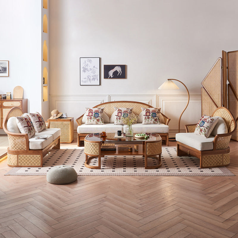 Contemporary Boho Curved Solid Wood Rattan Linen Accent Chair Backrest Armrest For Living Room