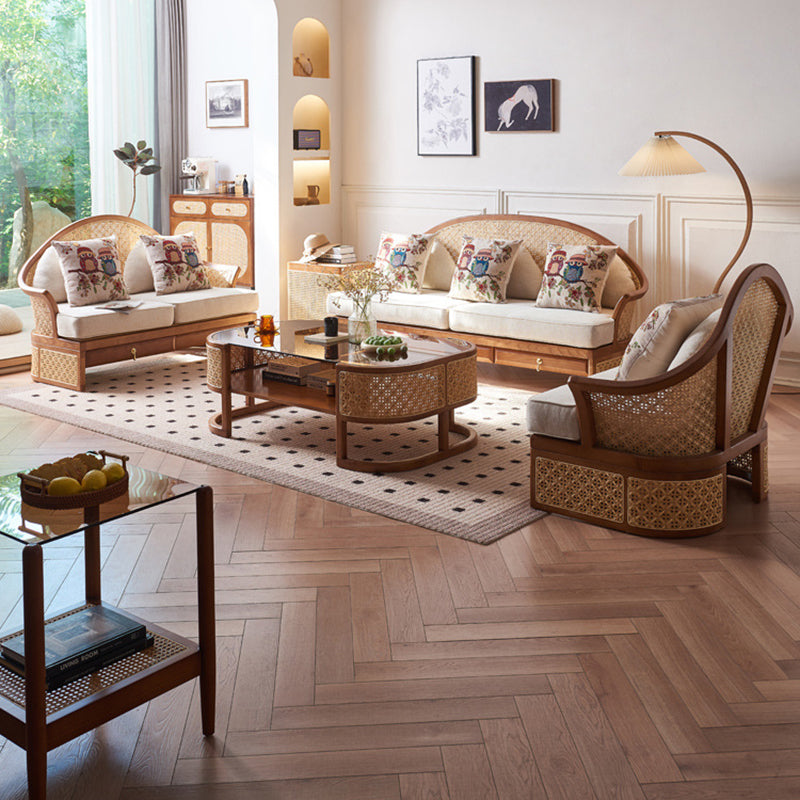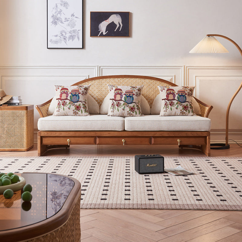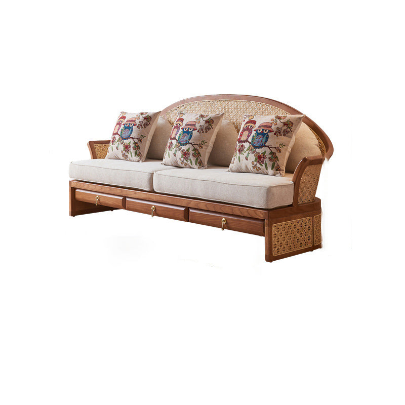 Elevate your living space with this contemporary Bohemian sofa chair crafted from solid wood and breathable rattan, featuring a soft cotton-linen cushion and high-resilience foam for lasting comfort. Designed in a stylish curved rectangular shape, it includes armrests, a supportive backrest, and a hidden drawer for convenient storage. The lightweight yet sturdy structure in elegant off-white makes it perfect for modern lounges, clubhouses, or living rooms.