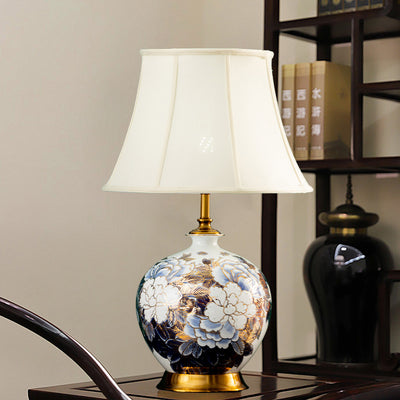 Lampe de table à 1 lumière en forme de cône en tissu floral en céramique minimaliste chinois