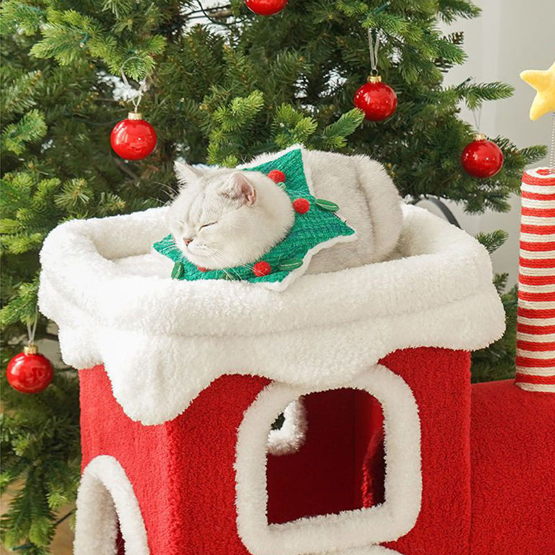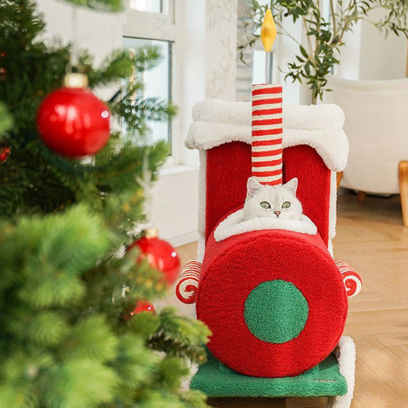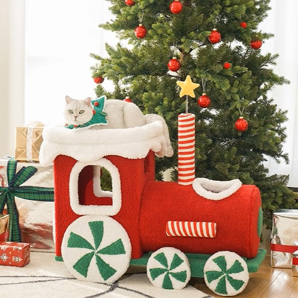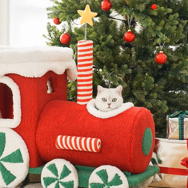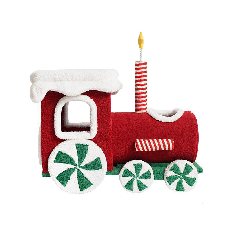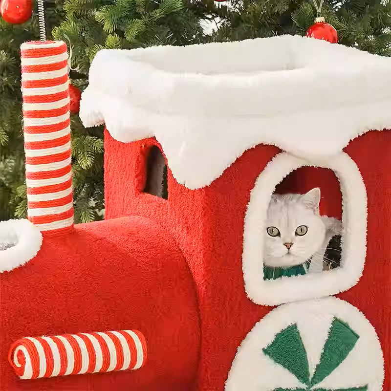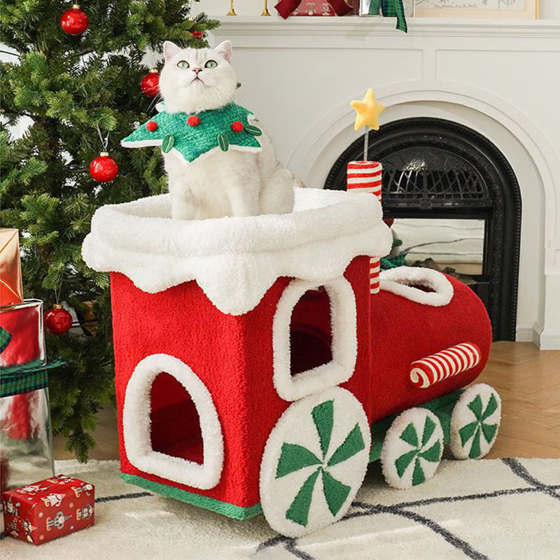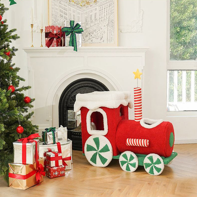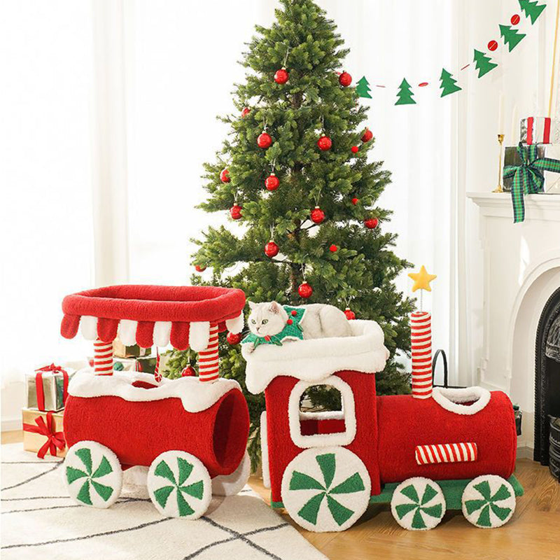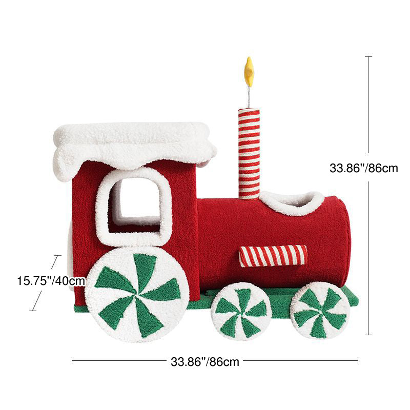 All aboard the fun express! Bring whimsical holiday cheer and superior comfort to your home with this unique Christmas-themed locomotive-shaped cat bed. The innovative design features two connected cozy nests, offering a warm, exceptionally spacious sleeping and lounging space—perfectly suited for multi-cat homes. This adorable structure doubles as a fun, winter-ready hideaway and a charming, stylish pet décor piece.