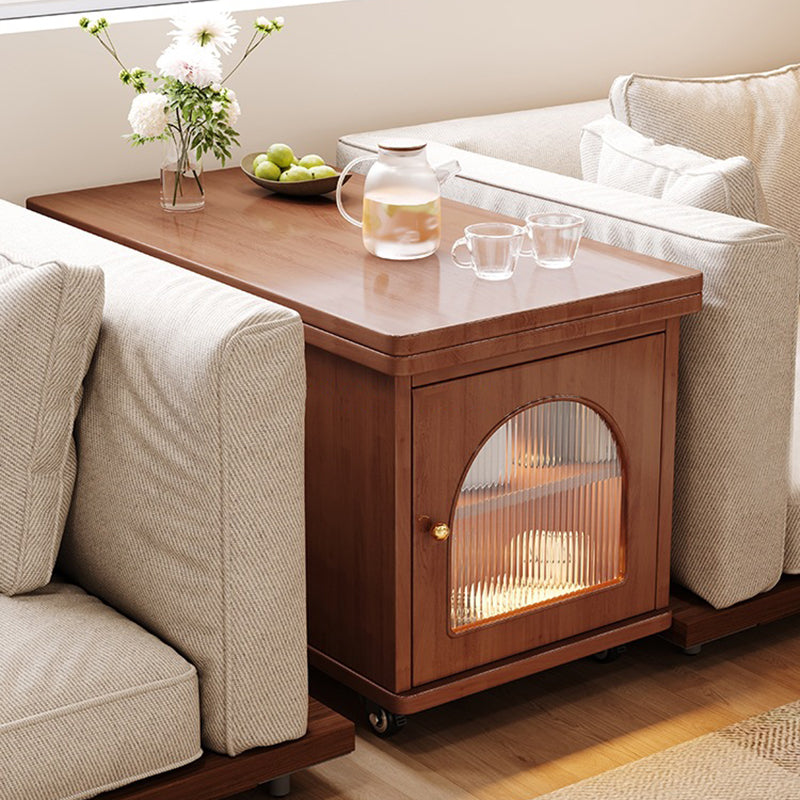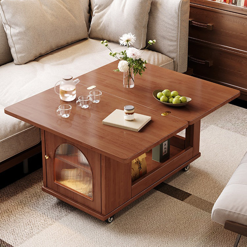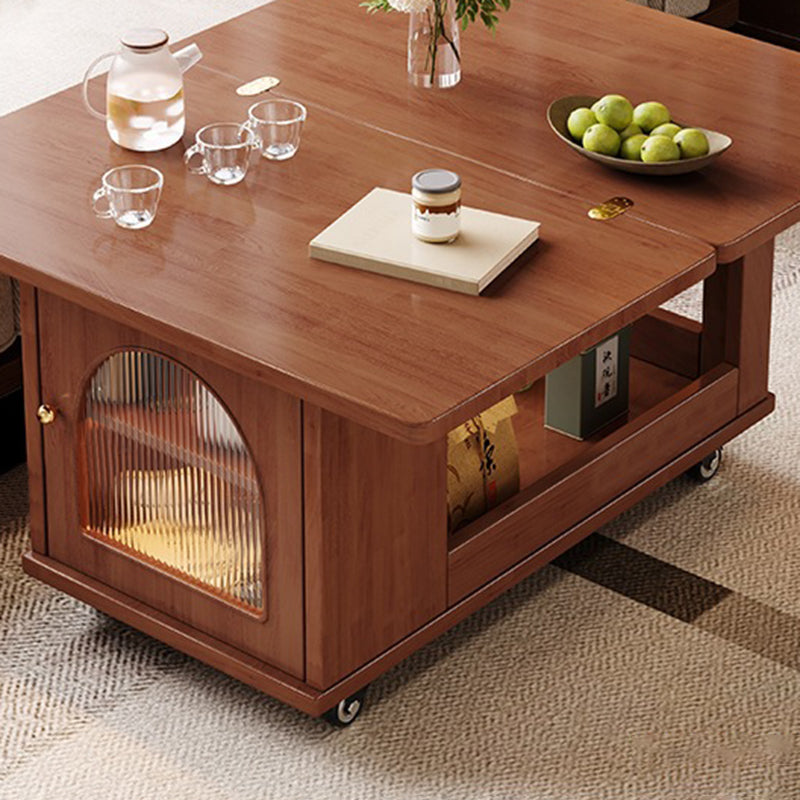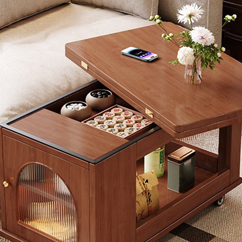 Crafted from solid wood and tempered glass, this modern rolling cart–style coffee table features a rotating, foldable tabletop, two spacious drawers, and a two-tier open storage design ideal for organizing living room essentials. Available in walnut, white, black, and natural wood finishes, it offers four-sided access, convenient side compartments, and smooth 360° caster wheels for effortless movement in compact or multifunctional spaces.