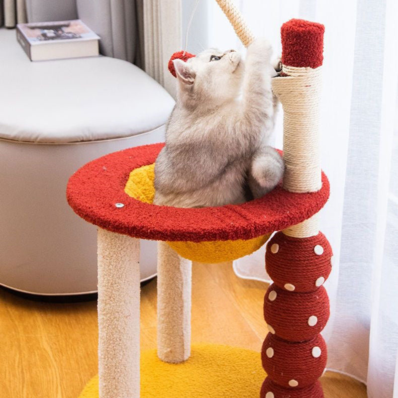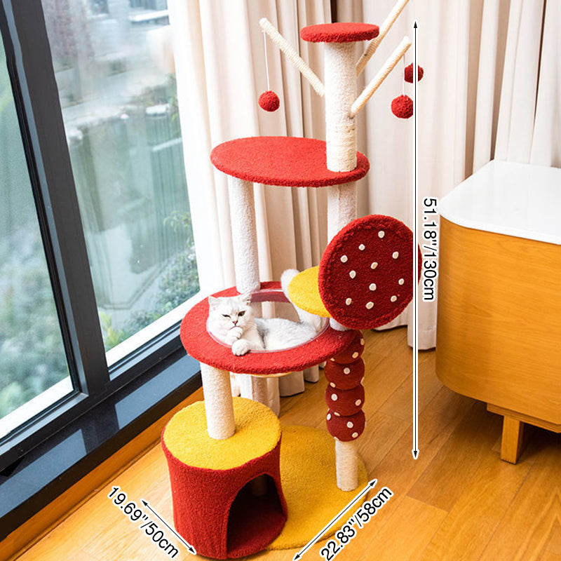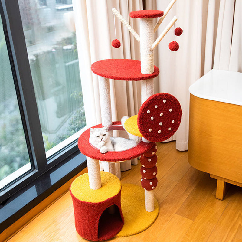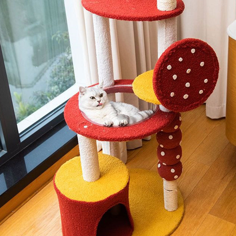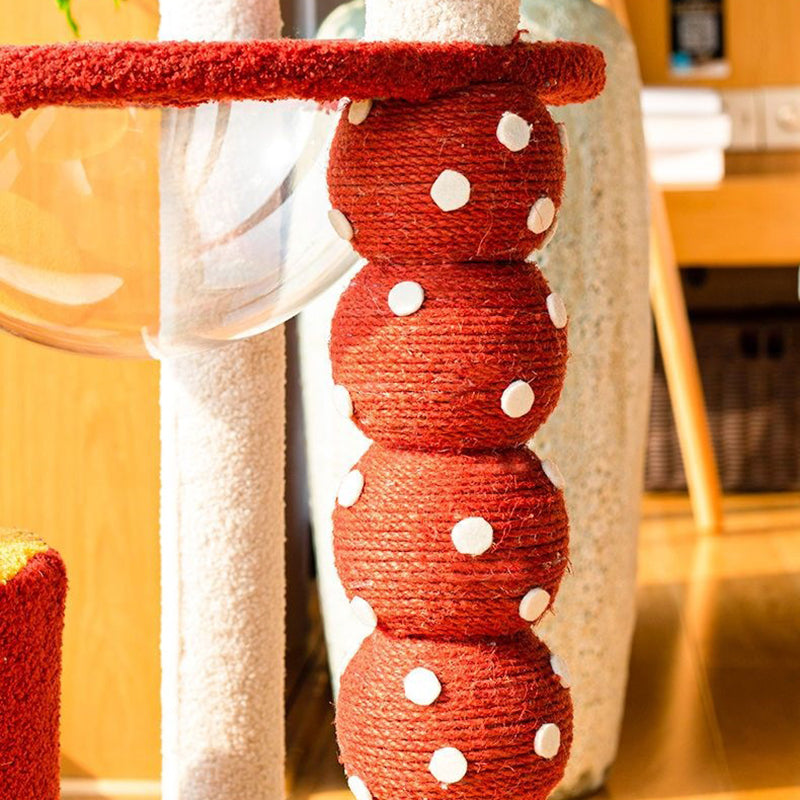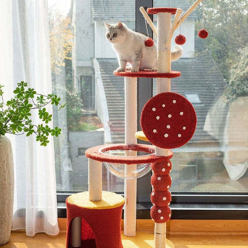 The ultimate luxury feature is the integrated acrylic capsule, offering a secure, panoramic viewing spot ideal for cozy napping and elevated lounging. Soft fabric lounges across the platforms ensure comfort, while the entire unit provides comprehensive options for climbing, scratching, sleeping, and play. Available in vibrant red and cheerful yellow, this durable, stylish cat tower is optimized for North American consumers searching for modern round cat trees, multi-level acrylic cat condos, candied fruit scratching posts, and colorful furniture solutions for multi-cat families.