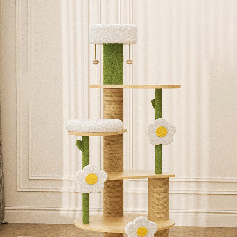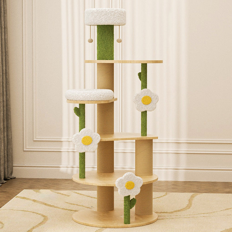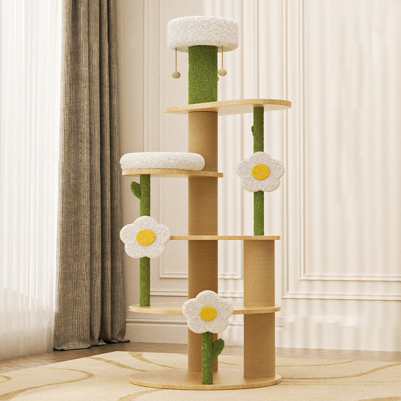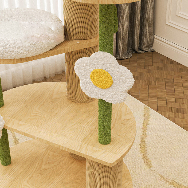 Designed specifically for multi-cat households, the expansive 6-tier layout provides ample vertical space with dedicated zones for climbing, elevated lounging, and satisfying scratching. The design introduces a charming, modern cottage vibe to any room. Available in clean green, crisp white, and natural wood tones, this durable, high-capacity tower is optimized for North American consumers searching for solid wood 6-tier cat trees, daisy-inspired pet furniture, round plush and sisal condos, and large multi-cat wooden towers for living rooms or bedrooms.