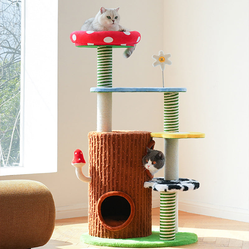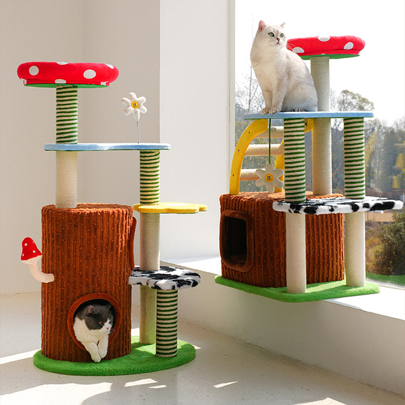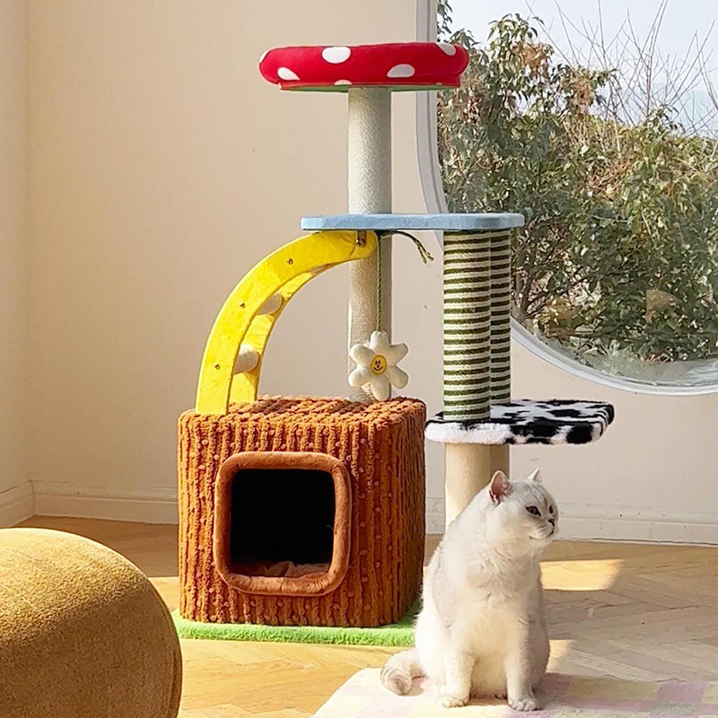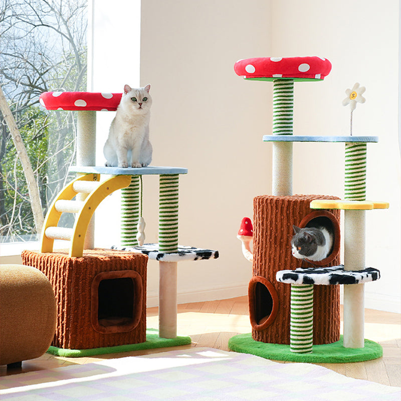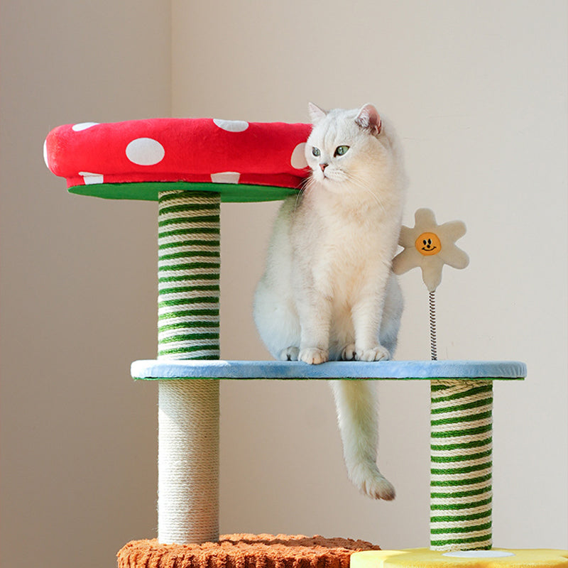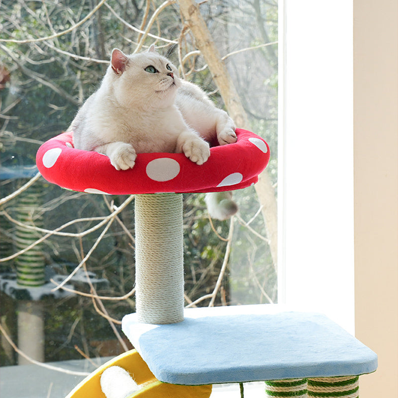 Perfectly suited for multi-cat homes, this tower provides customizable height with options for a 3- or 4-tier layout. It offers dedicated spaces for climbing, cozy resting, and essential scratching, ensuring comprehensive enrichment. This durable, imaginative piece fits beautifully into any living room or bedroom, blending playful creativity with practical utility. Optimized for North American consumers searching for mushroom and tree-stump cat trees, colorful fairy-tale pet furniture, multi-tier sisal scratchers for multi-cats, and whimsical engineered wood cat condos.
