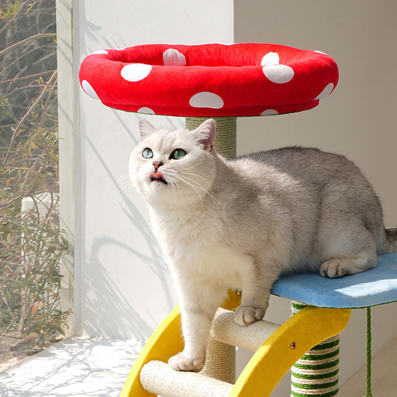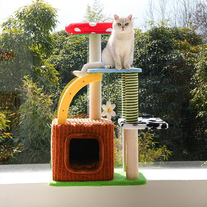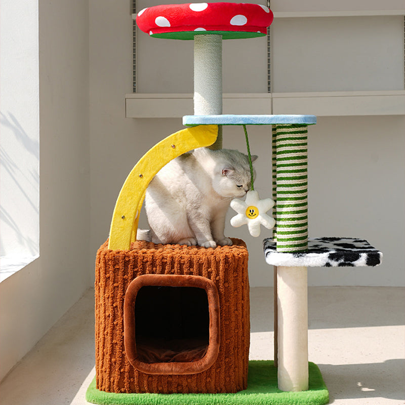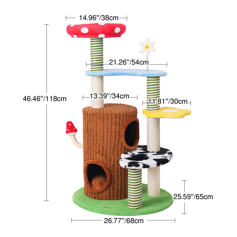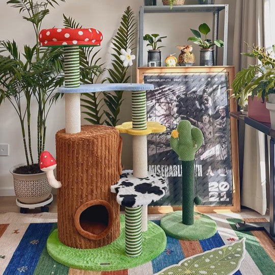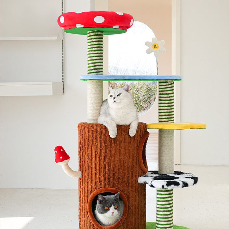 Perfectly suited for multi-cat homes, this tower provides customizable height with options for a 3- or 4-tier layout. It offers dedicated spaces for climbing, cozy resting, and essential scratching, ensuring comprehensive enrichment. This durable, imaginative piece fits beautifully into any living room or bedroom, blending playful creativity with practical utility. Optimized for North American consumers searching for mushroom and tree-stump cat trees, colorful fairy-tale pet furniture, multi-tier sisal scratchers for multi-cats, and whimsical engineered wood cat condos.