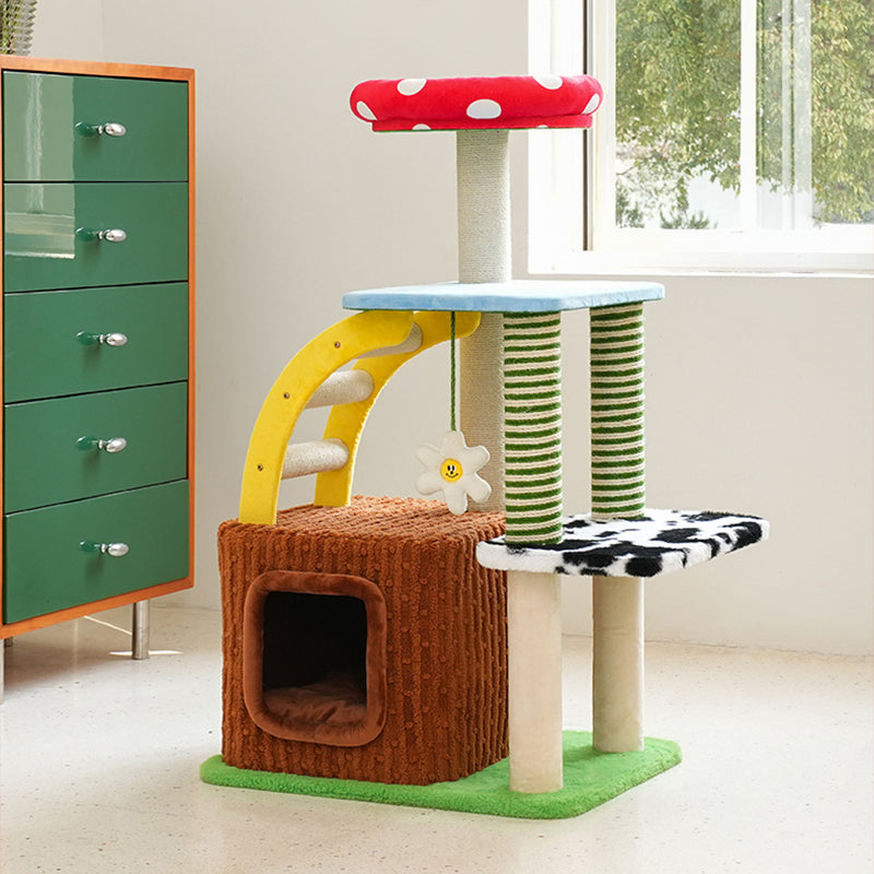 Transform your home into an enchanting pet playground with this colorful contemporary cat tree, designed with a whimsical fairy-tale forest theme. The structure features charming mushroom and tree-stump shapes, creating a visually stunning and highly engaging habitat. Built for stability and durability, the tower utilizes a sturdy internal blend of engineered wood and PVC panels, complemented by soft plush fabric and robust natural sisal wrapping.
