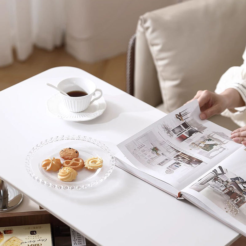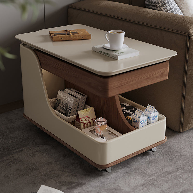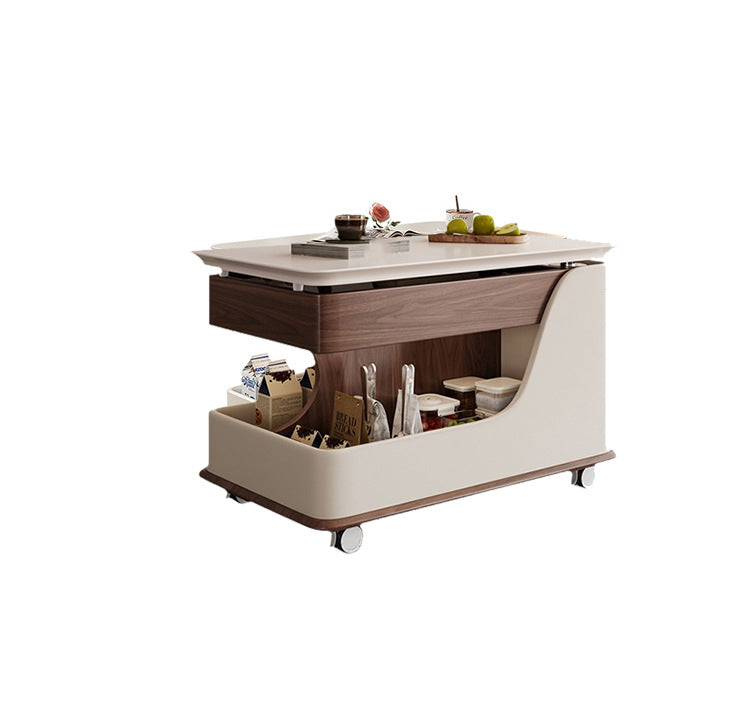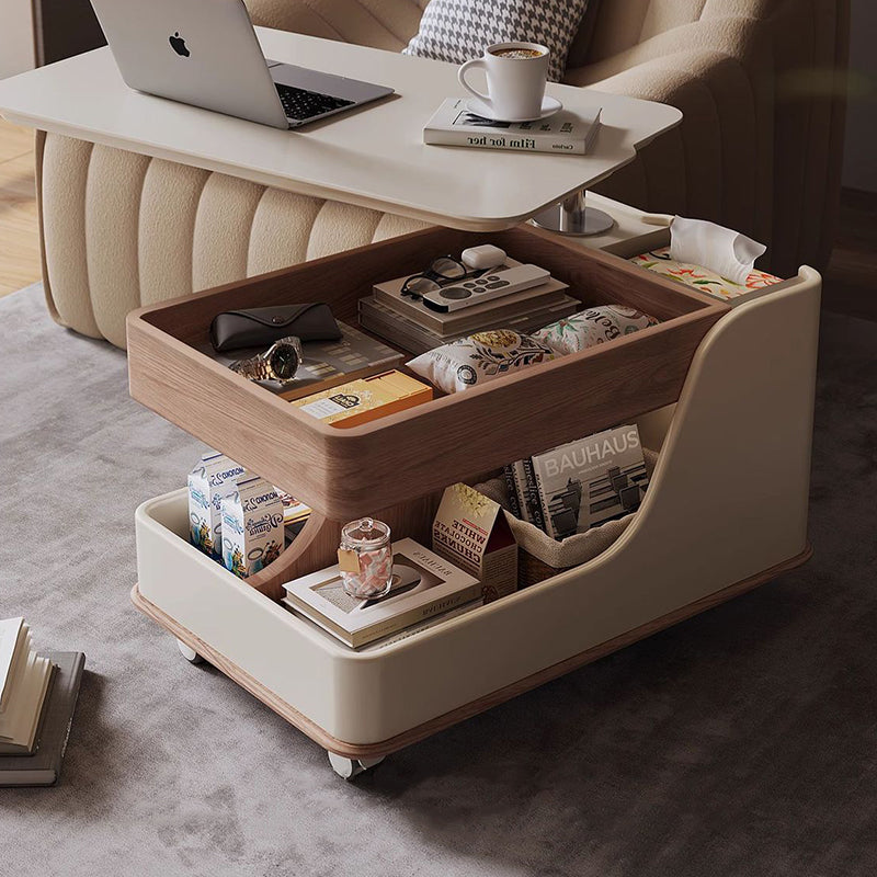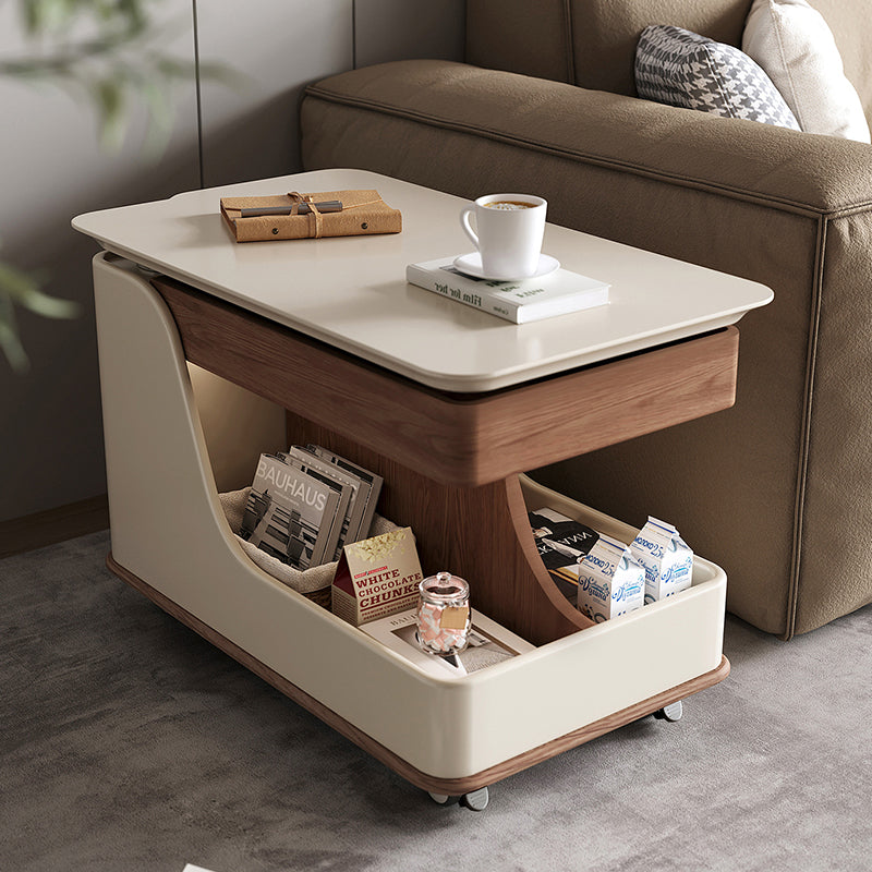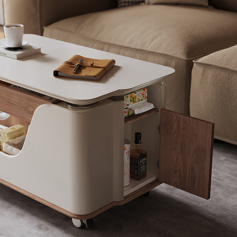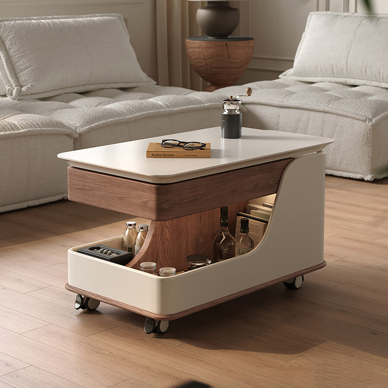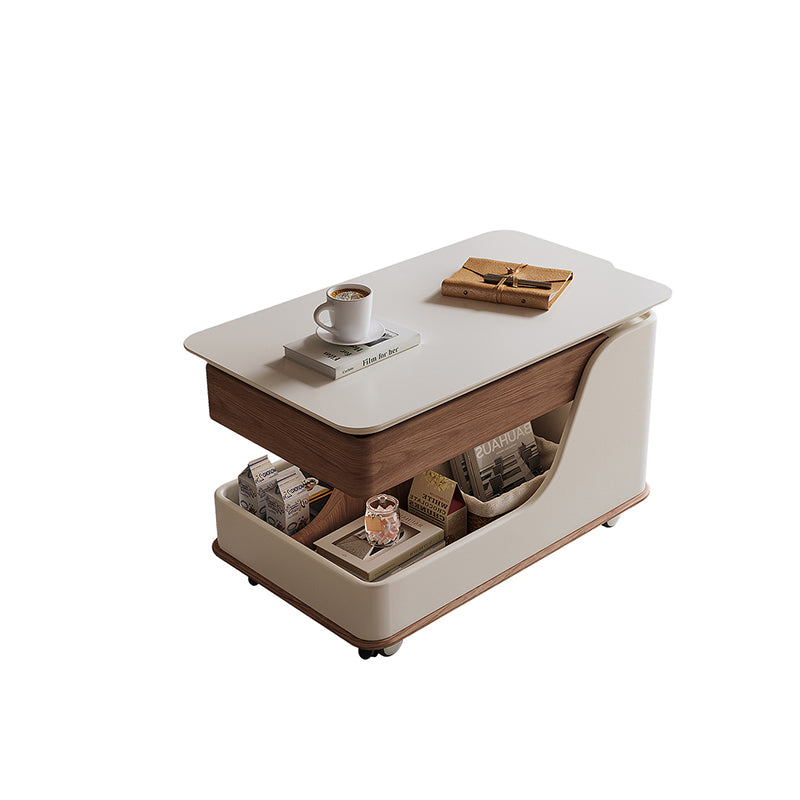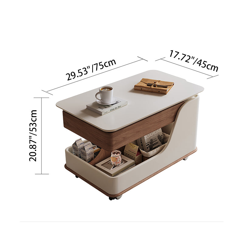 This contemporary coffee table combines sintered stone, tempered glass, engineered wood, and a metal frame with durable casters for smooth, silent mobility and one-touch brake. Available in walnut, black, and white, it features a lift-top surface, 3-tier storage and 360° rotation—perfect for small living rooms needing flexible, space-saving functionality.