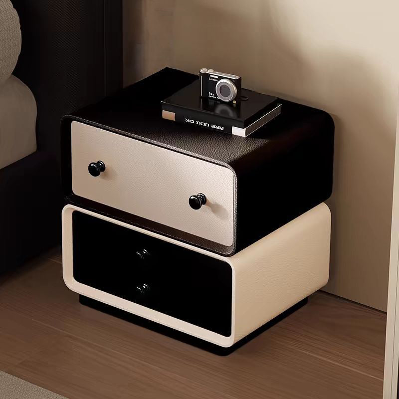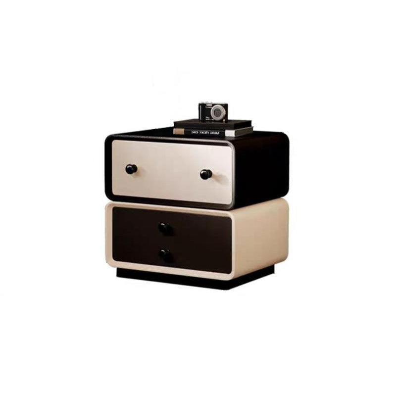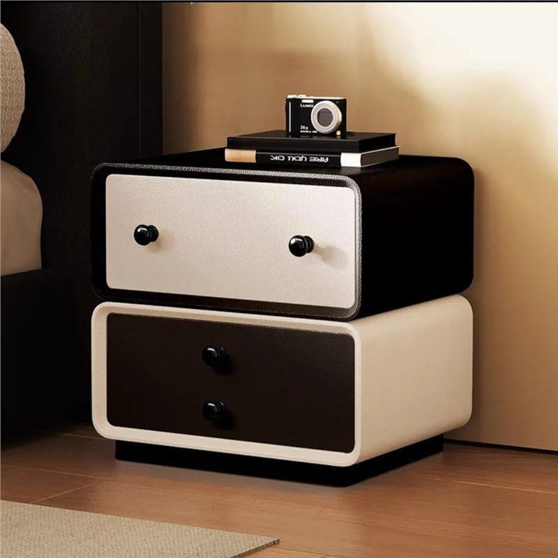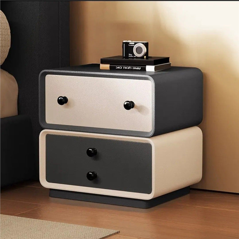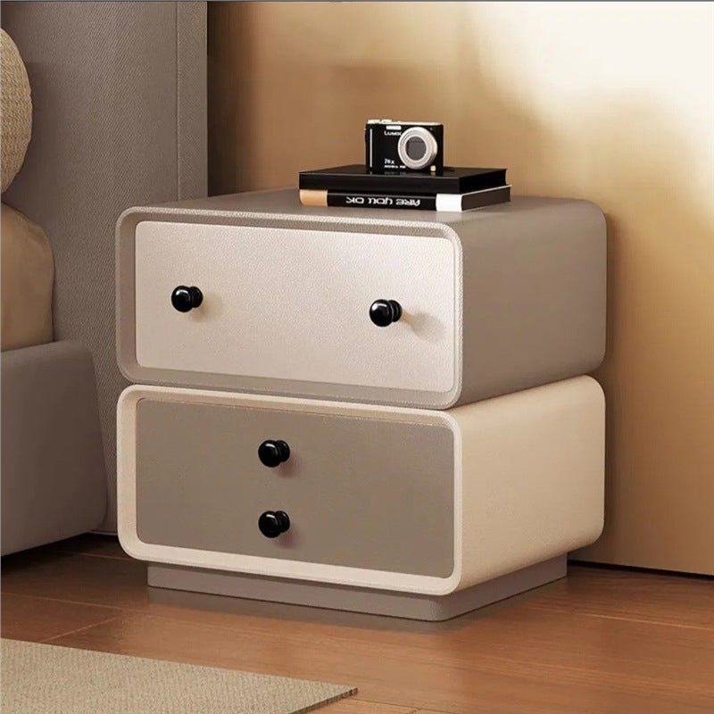 This contemporary creative nightstand combines solid wood with microfiber leather, featuring a child-friendly rounded-square design and two drawers equipped with smooth, quiet three-section slides. Available in black, beige, khaki, and dark gray, it offers durable water- and scratch-resistant surfaces, making it a safe and stylish storage solution for modern bedrooms.