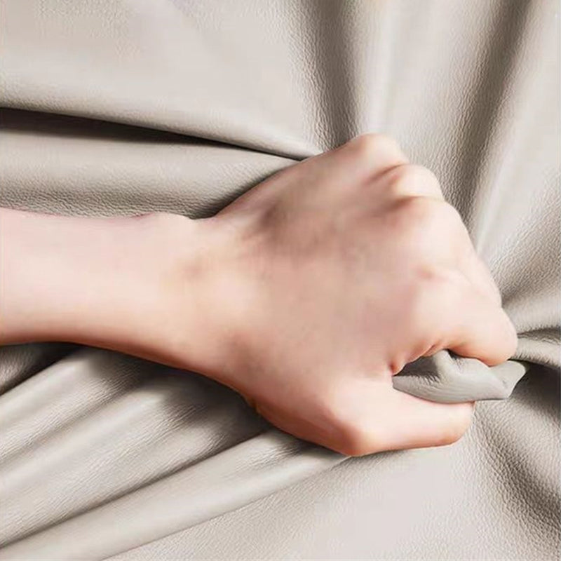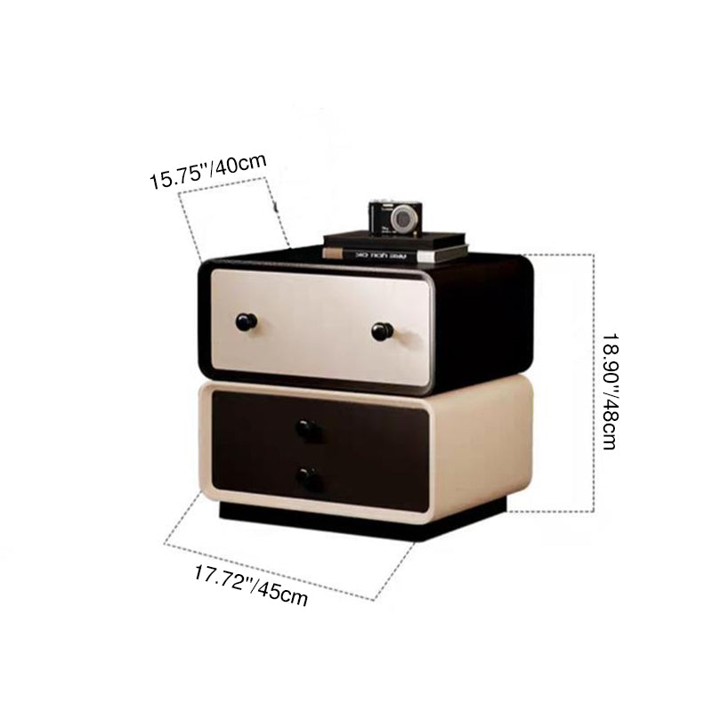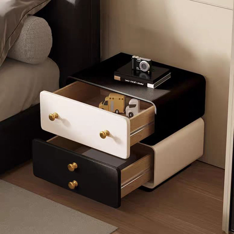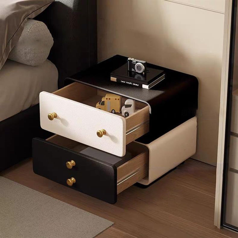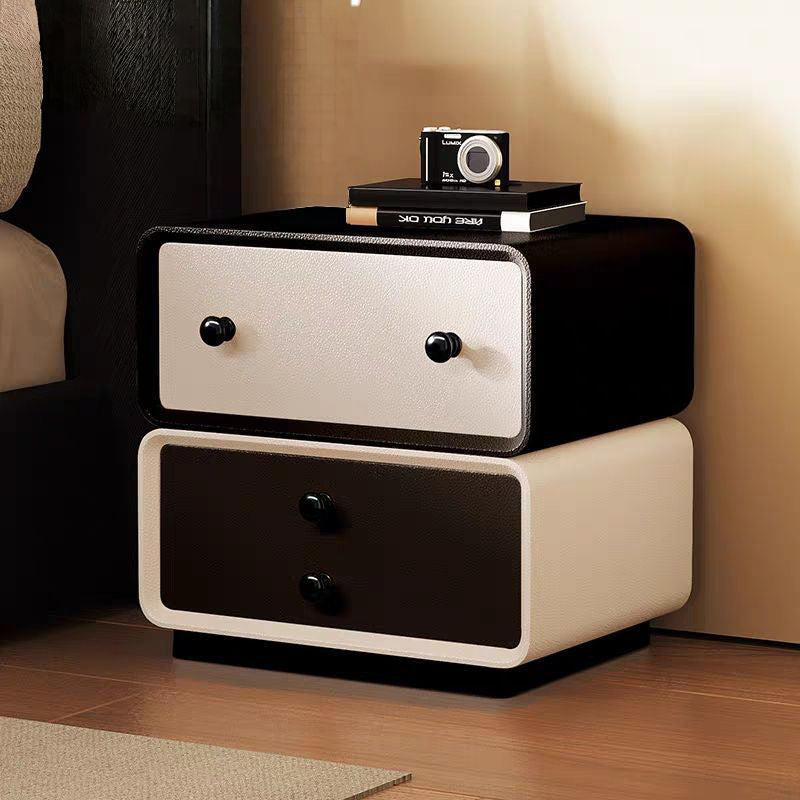 This contemporary creative nightstand combines solid wood with microfiber leather, featuring a child-friendly rounded-square design and two drawers equipped with smooth, quiet three-section slides. Available in black, beige, khaki, and dark gray, it offers durable water- and scratch-resistant surfaces, making it a safe and stylish storage solution for modern bedrooms.