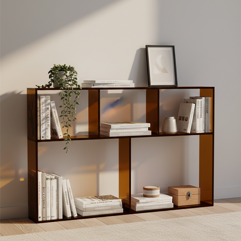 This modern minimalist acrylic display rack features a rectangular structure with 5 storage spaces and a 3-tier layout, offering strong weight-bearing performance for books, décor, or daily items. Available in green, smoke gray, and tea brown, it brings a sleek and functional touch to any living room space.