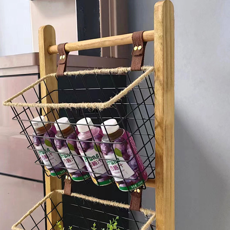 Modern Minimalist Rectangular Solid Wood Iron Rope Display Rack With 3-Basket For Living Room