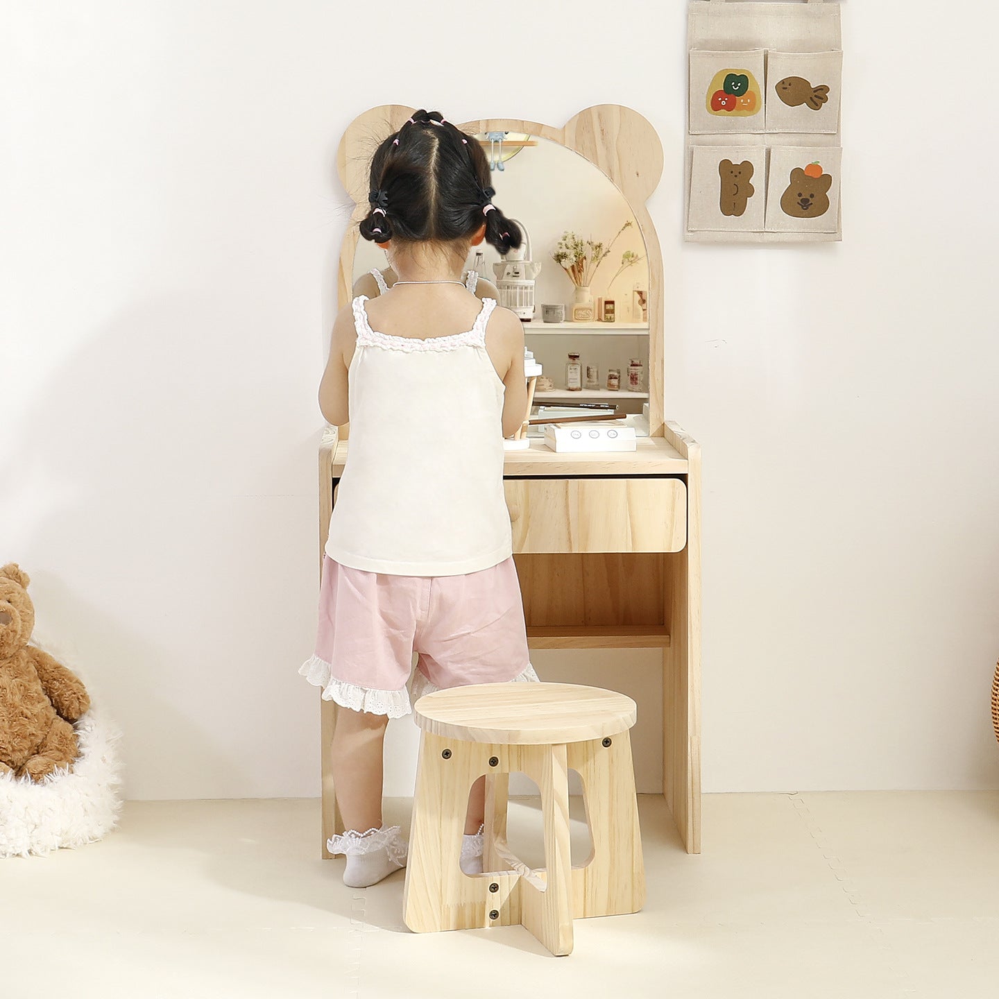 Adding a playful touch, the accompanying stool boasts an adorable bear-ear chair back, making this set perfectly sized for children or compact bedrooms. Functionally, the vanity includes one practical drawer for organizing essentials. This is an eco-friendly, durable choice that seamlessly adds both playful charm and natural elegance to your personal space.