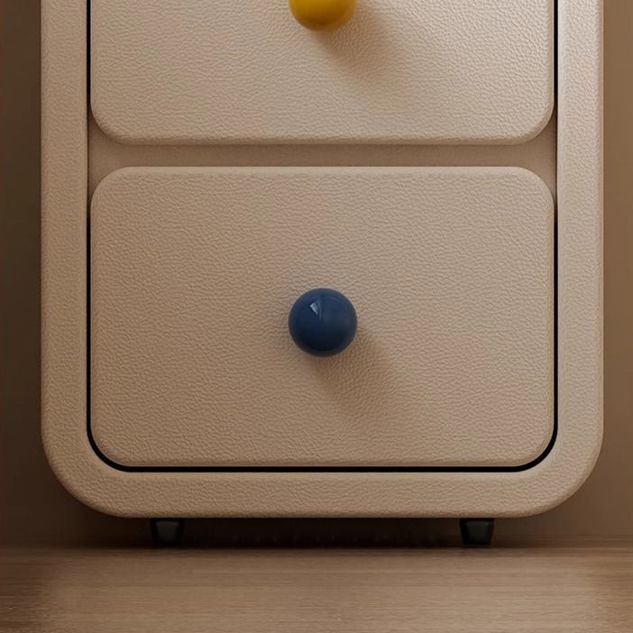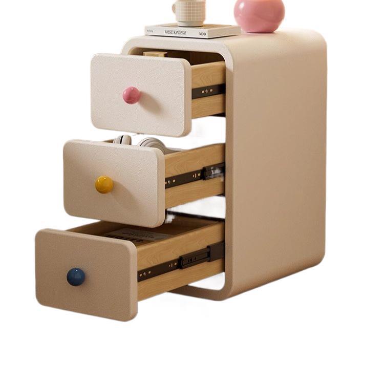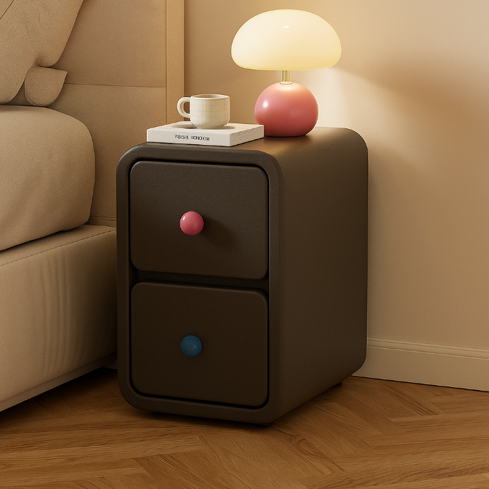 This Contemporary Creative nightstand combines solid wood, faux leather, and metal in a sleek rounded-rectangular design. Available in cream, gray, khaki, and black tones, it features elevated legs, smooth corners, and upgraded silent slides—blending luxury style with everyday functionality for modern bedrooms.