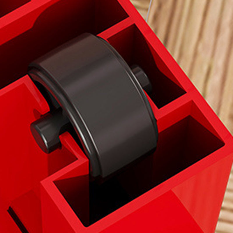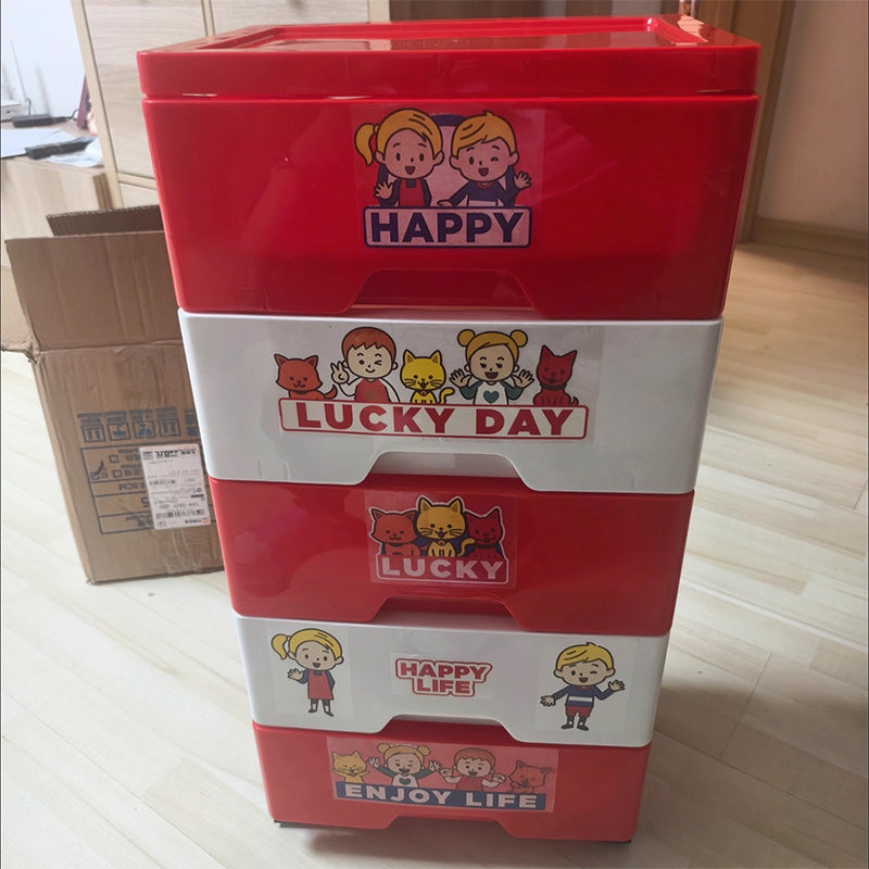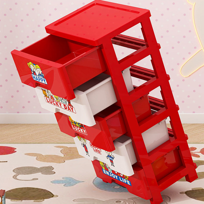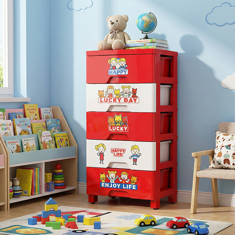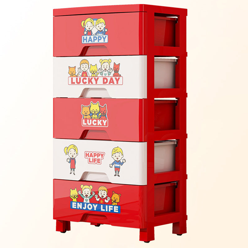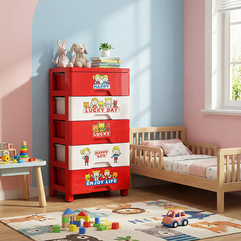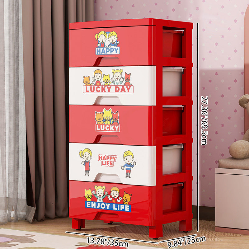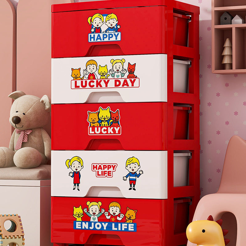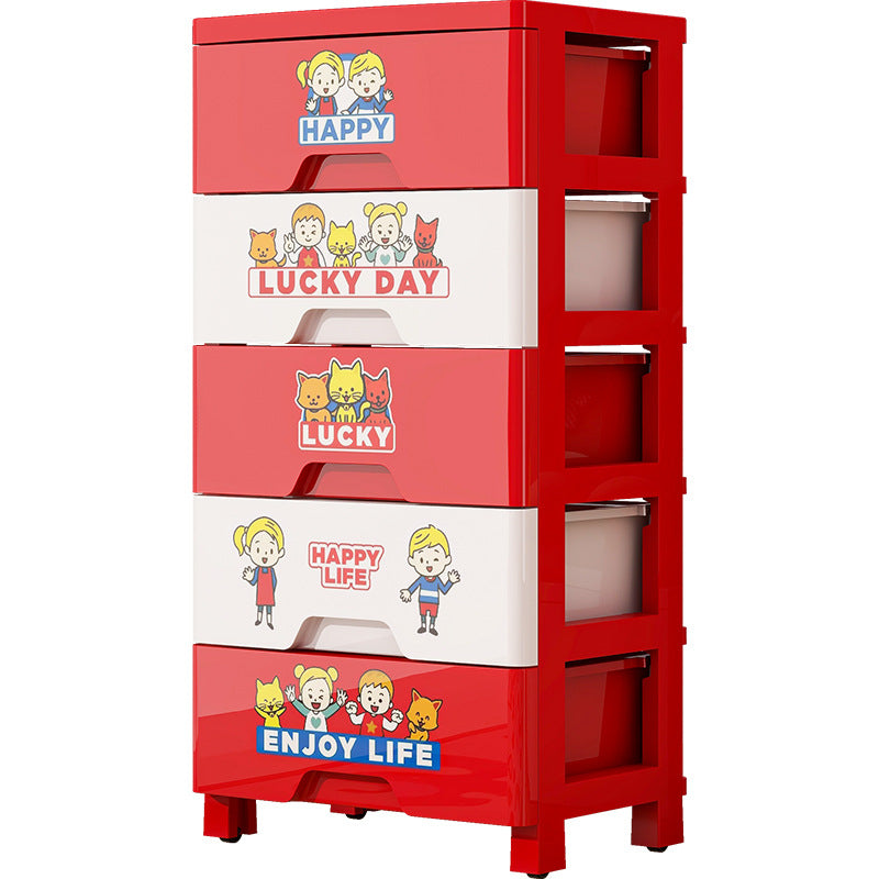 This contemporary PP plastic storage cabinet features a playful red-and-white color design, five spacious drawers for categorized storage, and smooth rolling wheels for easy movement without scratching floors. Its secure anti-slip buckle system keeps drawers in place, offering a durable and portable organization solution for living rooms or bedrooms.
