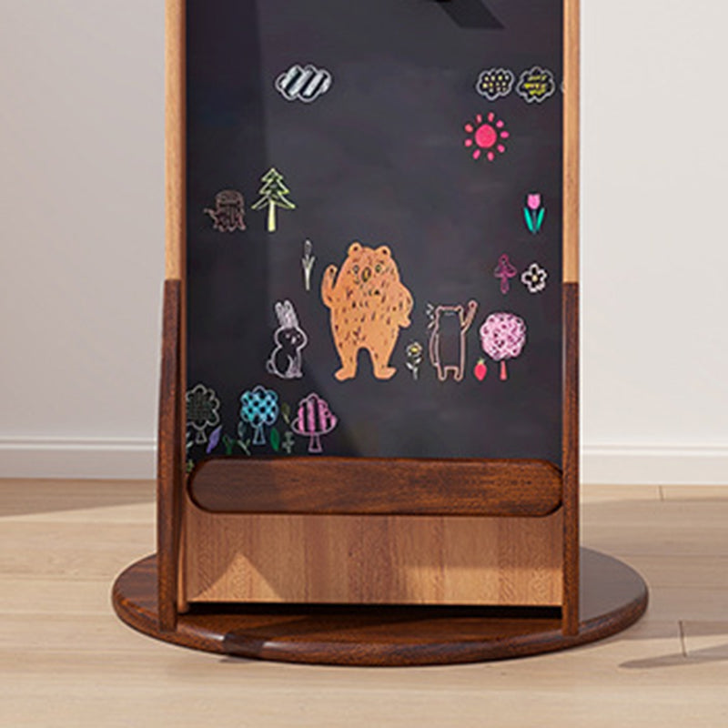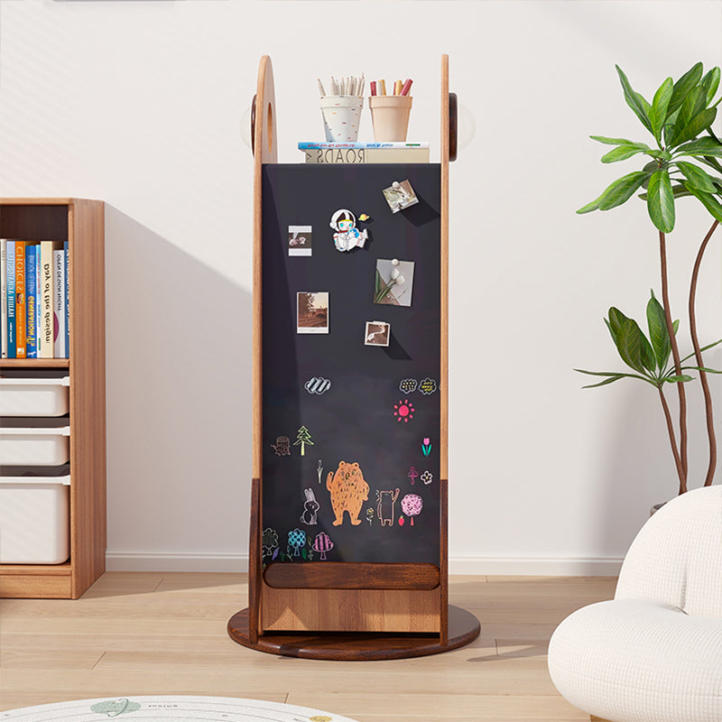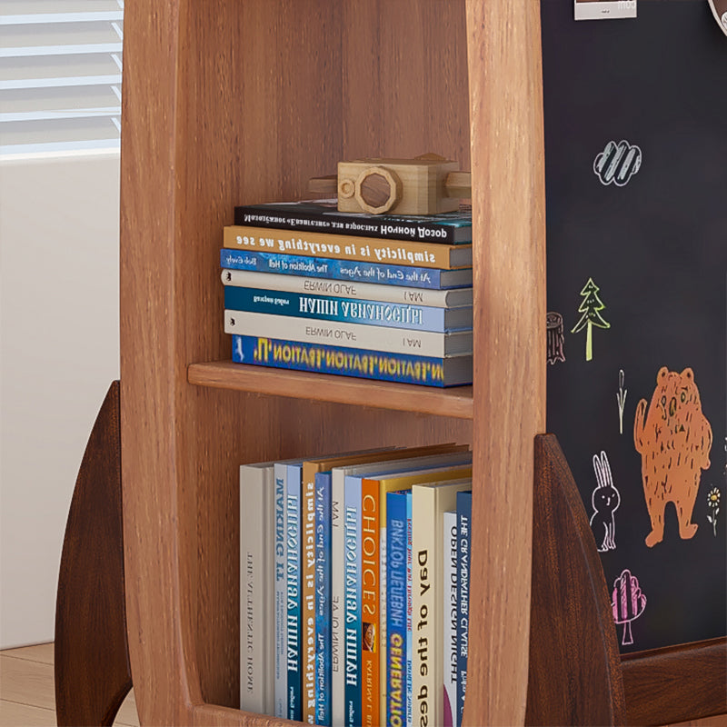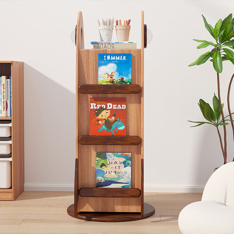 This contemporary, creative, solid wood rocket-shaped bookshelf features a warm walnut finish, a 4-tier layout, and a 360° rotating base for easy access. Designed with a magnetic doodle panel and a top storage area, it provides a fun and functional organization solution for kids' rooms, living rooms, or bedrooms.