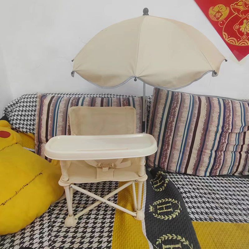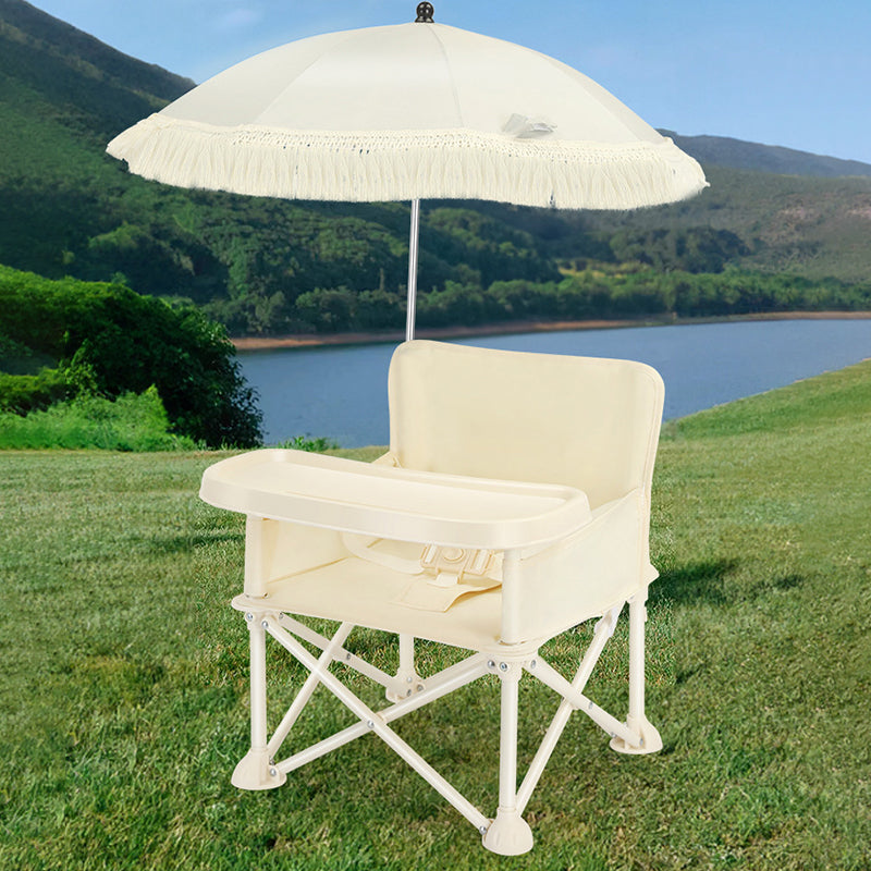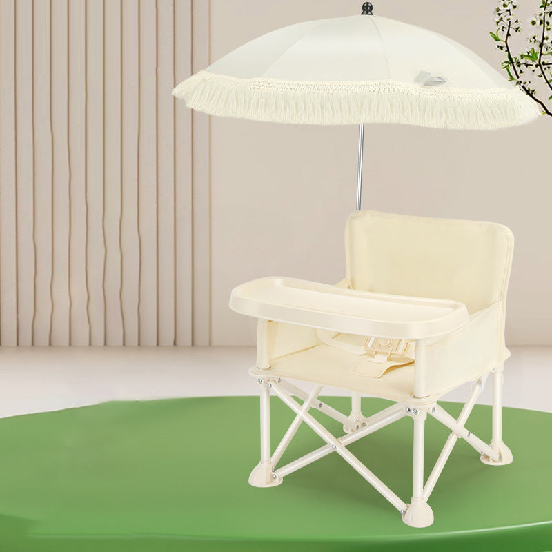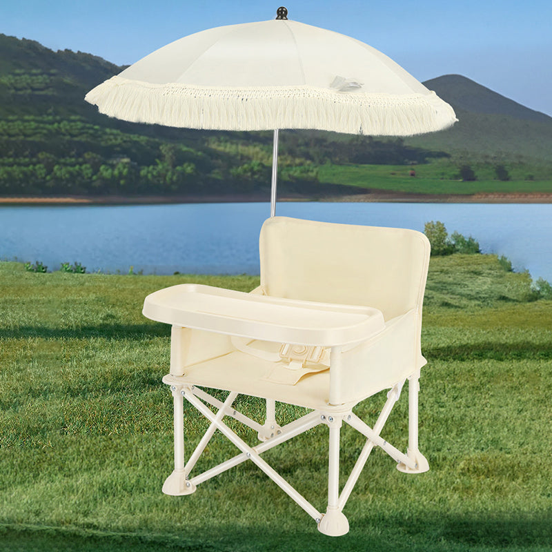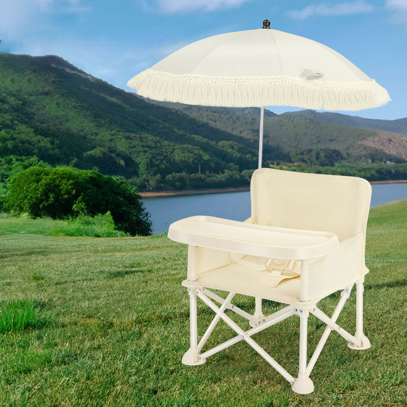 This modern minimalist baby dining chair features a foldable square design crafted from durable Oxford fabric, supported by a stable carbon steel frame. The chair comes in a clean beige color, while the optional sunshade umbrella is available in both beige and green. With a detachable tray, supportive backrest, armrests, and a rear storage pocket, it’s perfect for outdoor picnics, garden use, or restaurant seating.