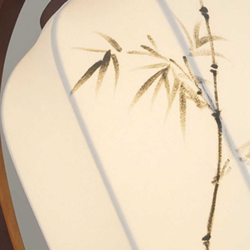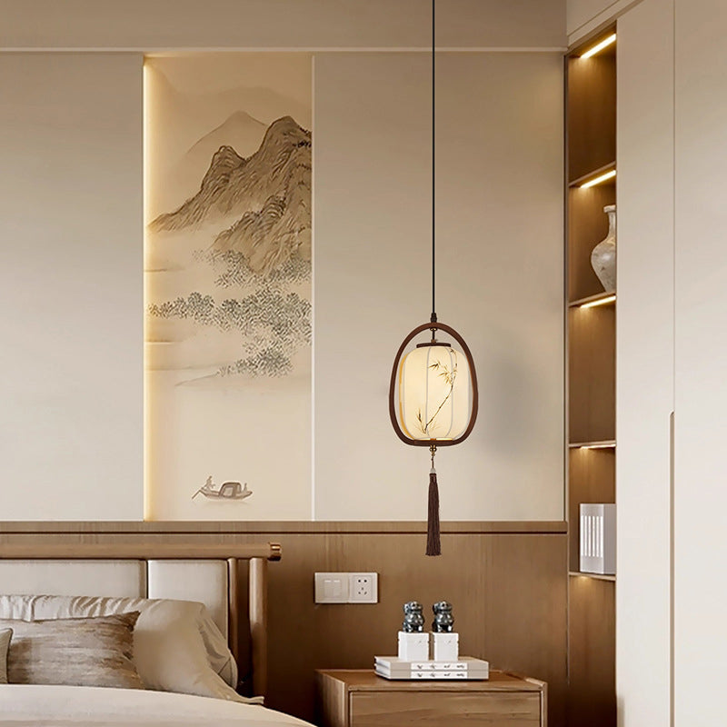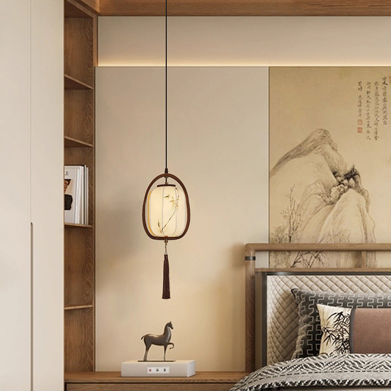 Traditional Chinese Oval Lantern Ash Wood Fabric Hardware 1-Light Pendant Light For Living Room