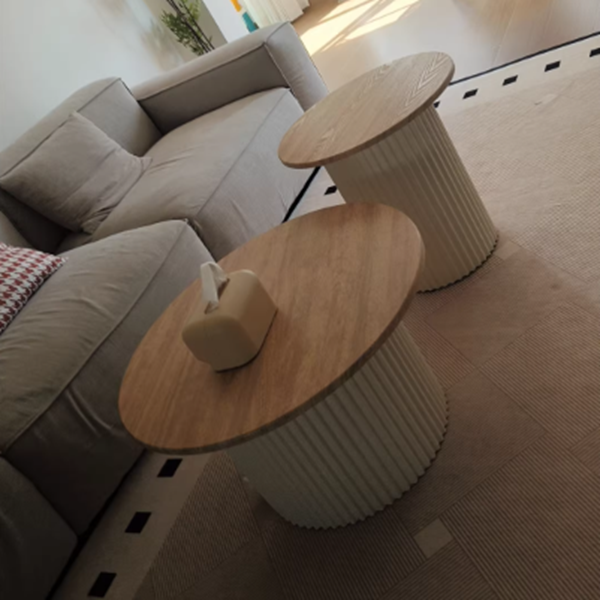 This modern minimalist coffee table combines eco board construction with a stainless steel frame, featuring a textured round column silhouette and soft oval form that suits compact living spaces. Designed with a two-tier layout that integrates hidden storage and a cozy cat nook, it offers smooth, rounded edges with finely polished corners, and is available in walnut, black, white, and natural wood finishes for versatile living room styling.