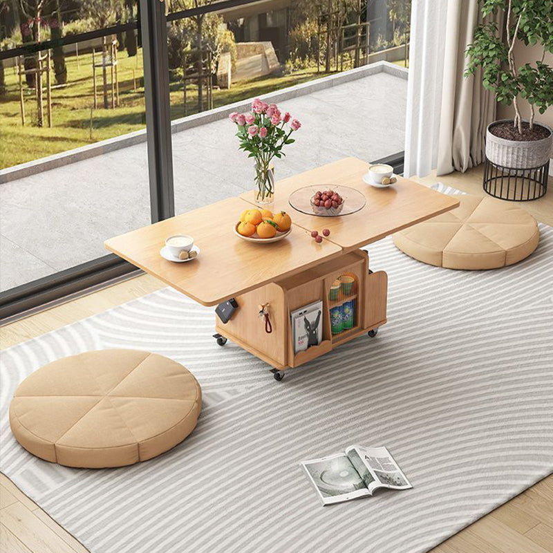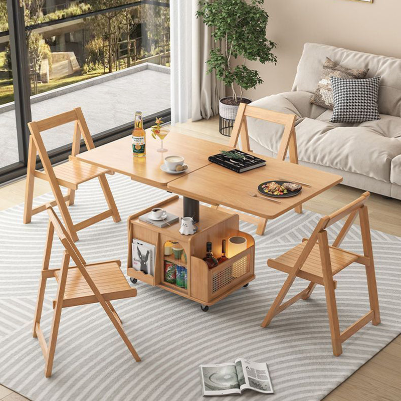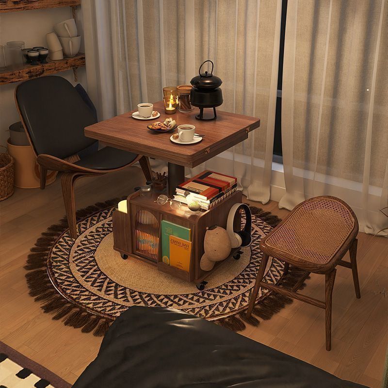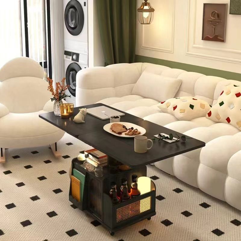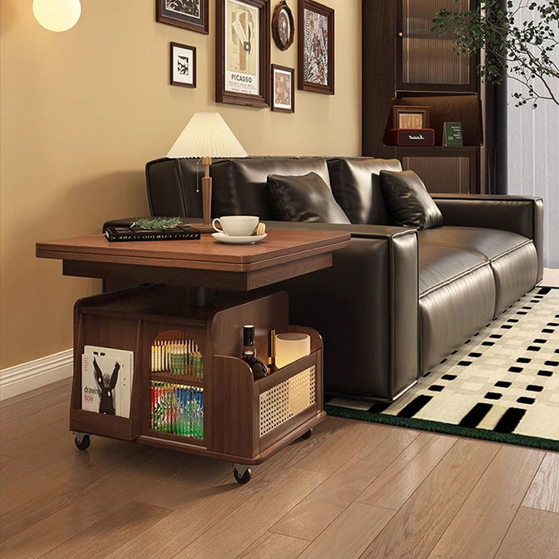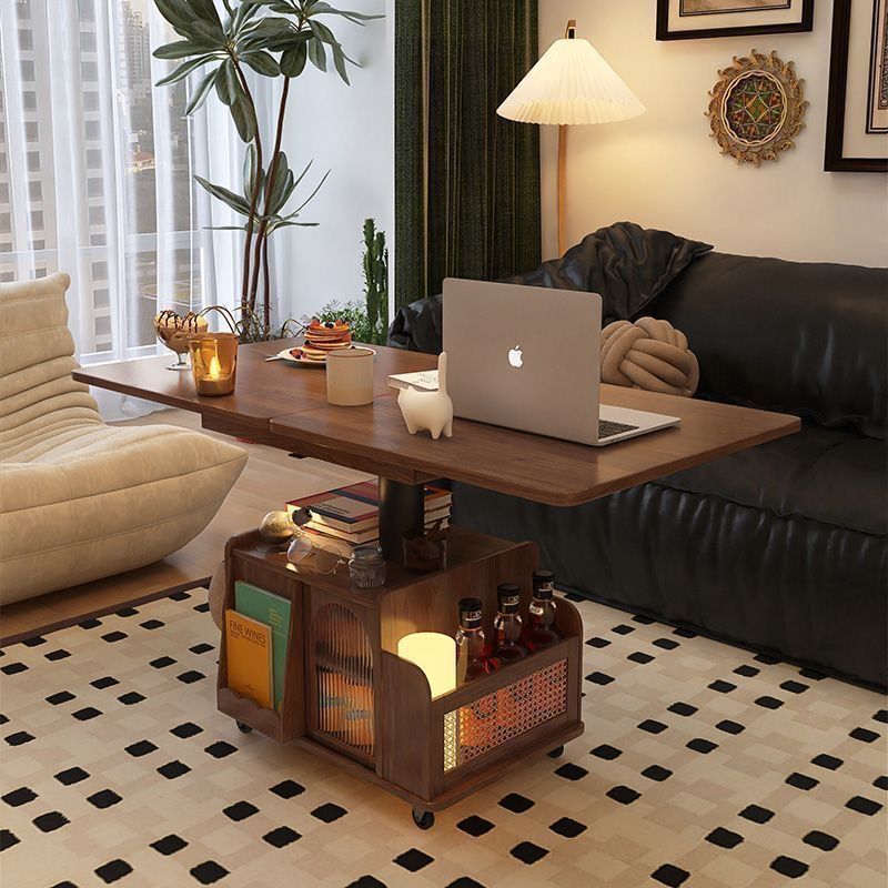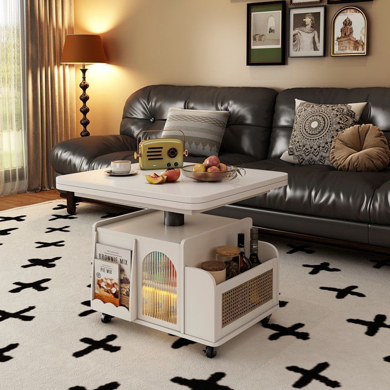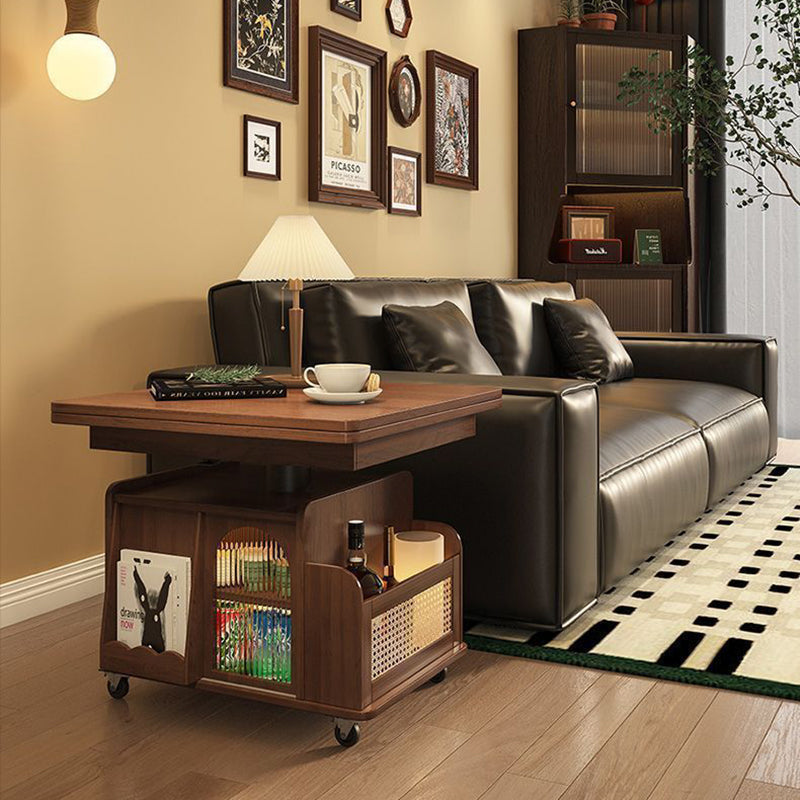 This traditional French side table features a mobile open rectangular design crafted from eco board, woven rattan, and tempered glass, combining elegance with everyday practicality. Designed with dual storage compartments, a wire-controlled pneumatic lift system for smooth height adjustment, and a protective raised edge to prevent items from falling, it is available in walnut, natural wood, white, and black finishes, making it ideal for versatile living room use.
