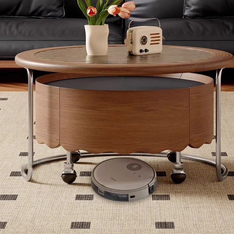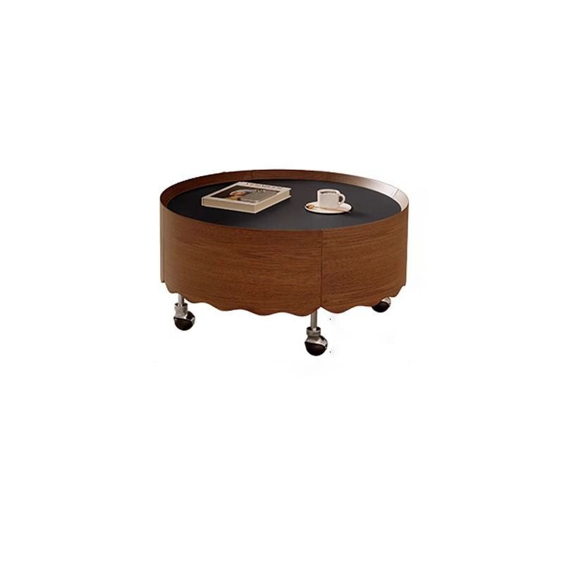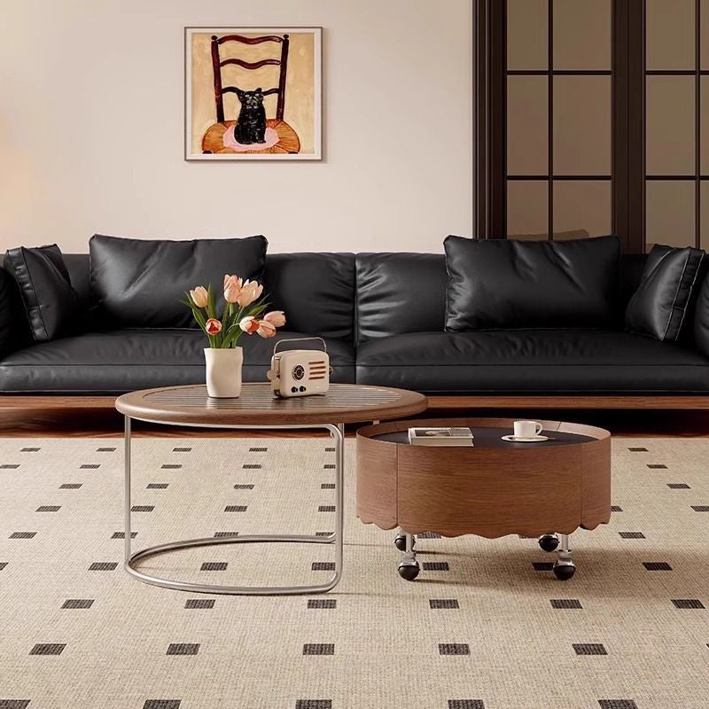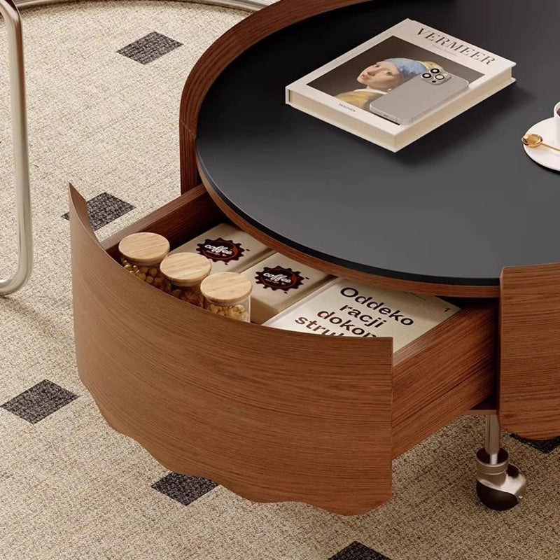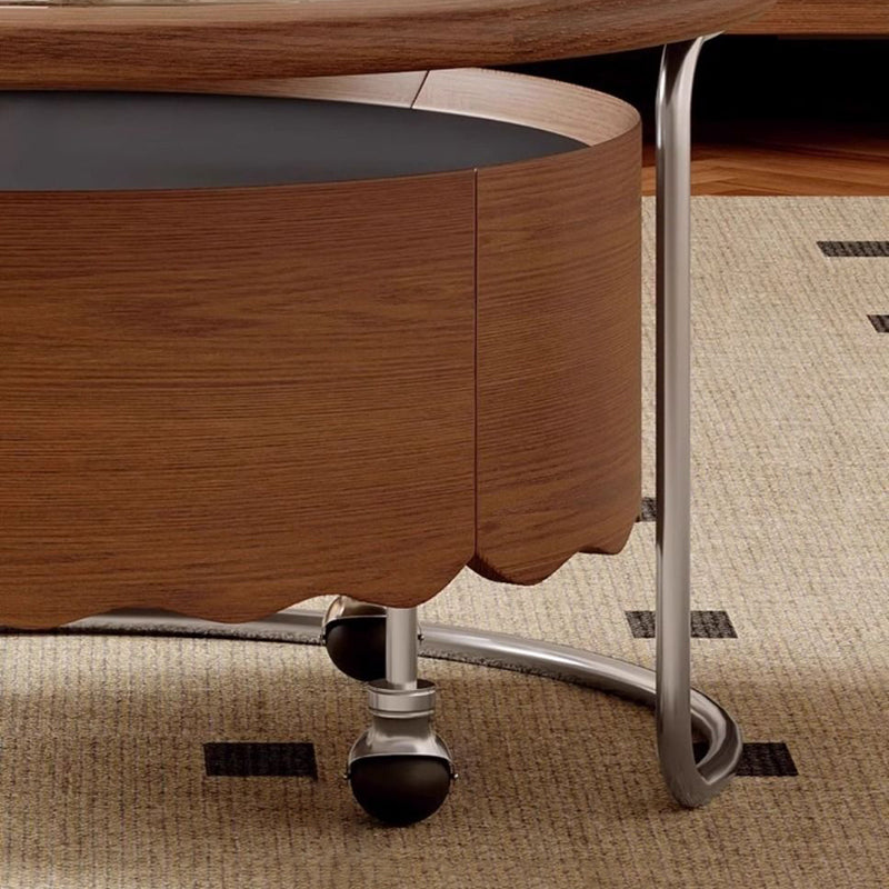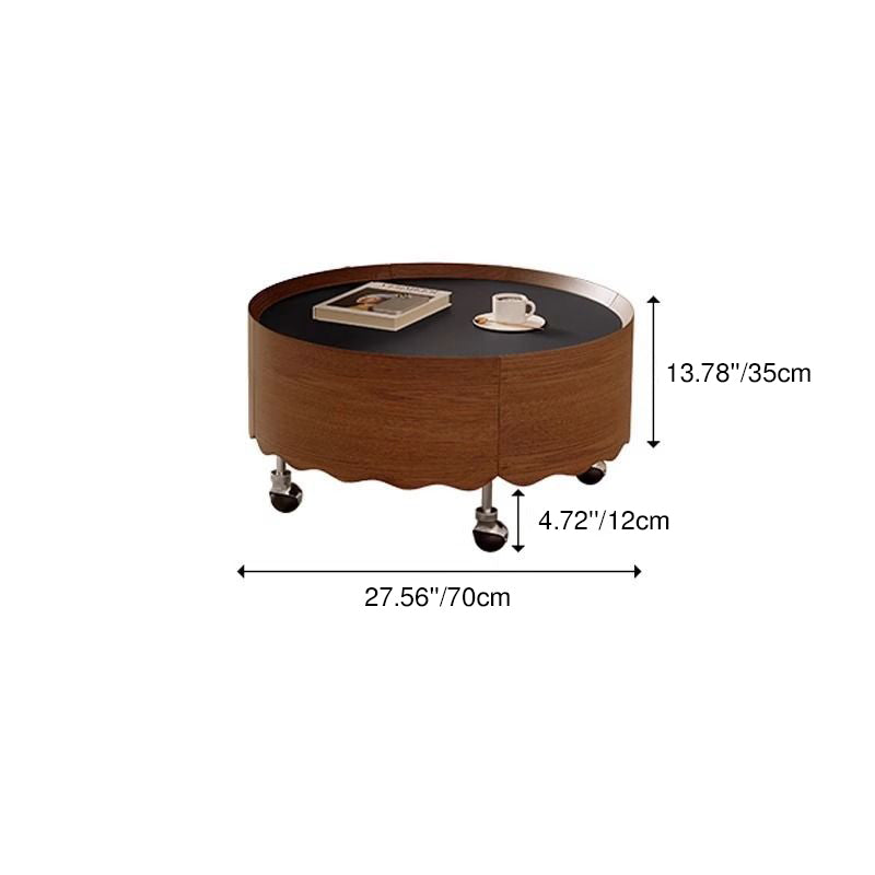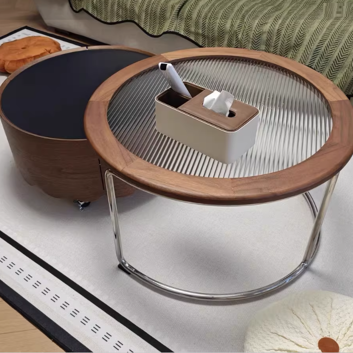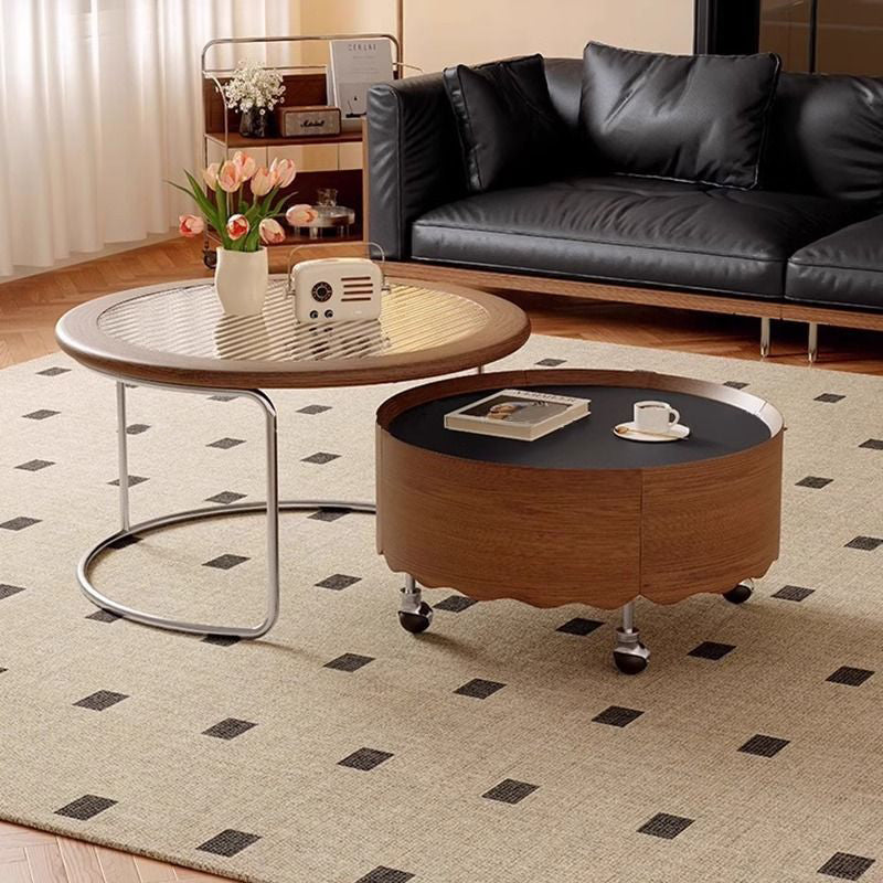 This Traditional French movable coffee table showcases a round curved silhouette crafted from sintered stone, glass, solid wood plywood, and stainless steel, ideal for refined living rooms and small apartments. Finished in black or walnut, it features adjustable length, 360° smooth-rolling caster wheels, and a stable, high load-bearing structure, delivering flexible mobility, easy care, and elegant vintage-inspired luxury without clutter.
